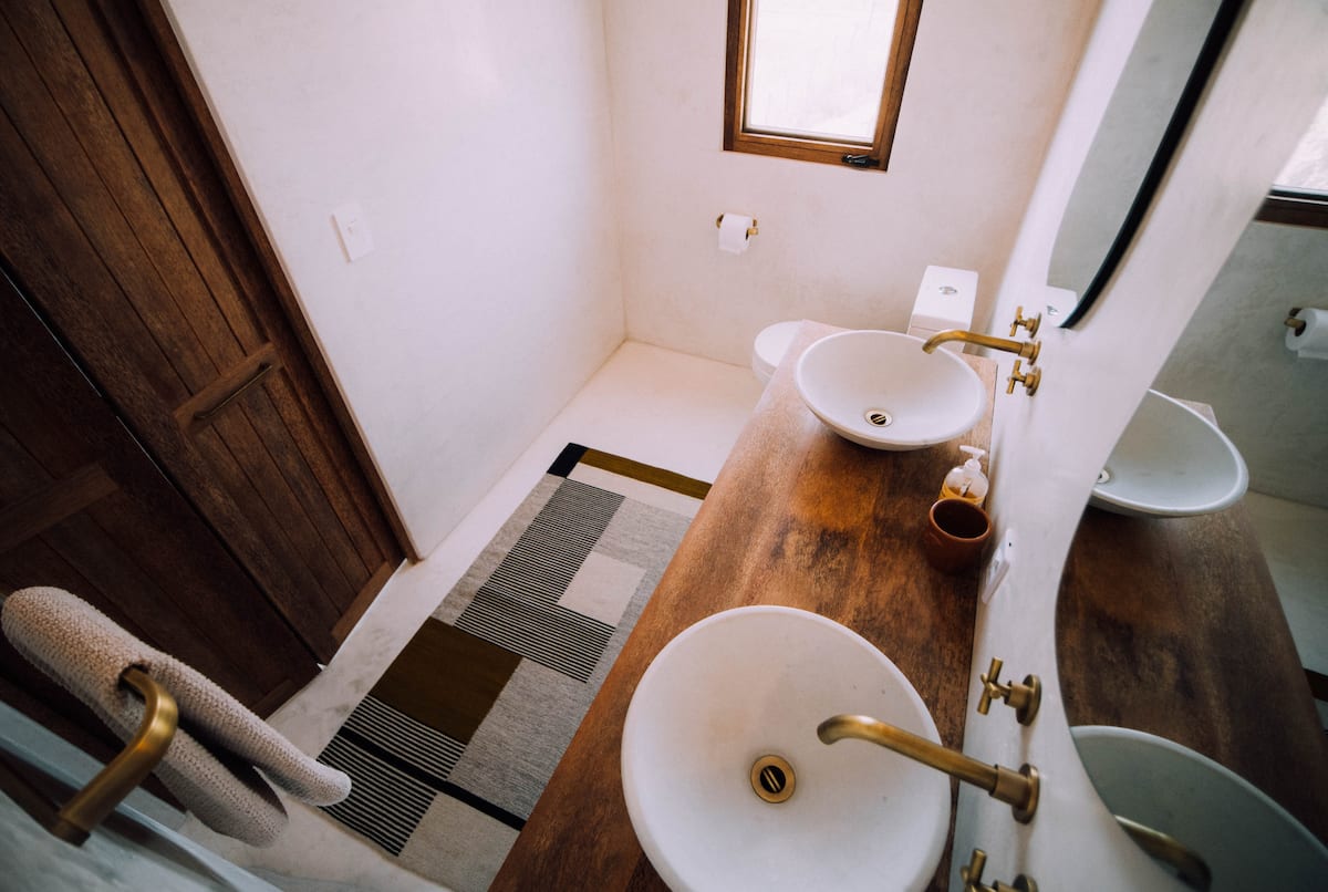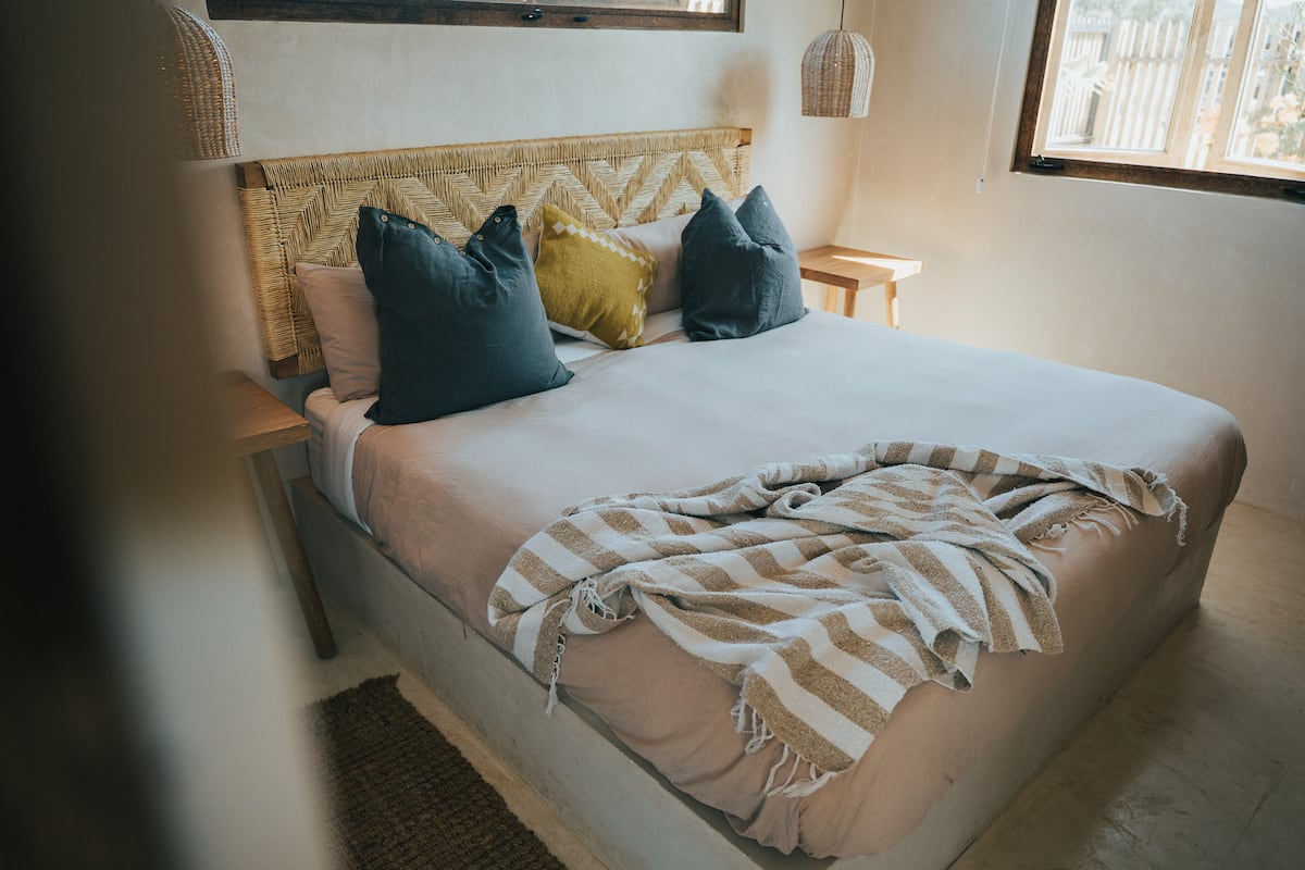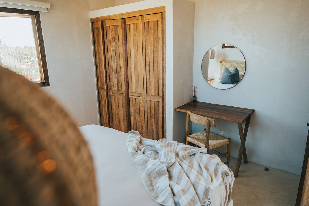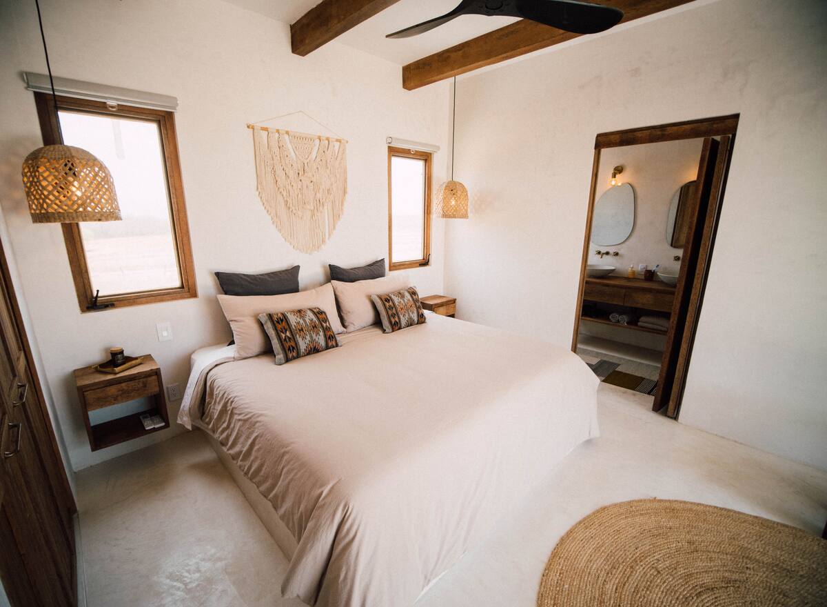 The open spaces are appointed with handcrafted wood furniture and ambient lighting, while natural breezes cool the palapa and bring relief from warm, humid days. Bedrooms are bright and comfortable, with screened windows and fans allowing guests to rest in fresh air. Air conditioning is available but operates on solar power, and therefore cannot run overnight. The villa’s thoughtful design and insulation ensure comfortable sleeping conditions through natural ventilation.