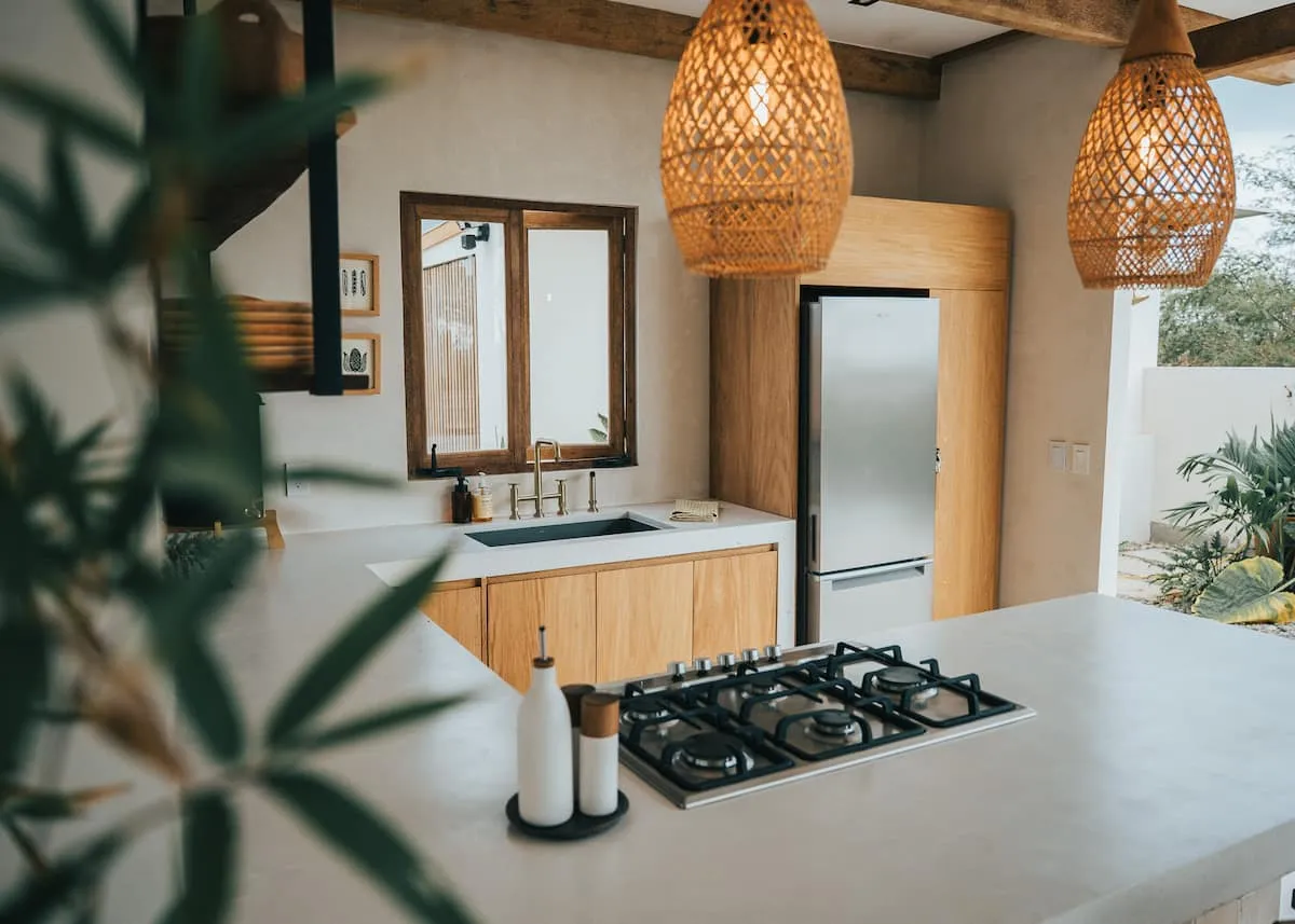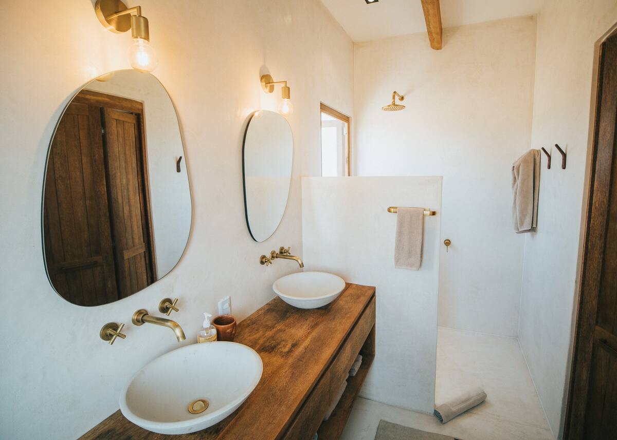 The villa features two fully equipped kitchens—one on the ground floor and one beneath the palapa—as well as two living and dining rooms, a pool, an outdoor shower, and spacious bedrooms with king beds, luxury cotton linens, and feather pillows. Every detail is designed to create a magical and restorative atmosphere.