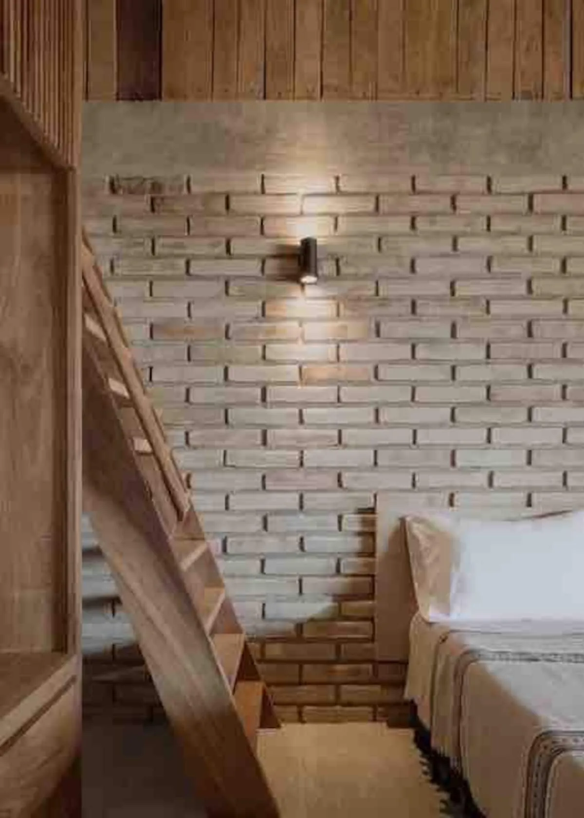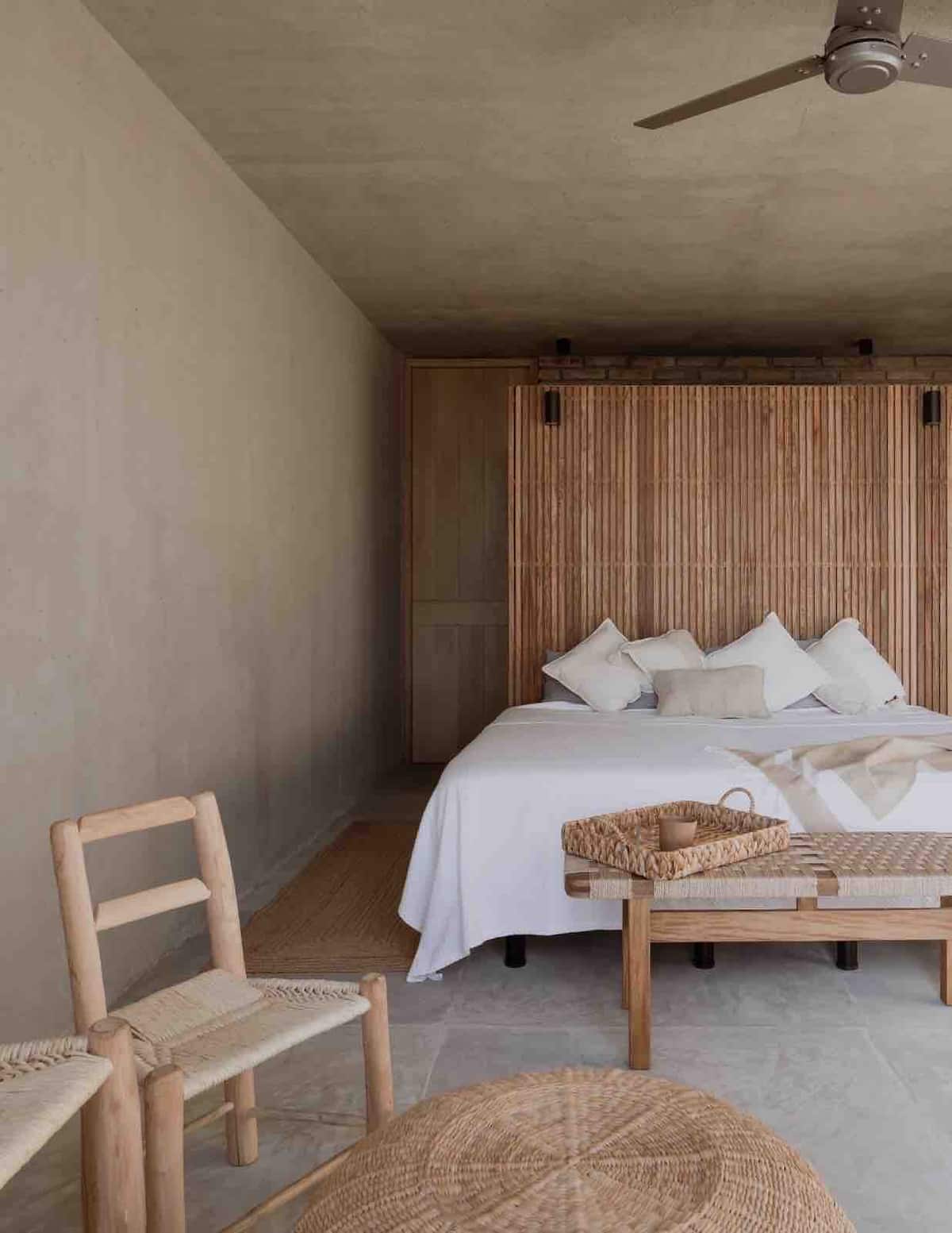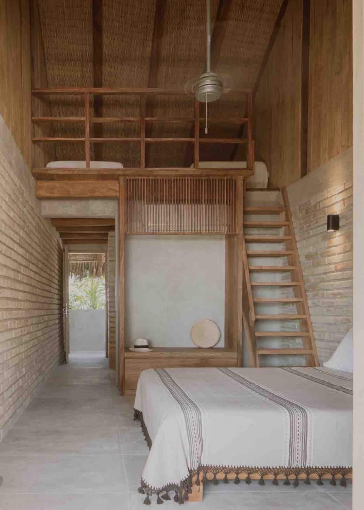 The home features three identical second-floor bedrooms, each with two single beds and a queen-size bed. These rooms, with double-height ceiling topped by palapa, have their own bathroom and a balcony with a sea view. Each room can accommodate up to 4 people.