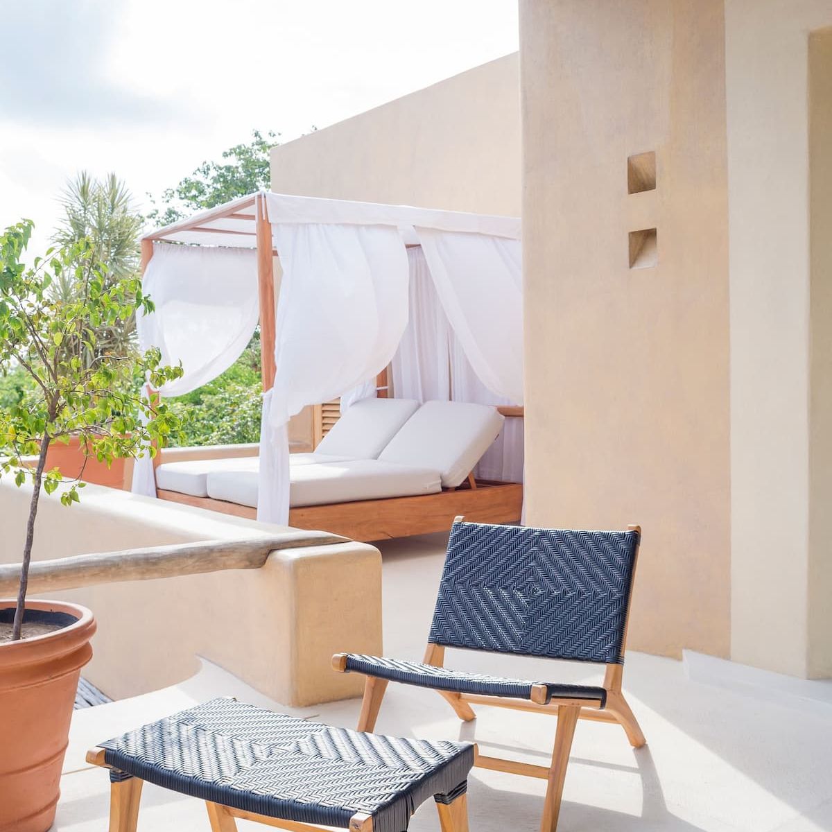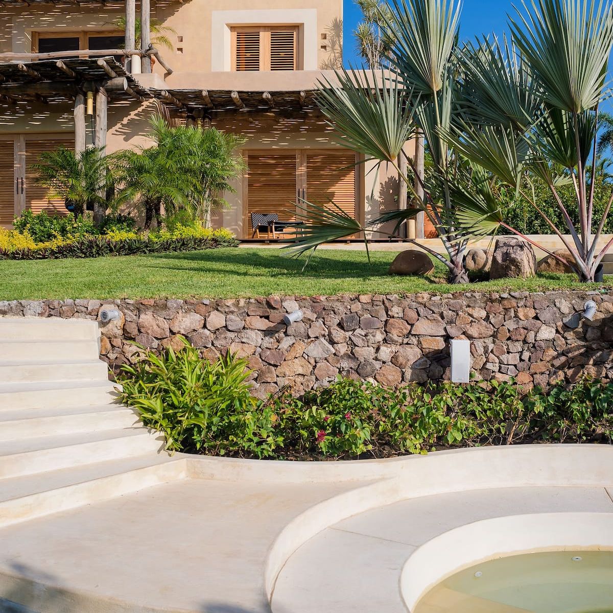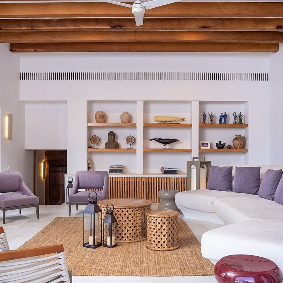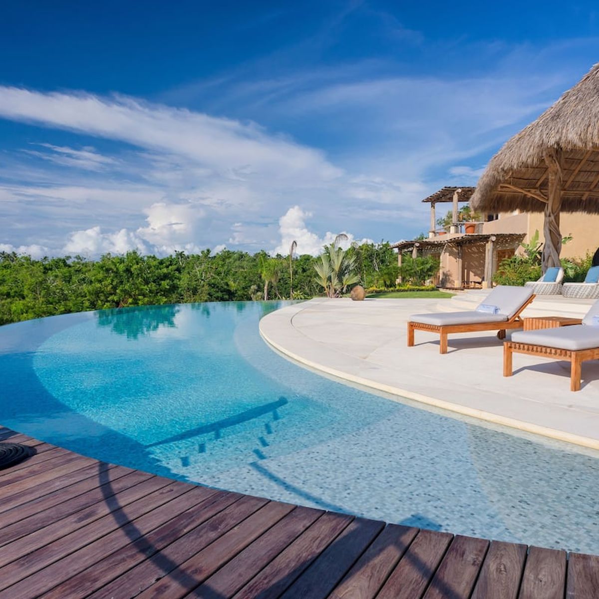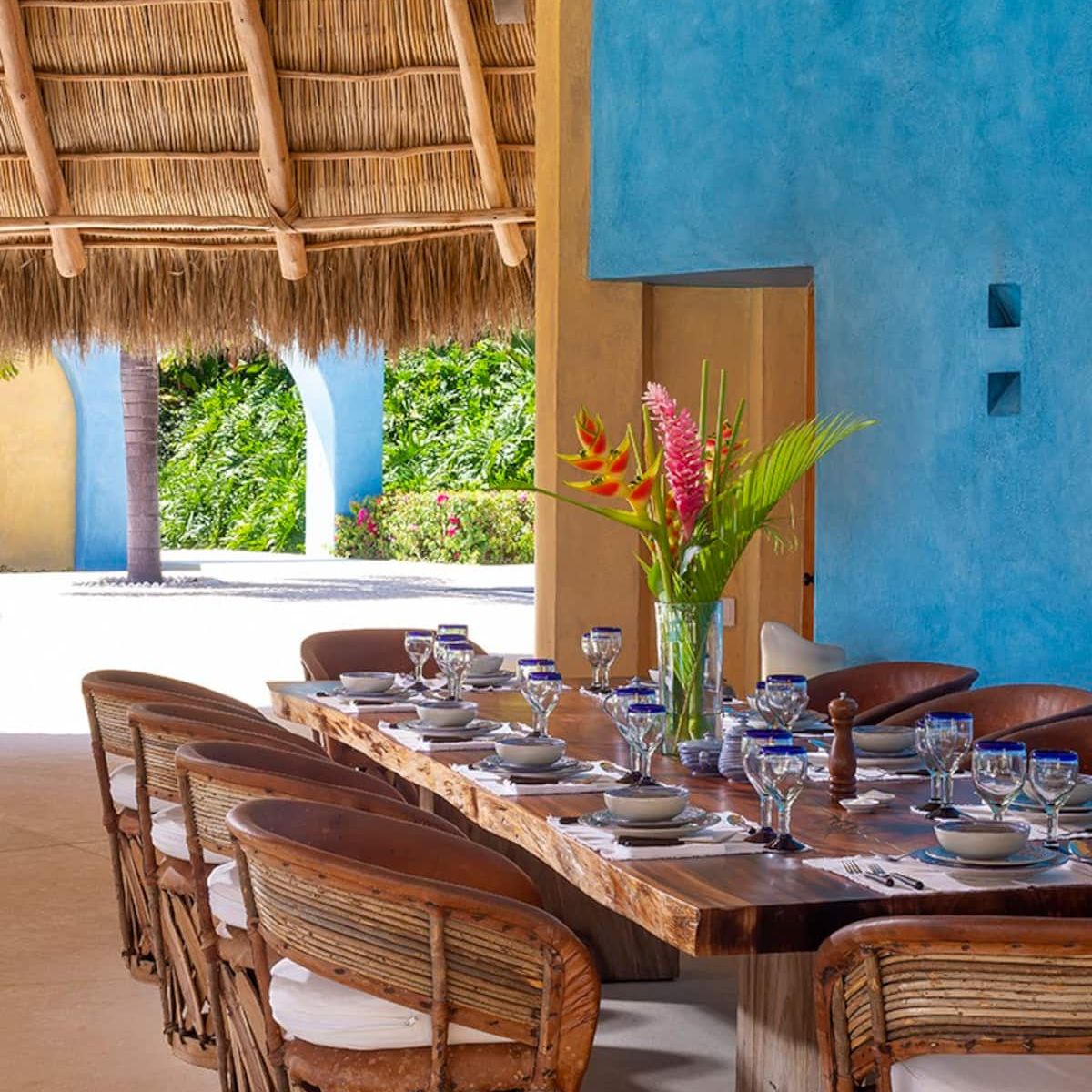 Offering absolute privacy, Casa Palomir is situated on a private road and is surrounded by lush tropical gardens. The spacious open living area under a palapa features sumptuous sofas, a dining table for twelve, and carefully selected artwork.