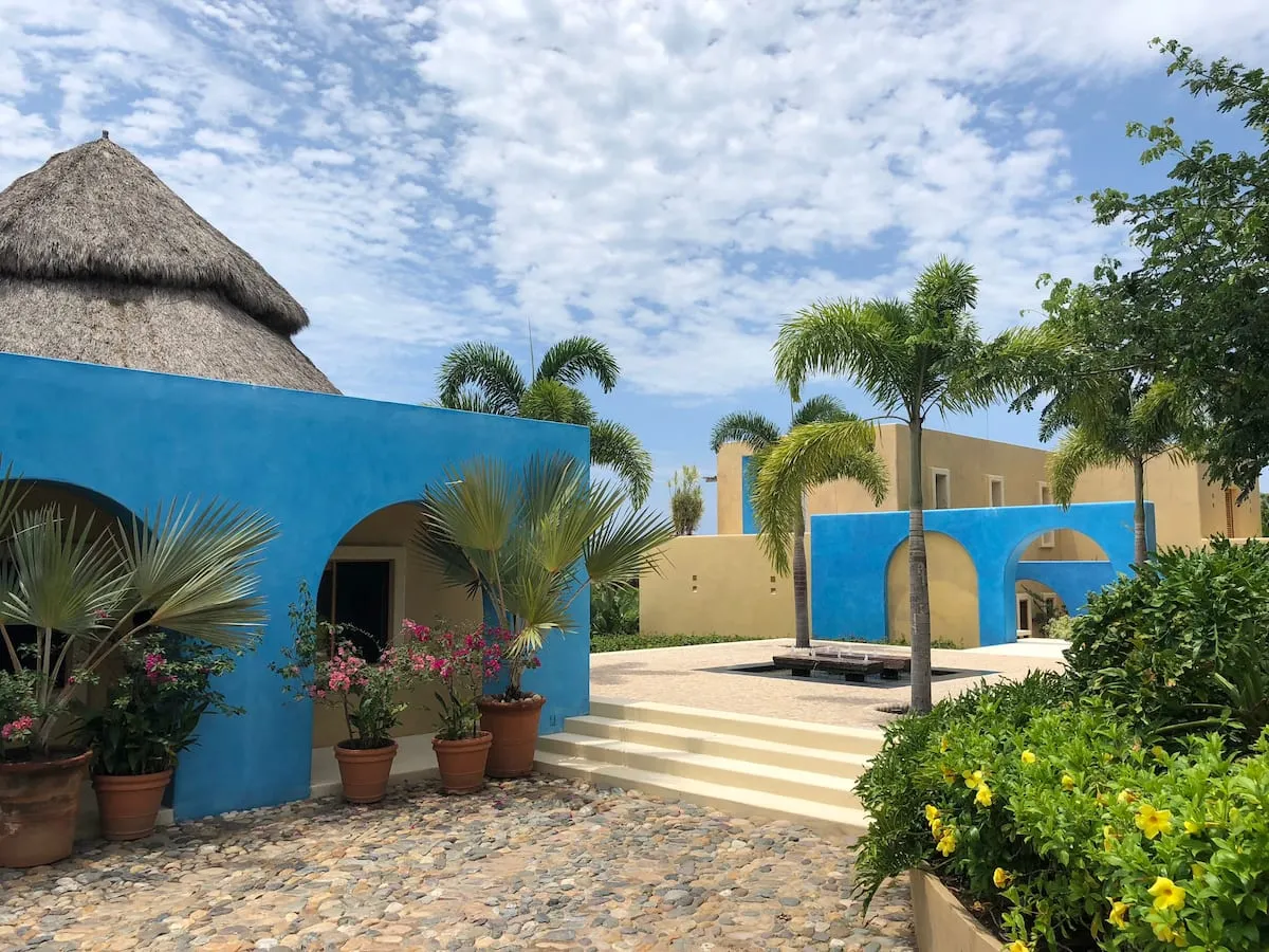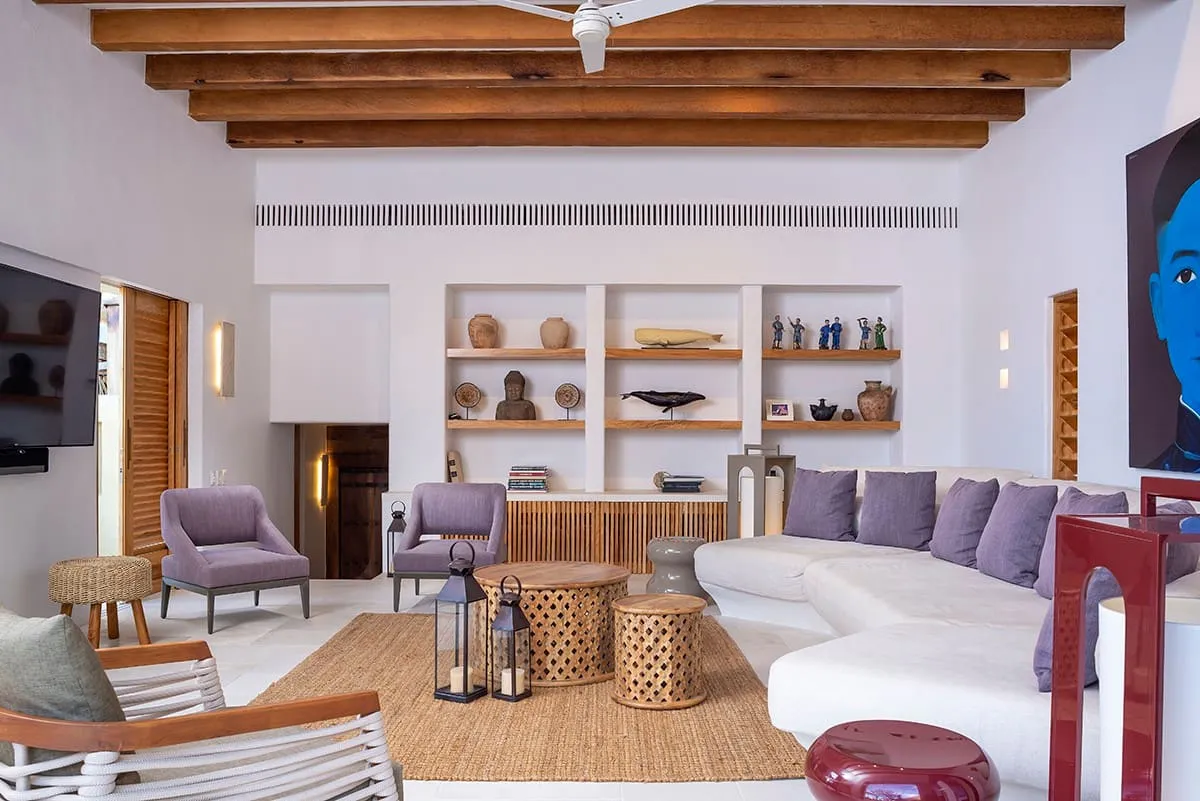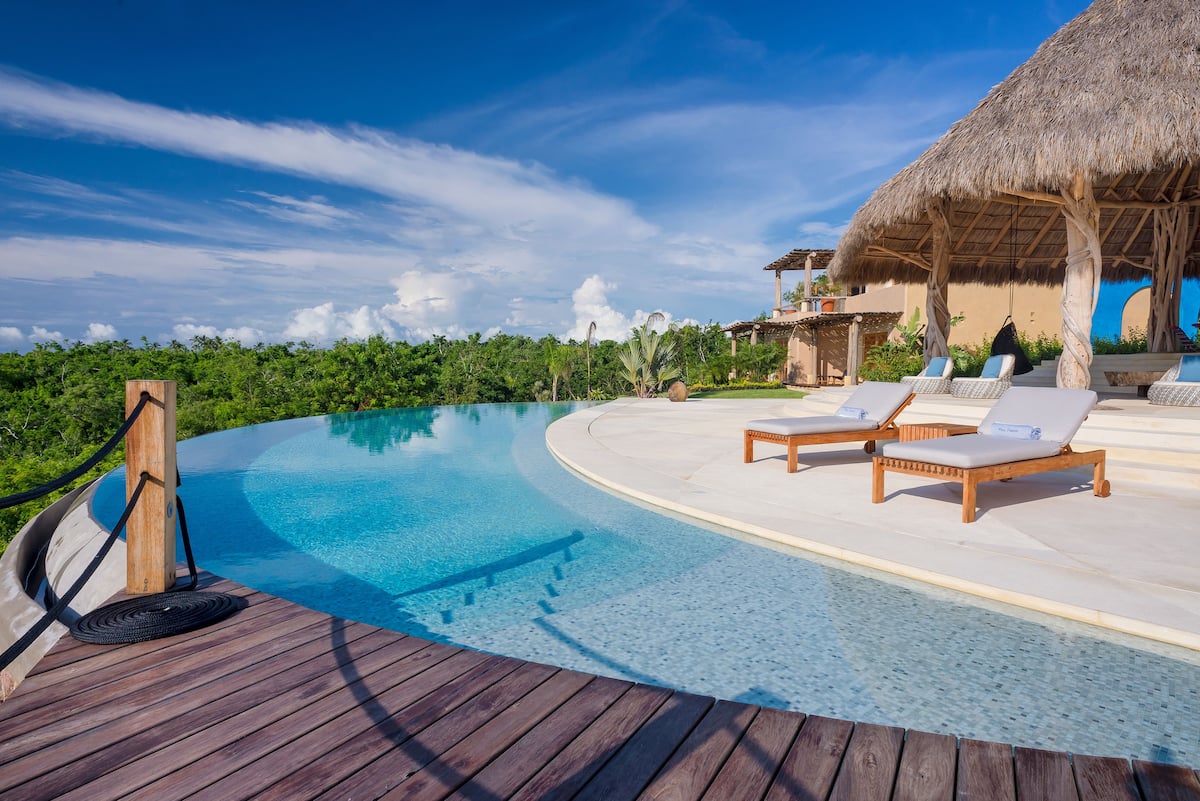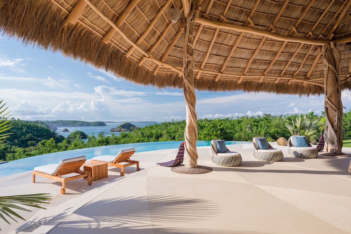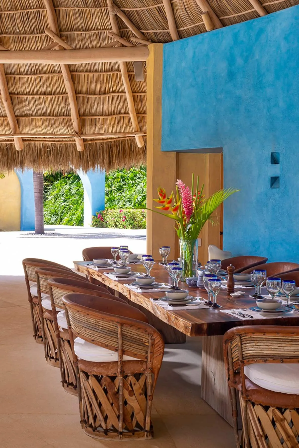 Offering absolute privacy, Casa Palomir is situated on a private road and is surrounded by lush tropical gardens. The spacious open living area under a palapa features sumptuous sofas, a dining table for twelve, and carefully selected artwork.