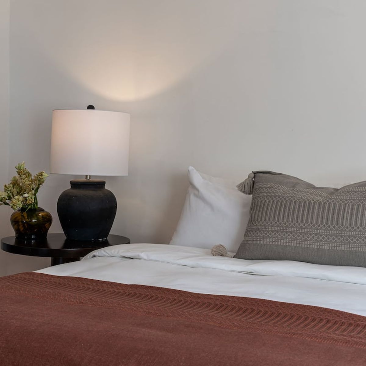The additional bedroom is located in the casita, a separate apartment just outside the main house in the courtyard, and offers extra privacy for additional guests. The casita includes a living room with TV, a small kitchen with an oven/stove and refrigerator for basic cooking needs, a full-size bathroom, and a loft-style bedroom with a king bed, air conditioning, and a small desk.