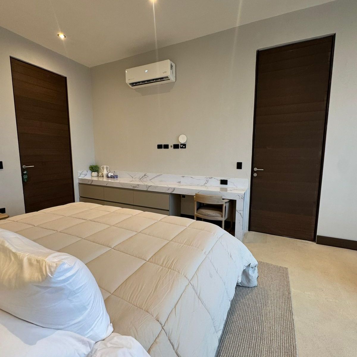The property features six spacious bedrooms and nine bathrooms, offering privacy and comfort for families or groups of up to twenty-two guests. Each bedroom is designed with sophistication and relaxation in mind, all equipped with air conditioning, en-suite bathrooms, and views of either the ocean or the lush gardens.