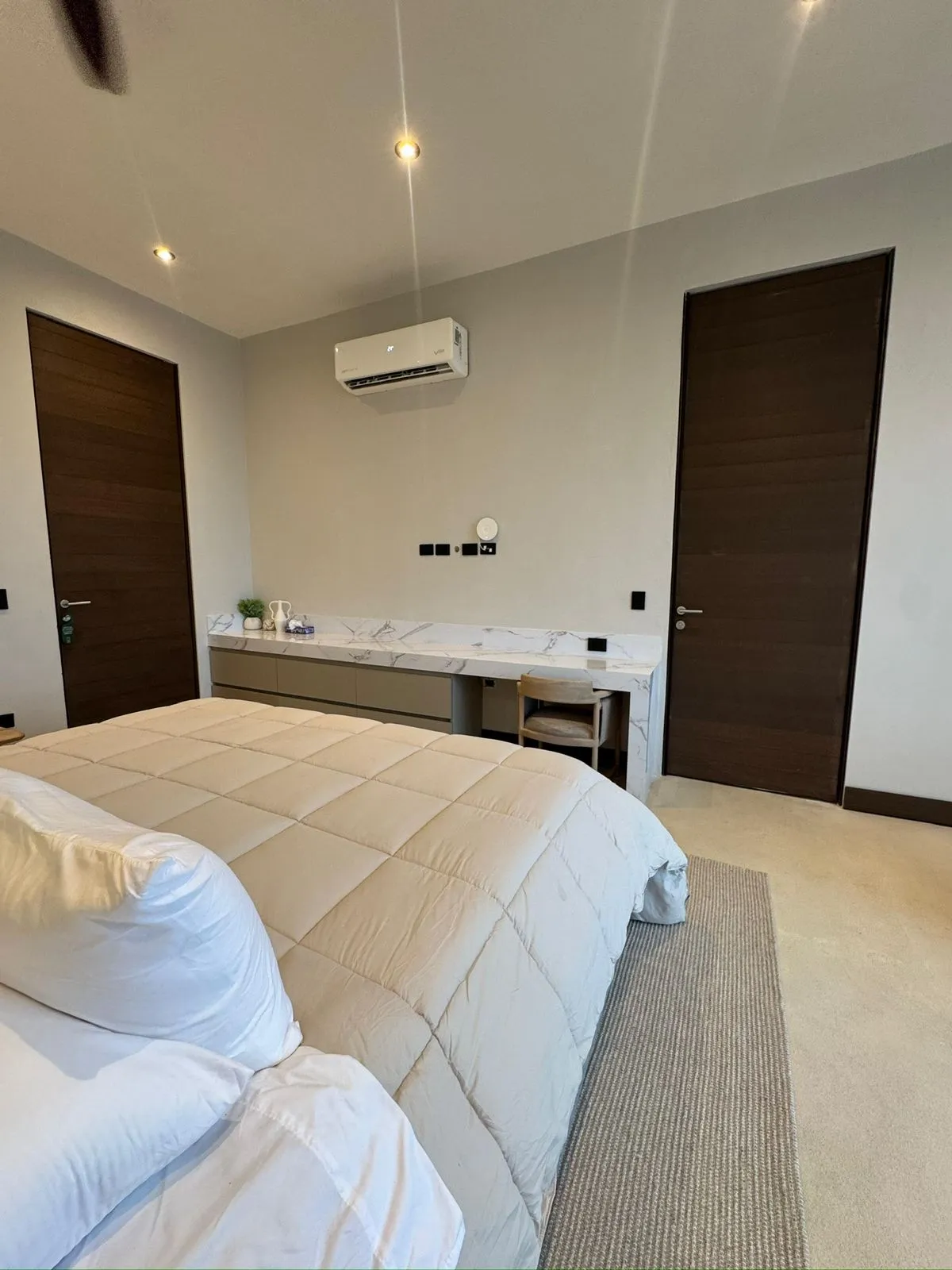 The property features six spacious bedrooms and nine bathrooms, offering privacy and comfort for families or groups of up to twenty-two guests. Each bedroom is designed with sophistication and relaxation in mind, all equipped with air conditioning, en-suite bathrooms, and views of either the ocean or the lush gardens.