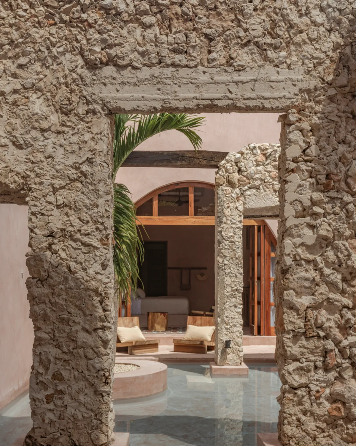 The design preserves the original pink facade and incorporates geometric forms and varying heights to create seamless indoor-outdoor connections. The house is divided into three sections: the front contains shared spaces like the foyer, kitchen, living, and dining areas; the back houses three private bedrooms. At the center, an ancient stone ruin of unknown age has been restored and surrounded by a shallow pool, serving as a focal point and social space.