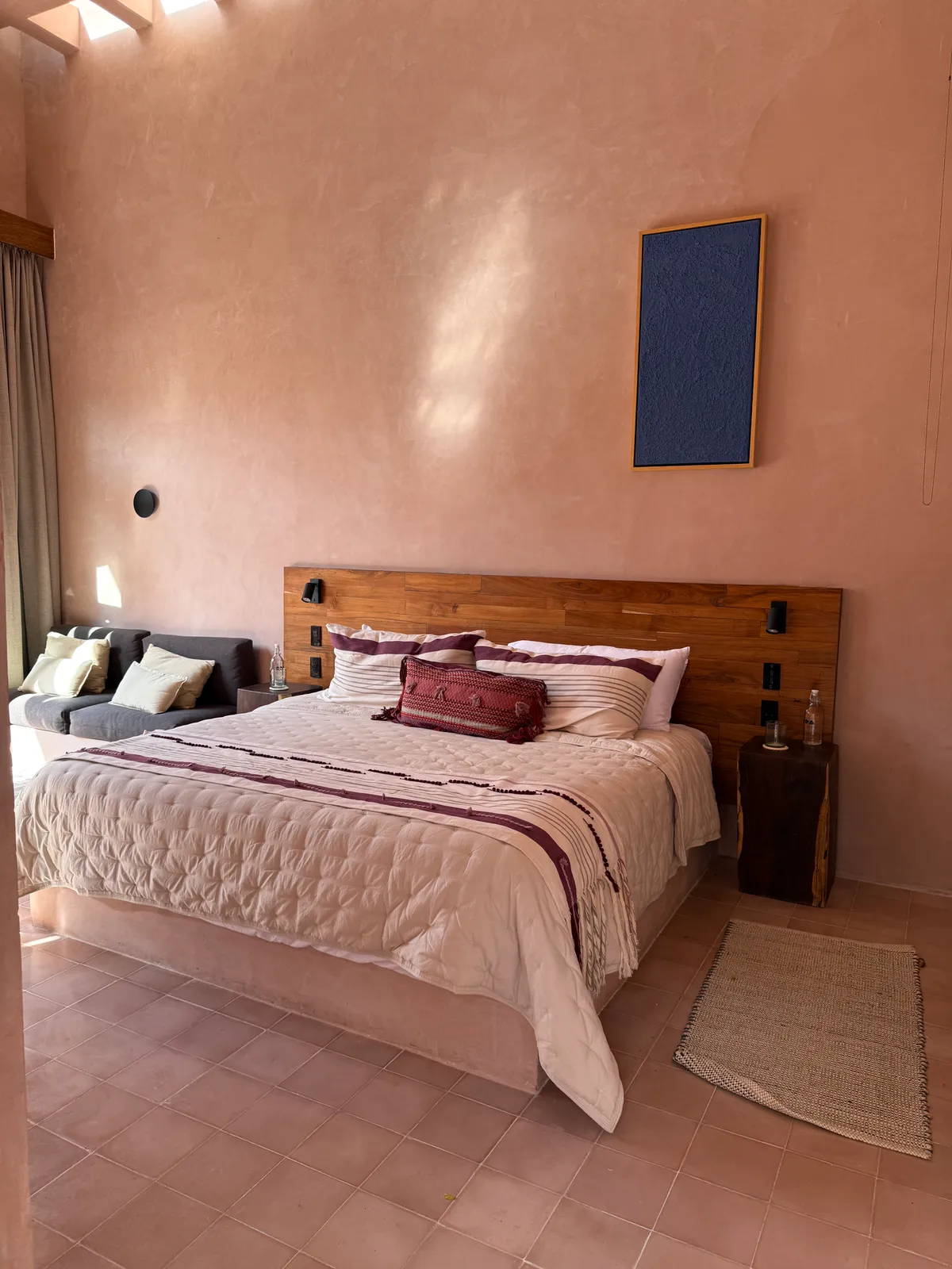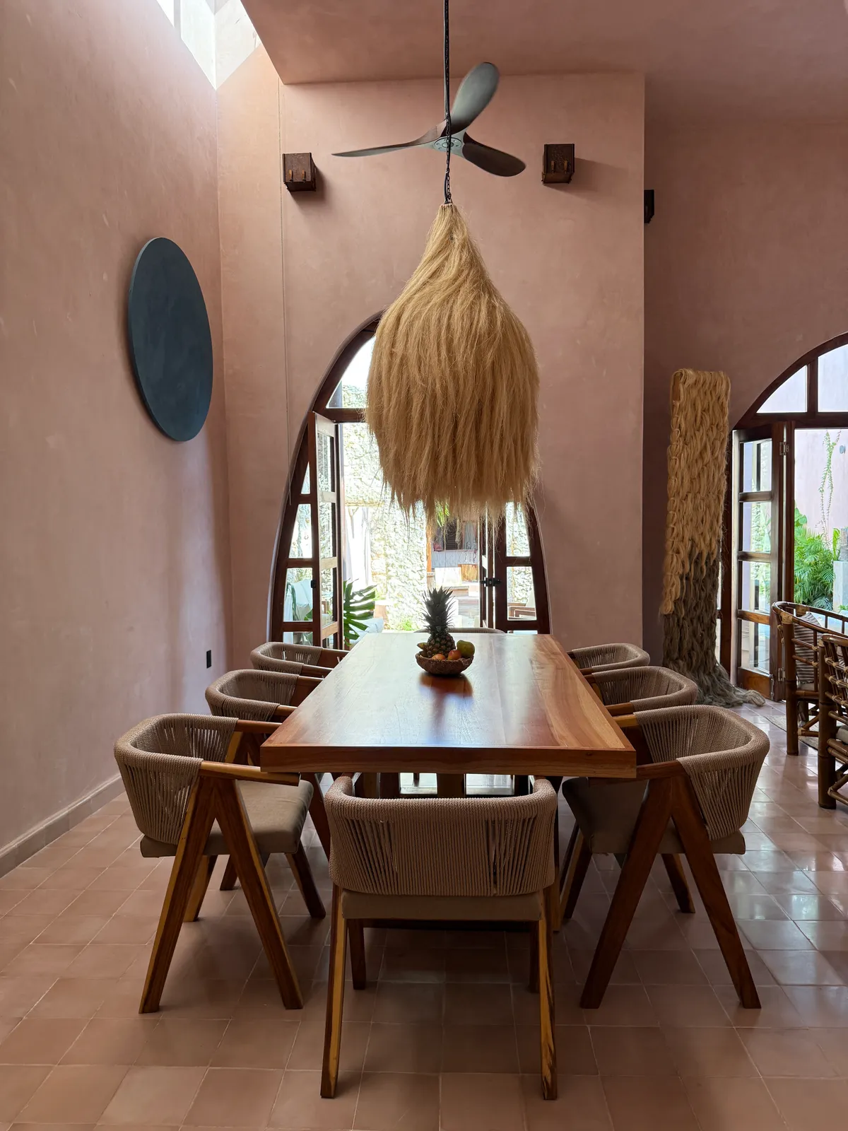 Materials and construction methods emphasize local tradition. Finishes include washed concrete, tzalam wood, pasta tiles, and chukum, a moisture-resistant Yucatecan finish. NKN Studio designed custom-built furniture and wooden sculptures by architect Miguel Tapia to complement the interiors. To manage the region’s heat, the house incorporates ventilation chimneys, elliptical arches for shade, and strategic landscaping with native plants. A large palm tree and a red cedar from the neighboring garden enhance the microclimate, ensuring natural cooling and integration with the surroundings.