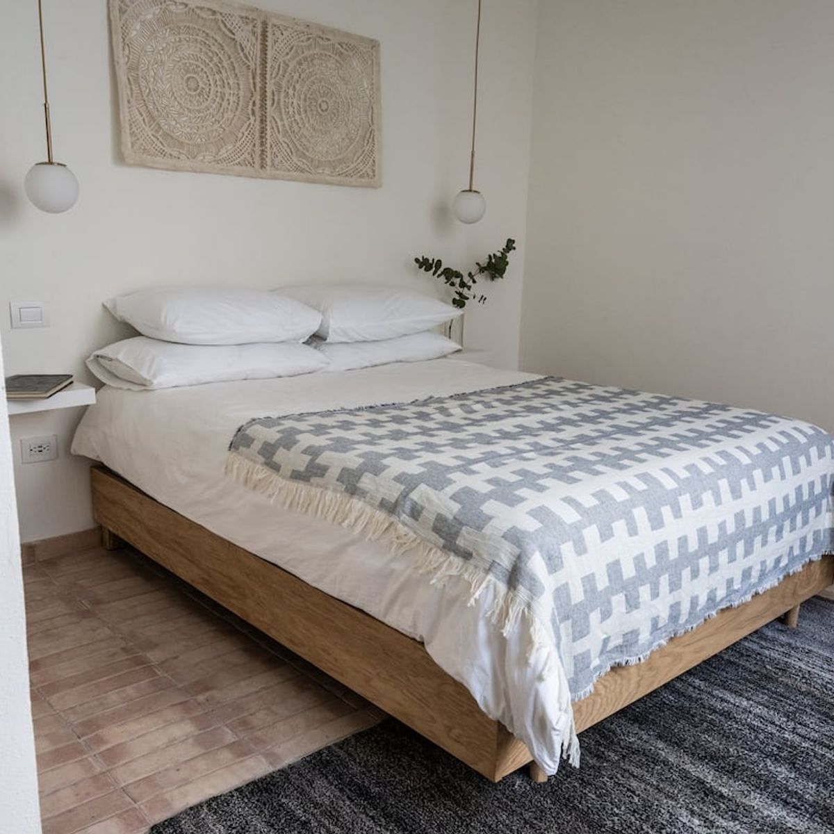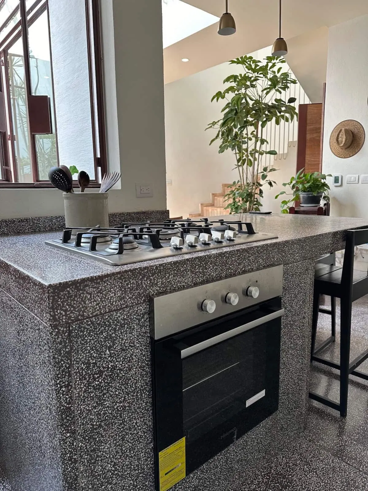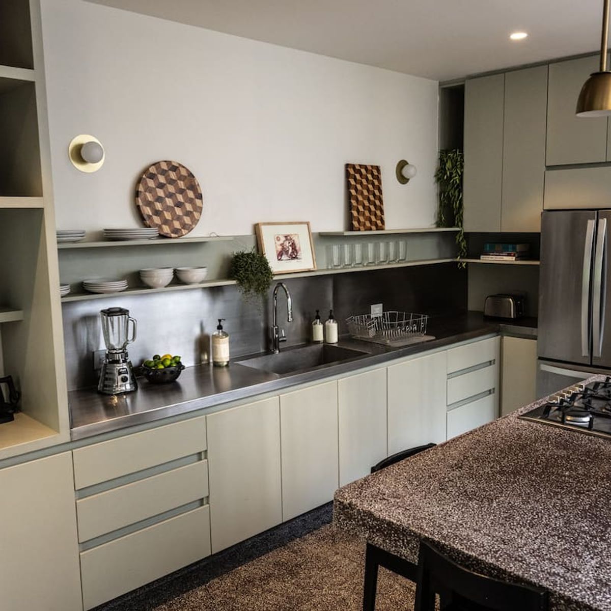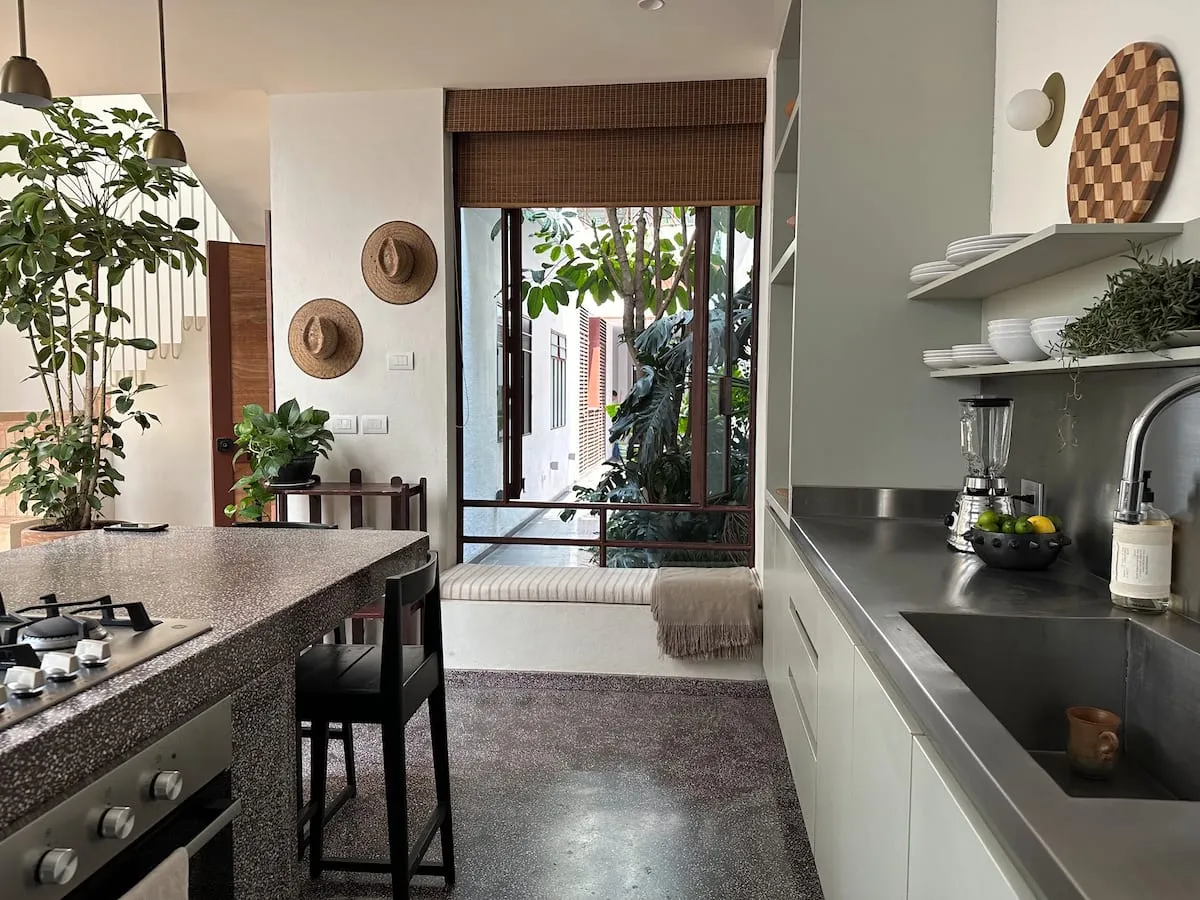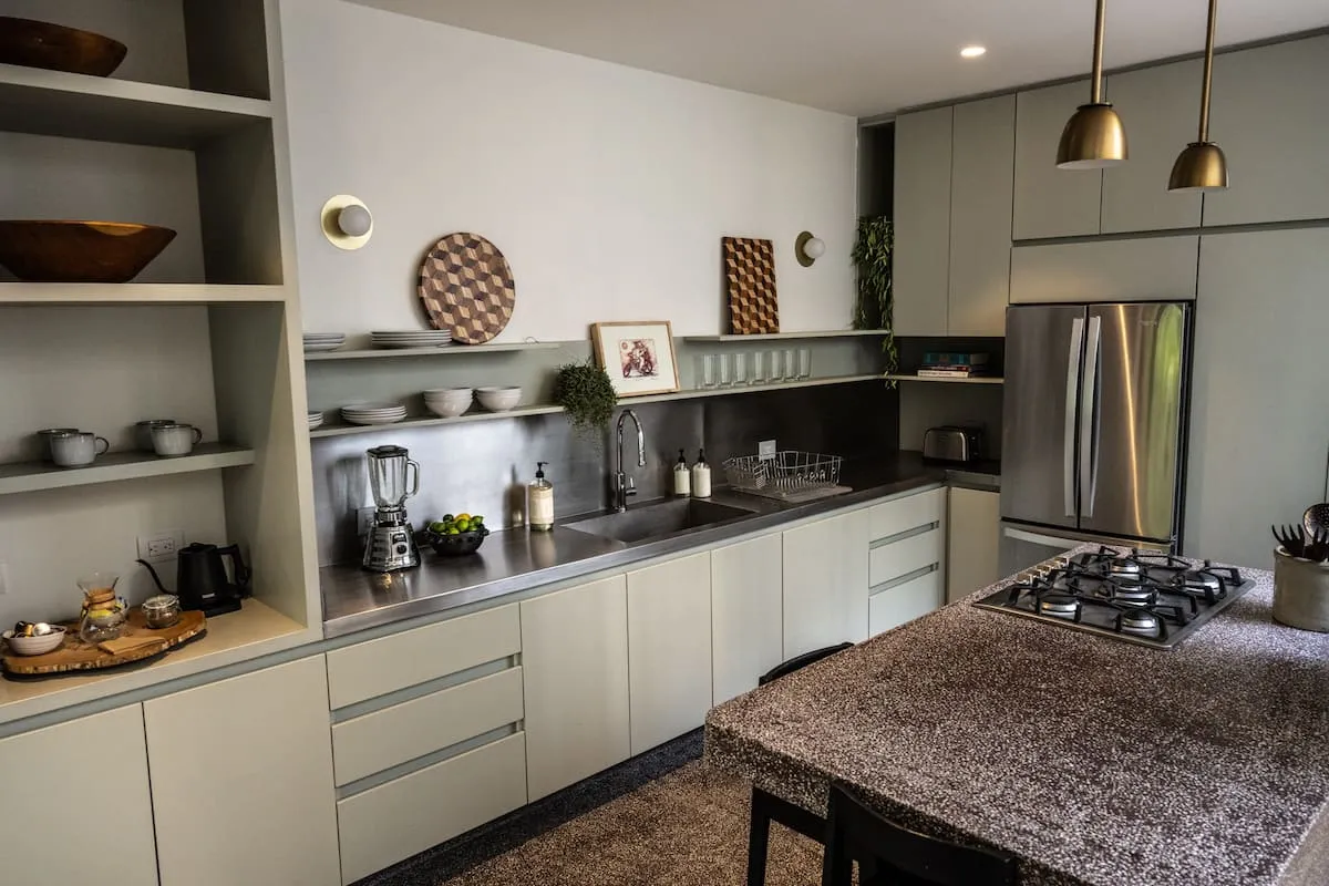 Fully equipped kitchen with all of the essentials and some extra goodies for you to enjoy! The kitchen includes a hand poured terrazzo island that would be a wonderful place to enjoy a cooking class or wind down with a beverage after a day of enjoying the city.