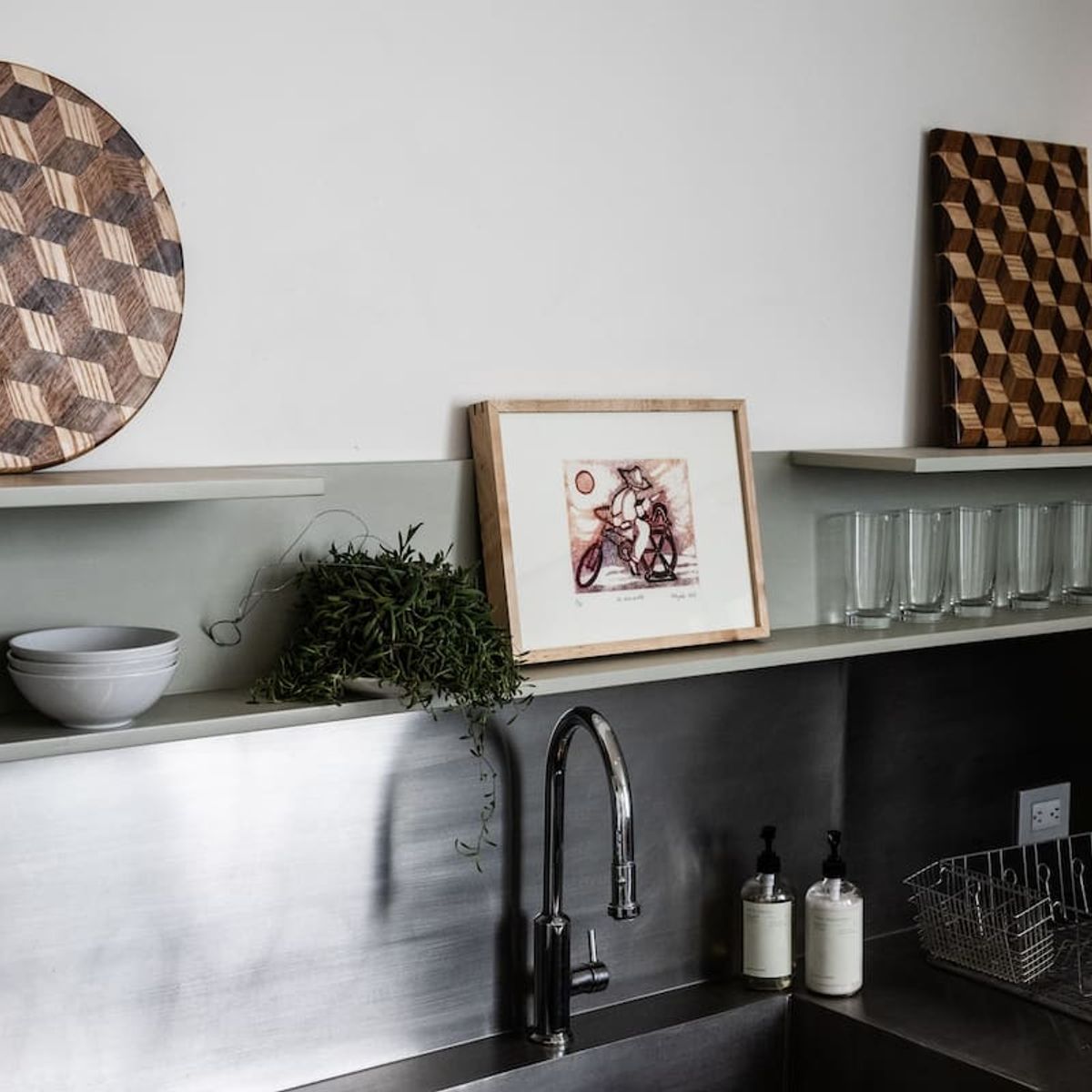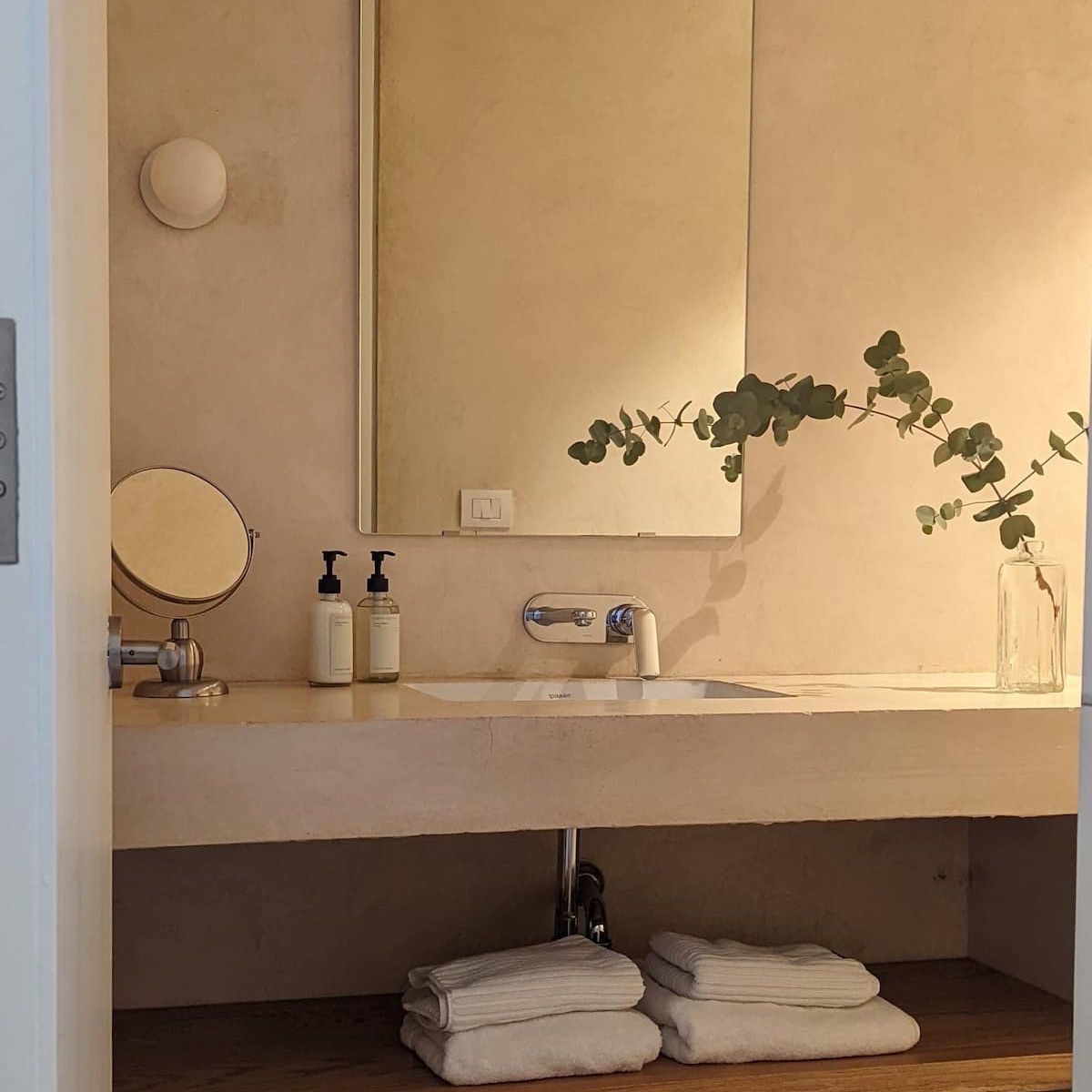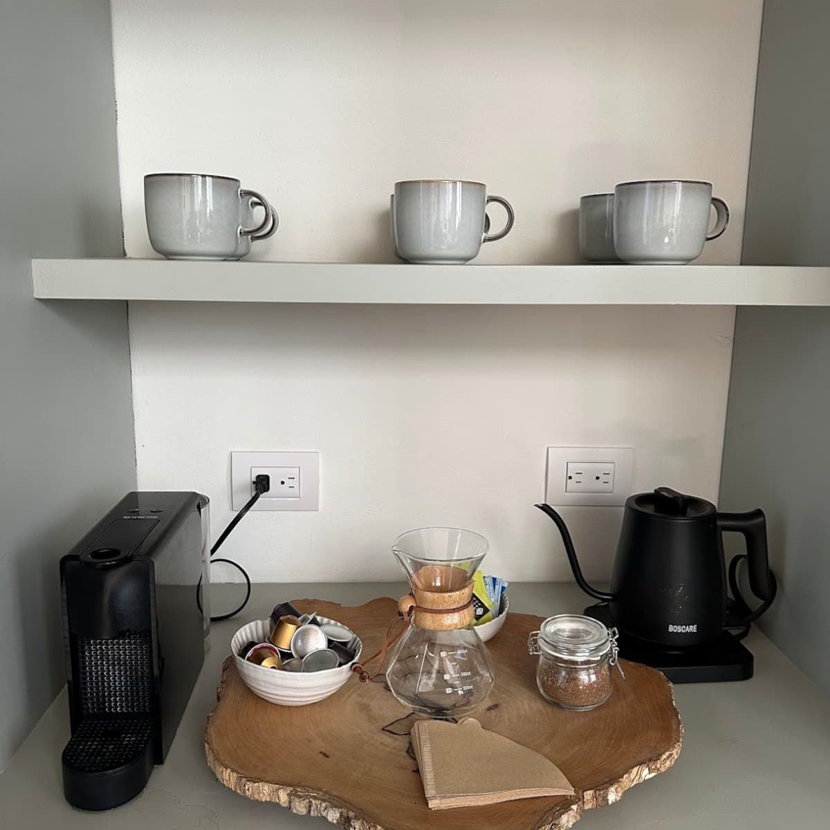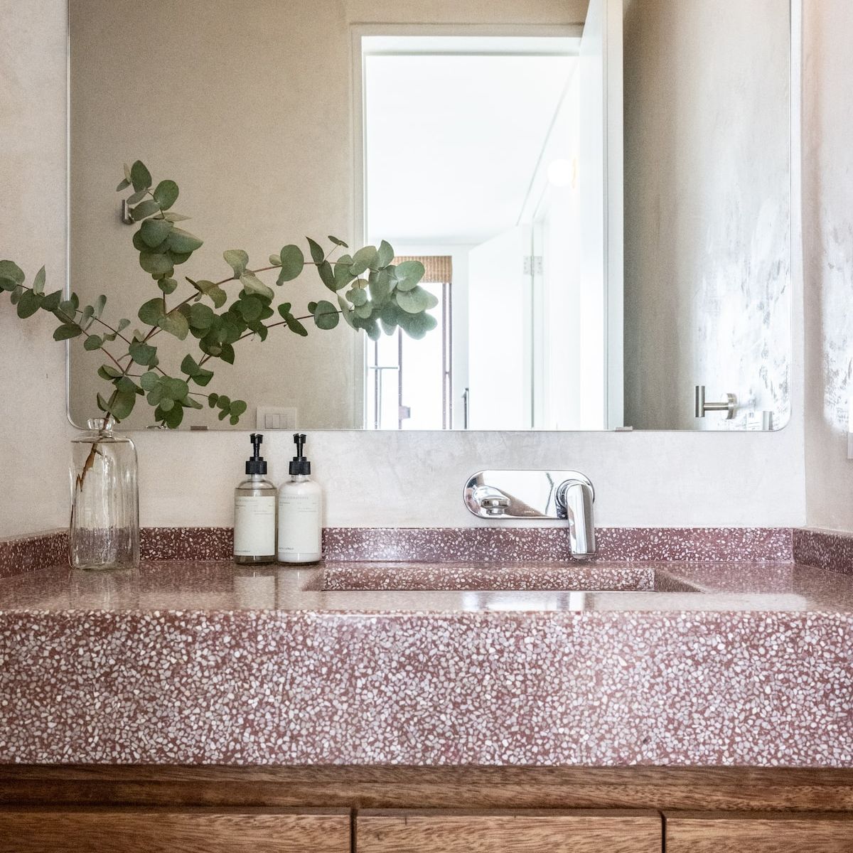 Fully equipped kitchen with all of the essentials and some extra goodies for you to enjoy! The kitchen includes a hand poured terrazzo island that would be a wonderful place to enjoy a cooking class or wind down with a beverage after a day of enjoying the city.