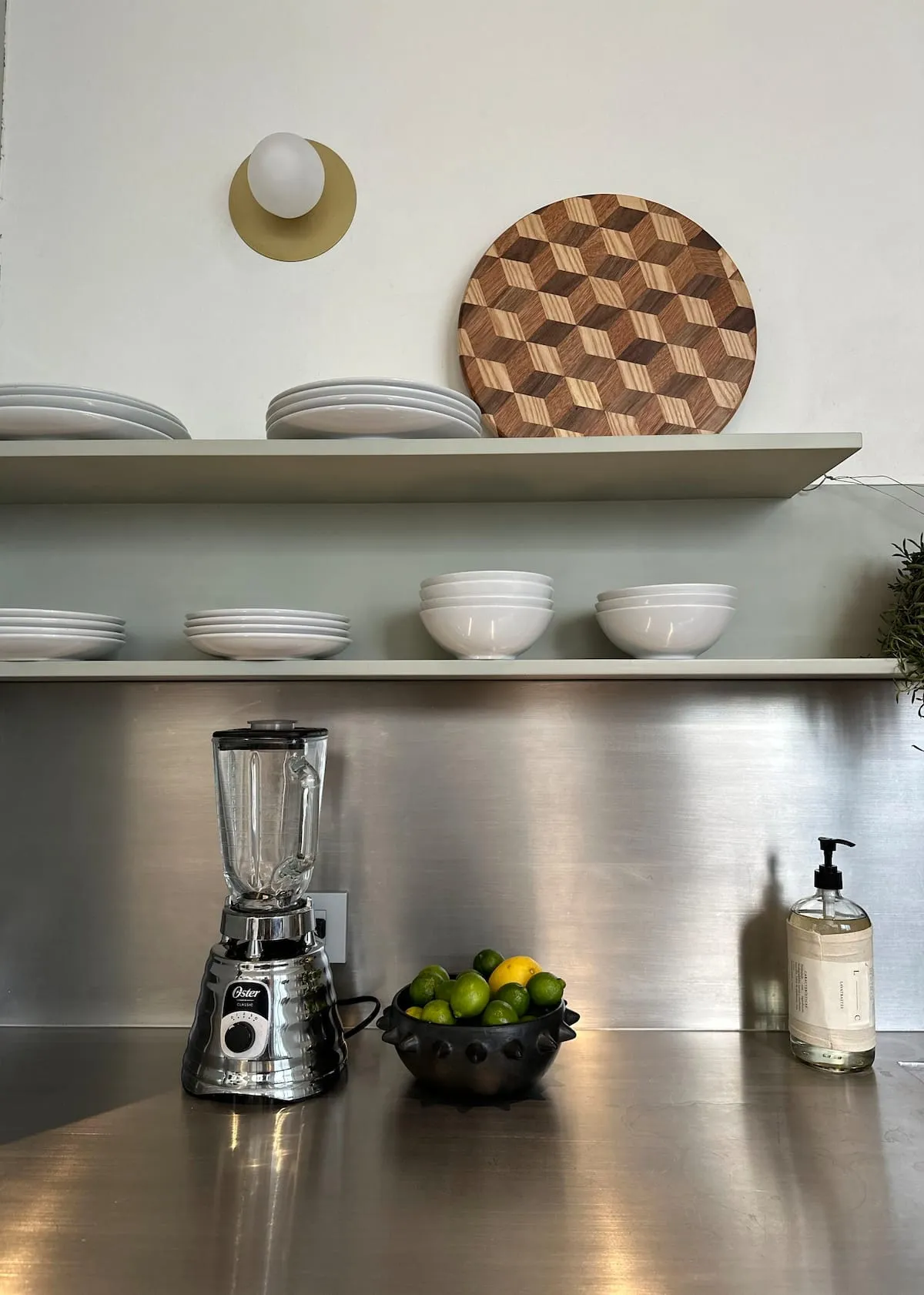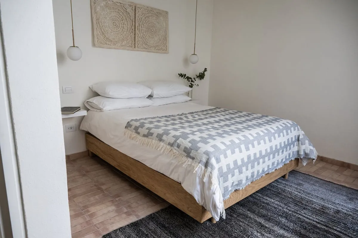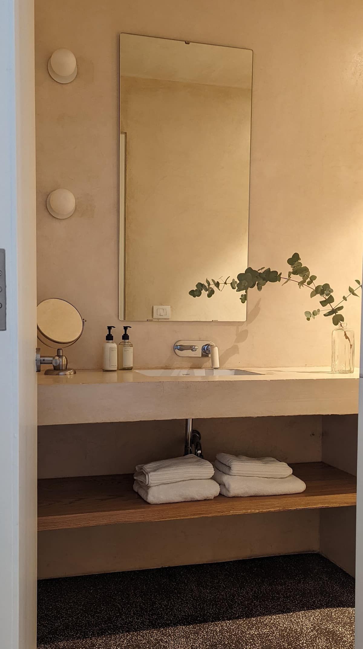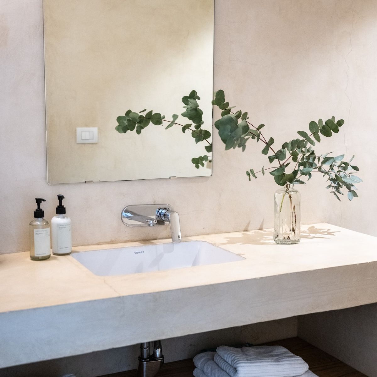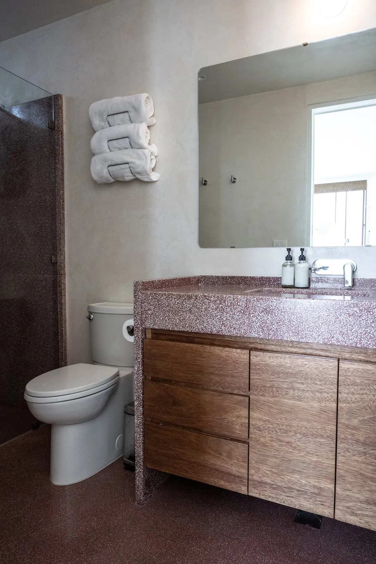 Fully equipped kitchen with all of the essentials and some extra goodies for you to enjoy! The kitchen includes a hand poured terrazzo island that would be a wonderful place to enjoy a cooking class or wind down with a beverage after a day of enjoying the city.