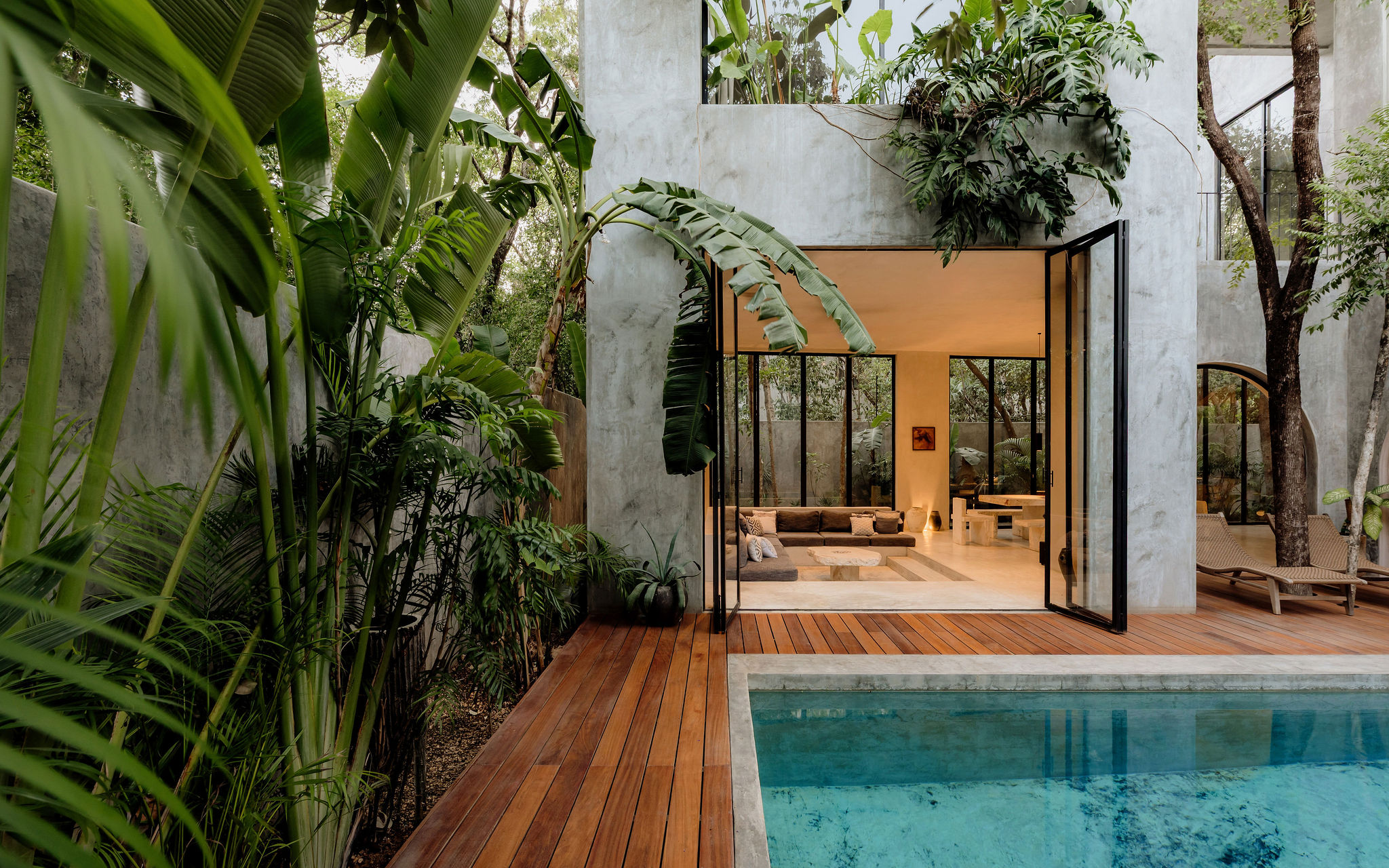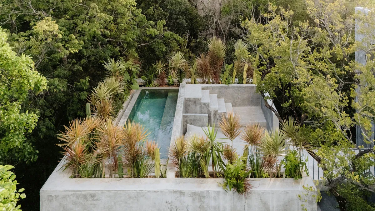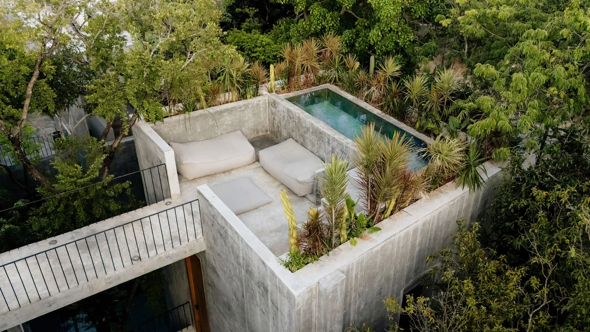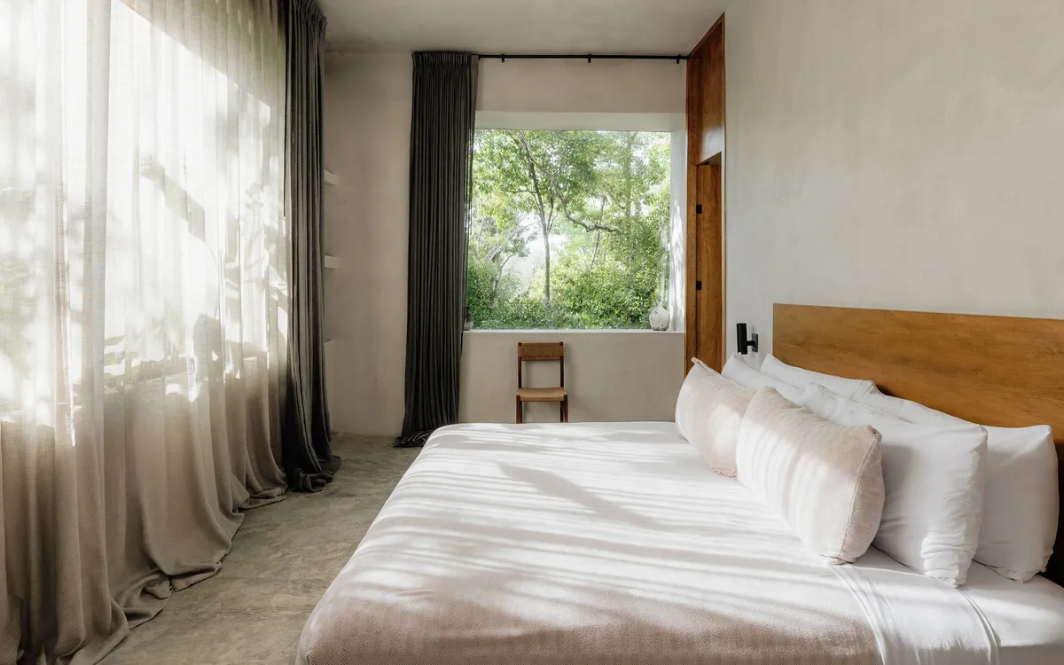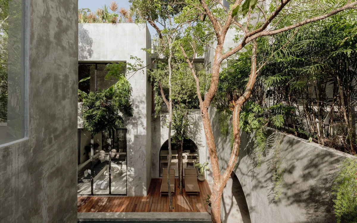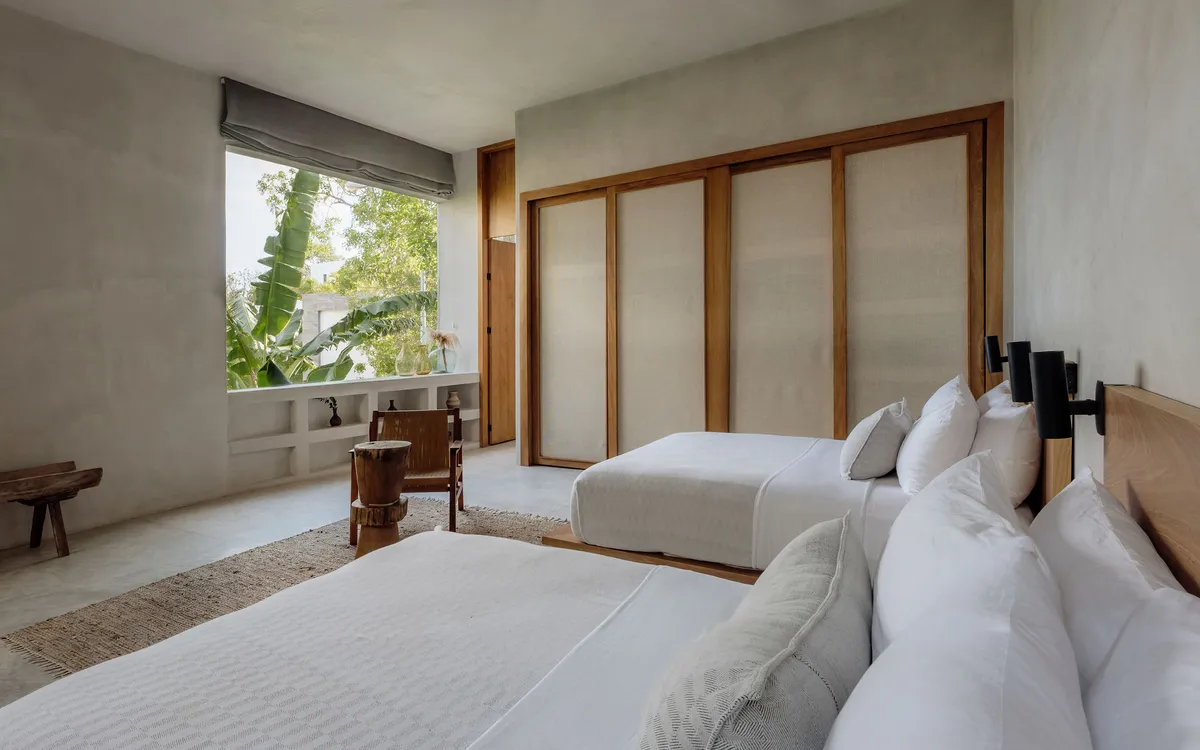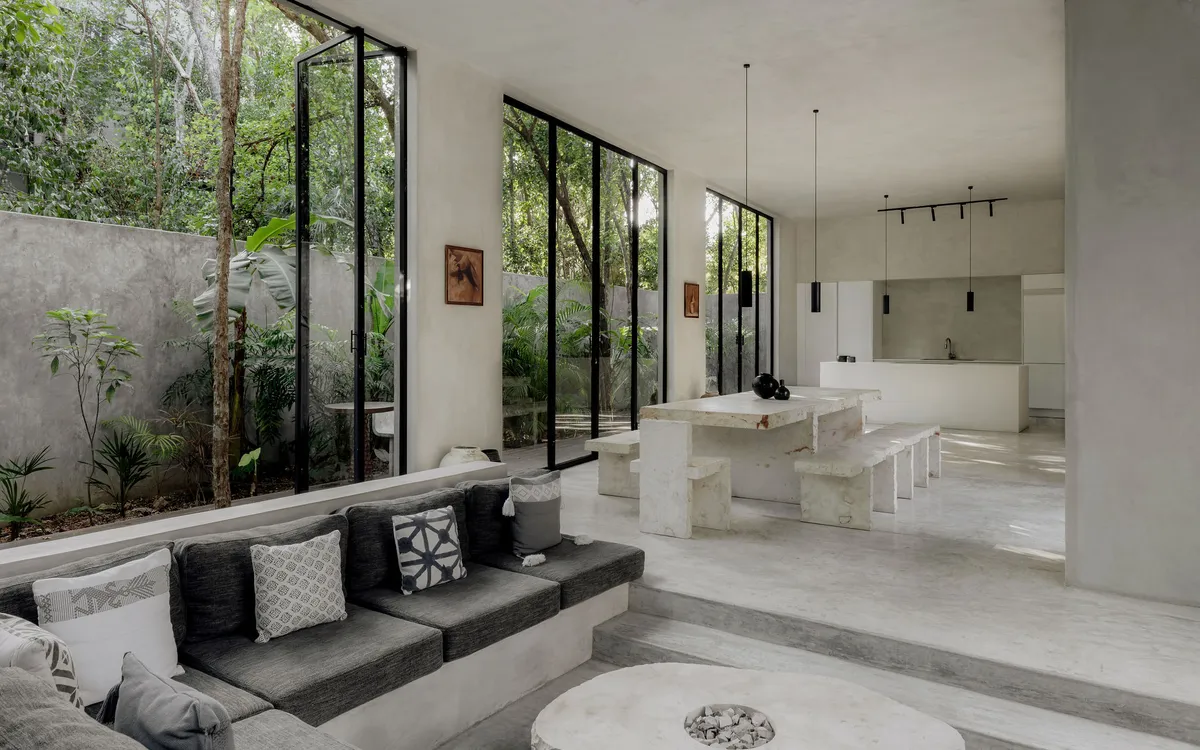 Hidden within the lush tropical paradise of Tulum, this a 6 bedroom. 7 bathroom home has space for up to 12 guests and stands as a serene architectural masterpiece