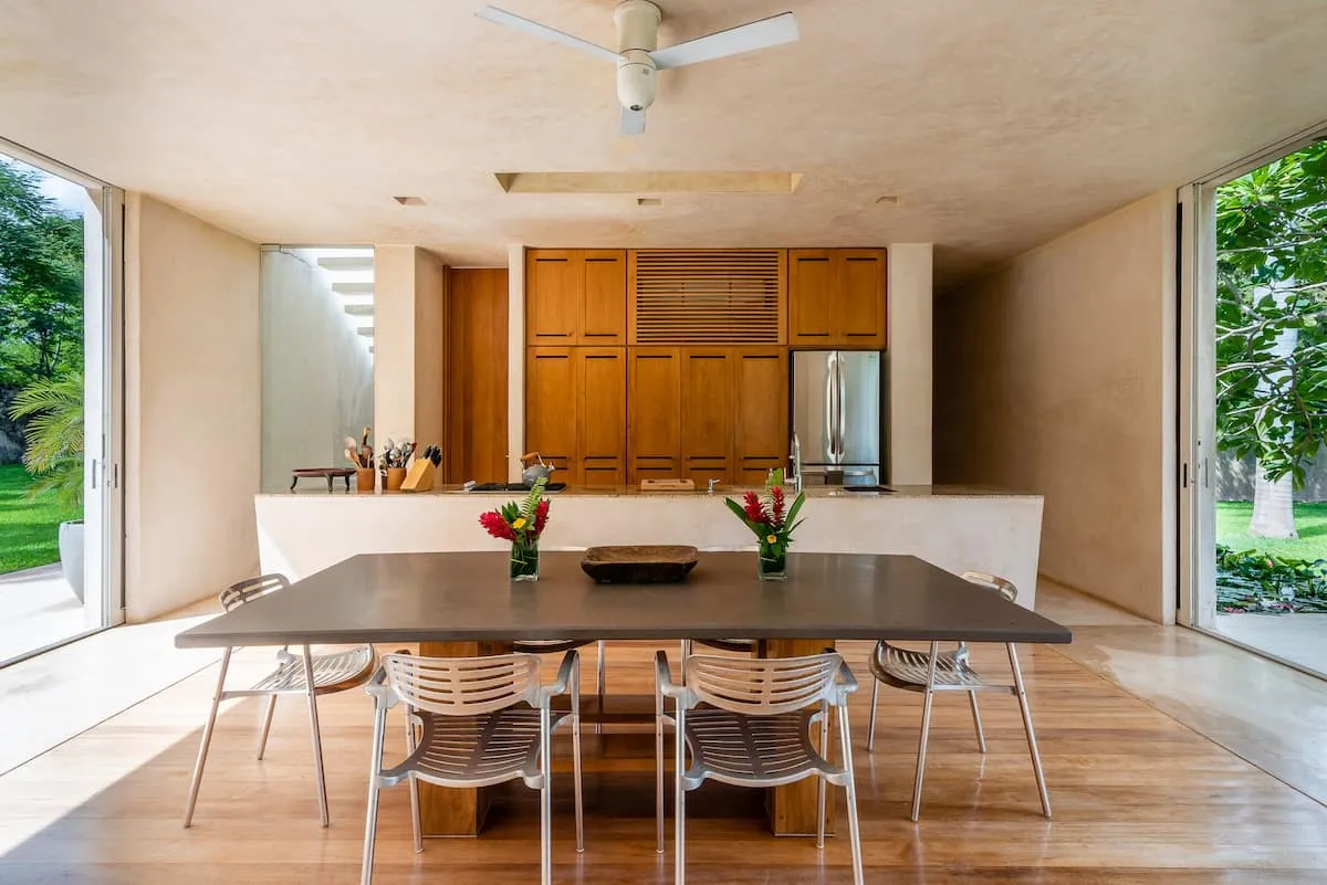 Casa Sisal features two luxurious bedrooms: one with a king bed and another with two queen beds. Each bedroom boasts its own modern, full bathroom, ensuring comfort and privacy. Connecting the two bedrooms is an expansive open-concept living space, complete with a sleek modern kitchen, a sunken living area, and a dining space that accommodates six. Floor-to-ceiling sliding glass doors in this central area blur the boundaries between indoor and outdoor living, creating a harmonious connection with the surrounding environment. The home is fully air-conditioned and equipped with ceiling fans in all rooms for ultimate comfort.