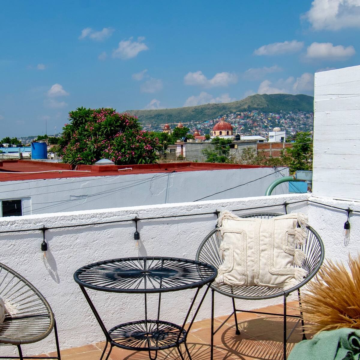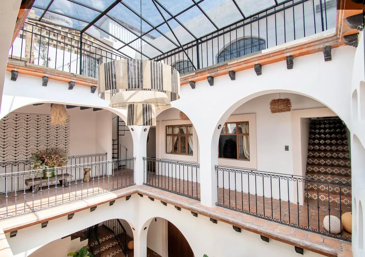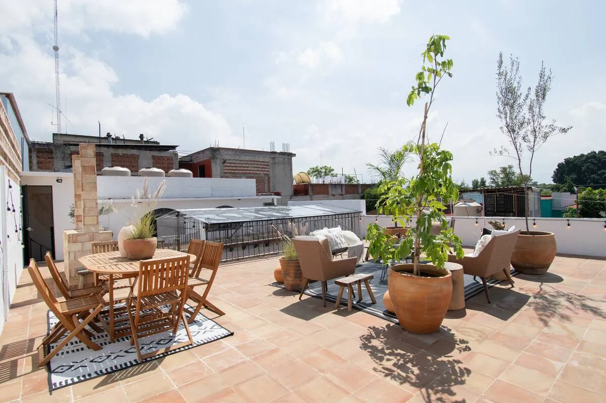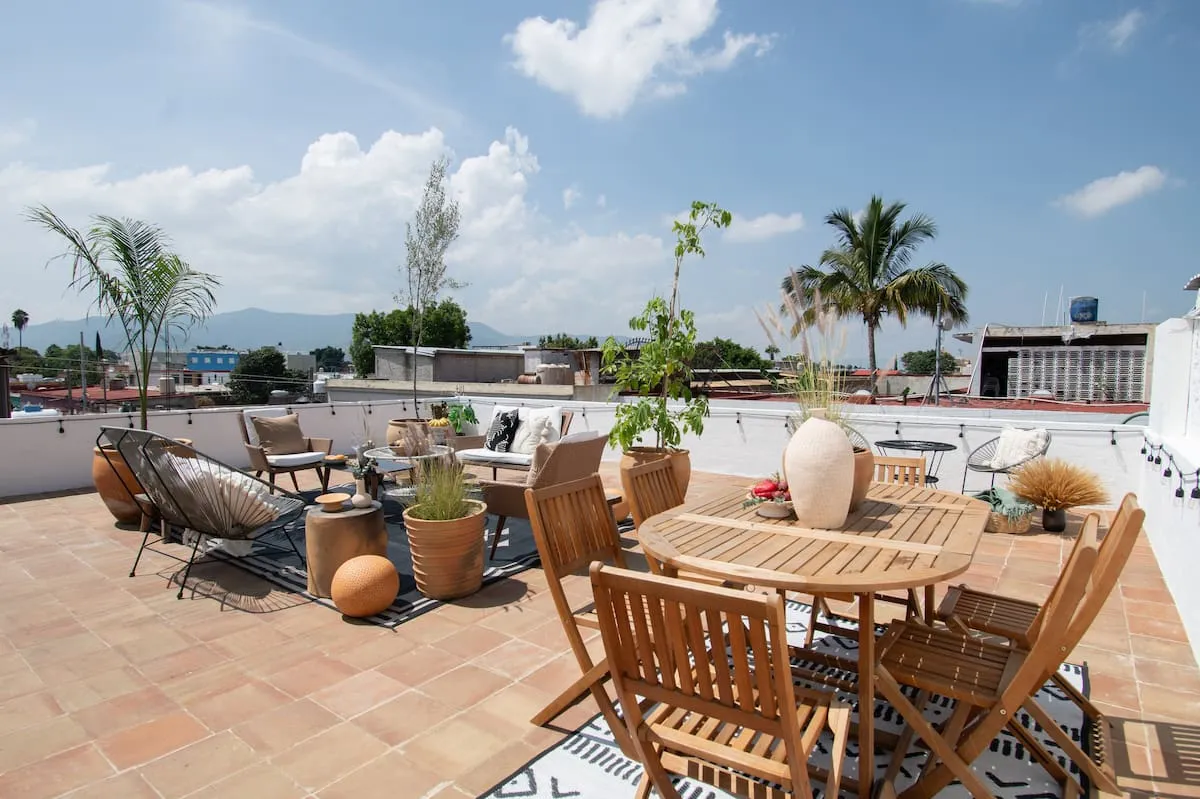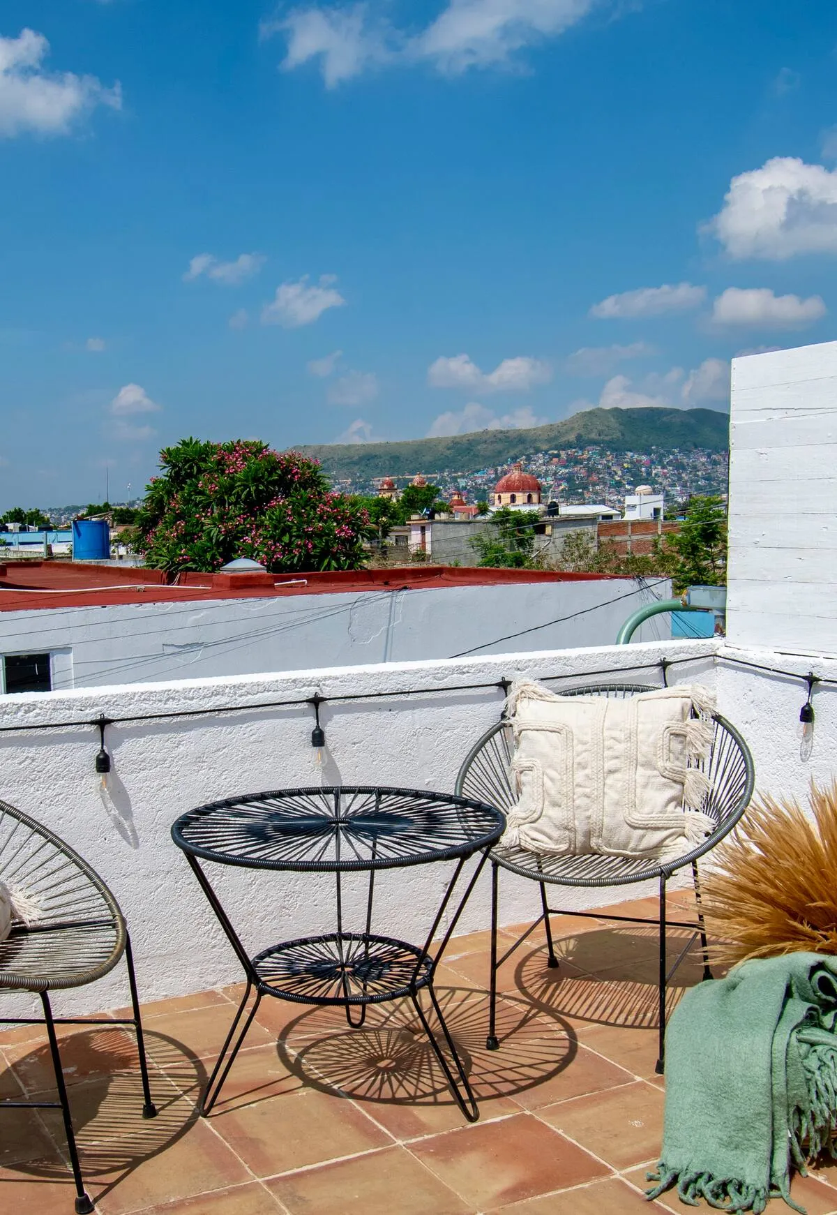 Gather in the soaring central patio beneath four-story ceilings, enjoy rooftop evenings around the grill, or prepare meals in the artisanal kitchen built entirely from Oaxacan clay. Two bedrooms include balconies with street views, and all rooms are equipped with air conditioning and high-speed WiFi.