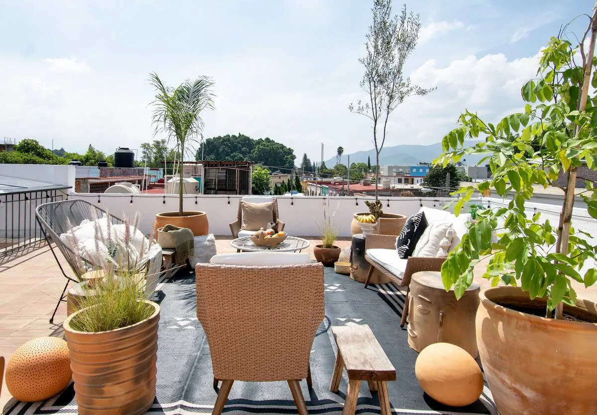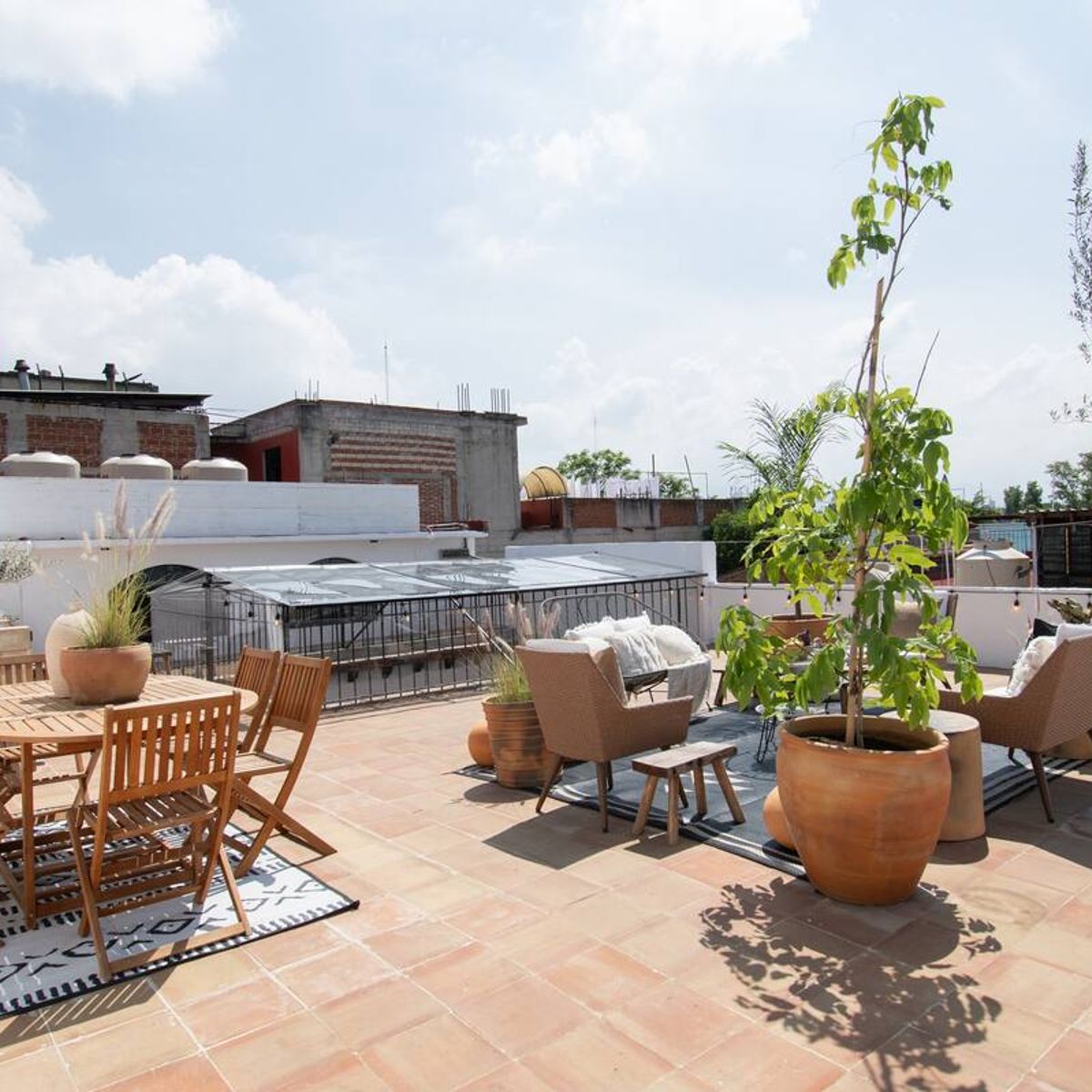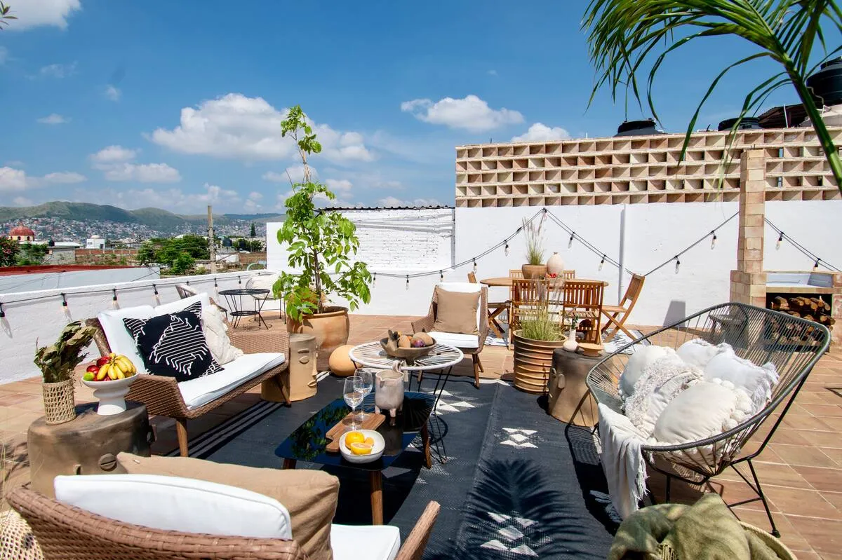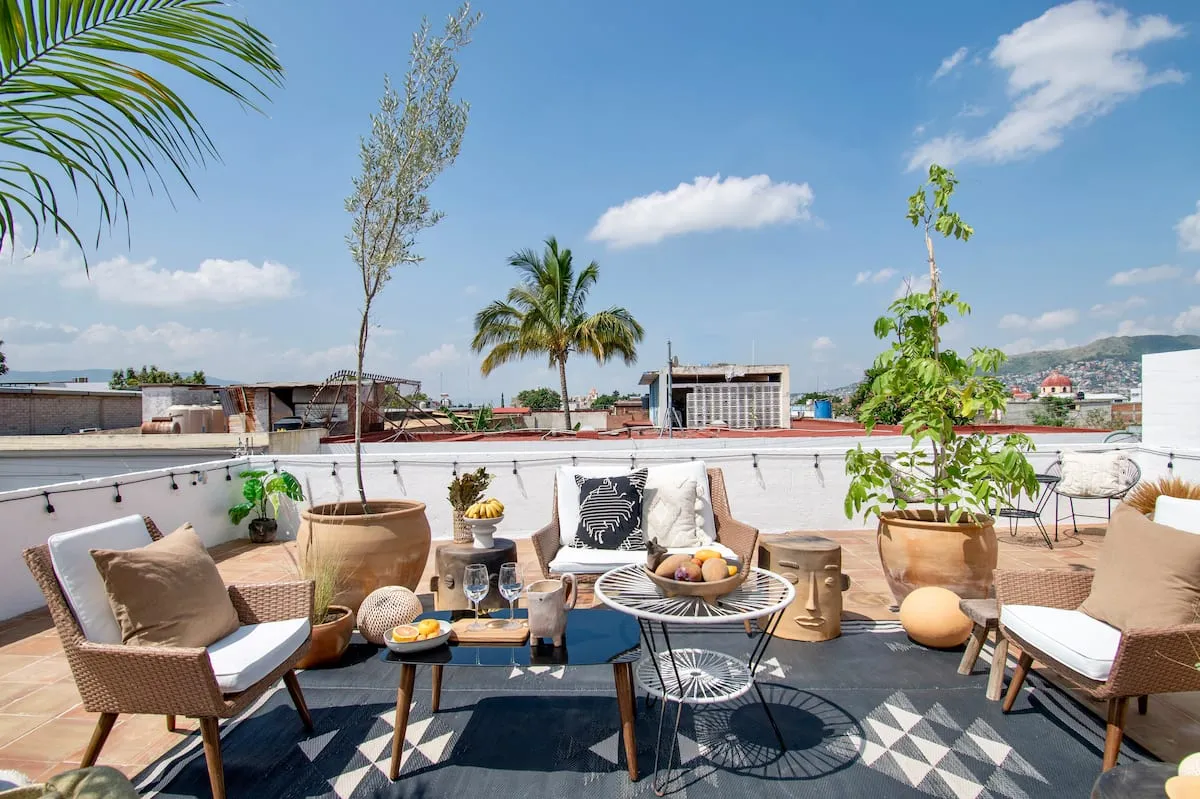 Gather in the soaring central patio beneath four-story ceilings, enjoy rooftop evenings around the grill, or prepare meals in the artisanal kitchen built entirely from Oaxacan clay. Two bedrooms include balconies with street views, and all rooms are equipped with air conditioning and high-speed WiFi.