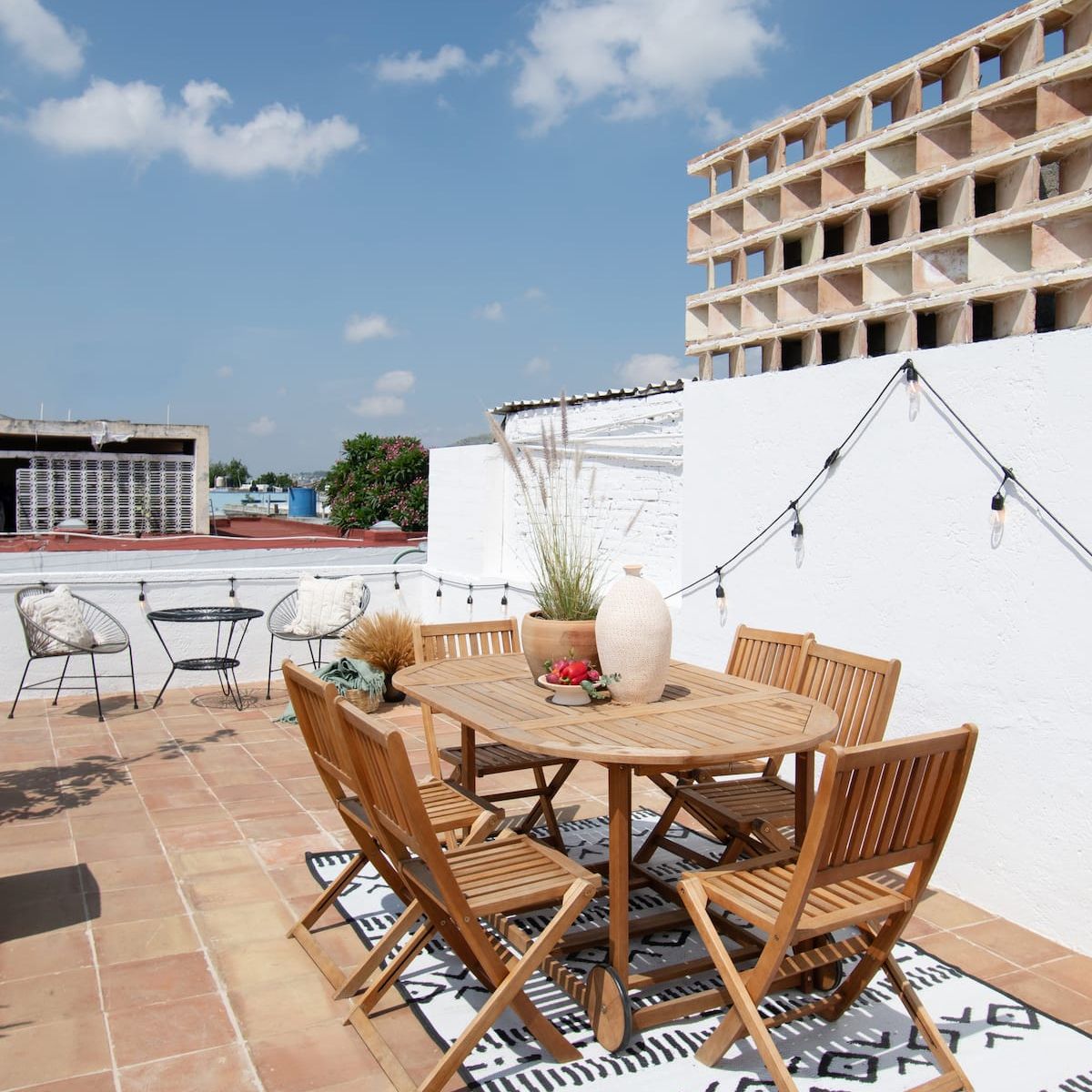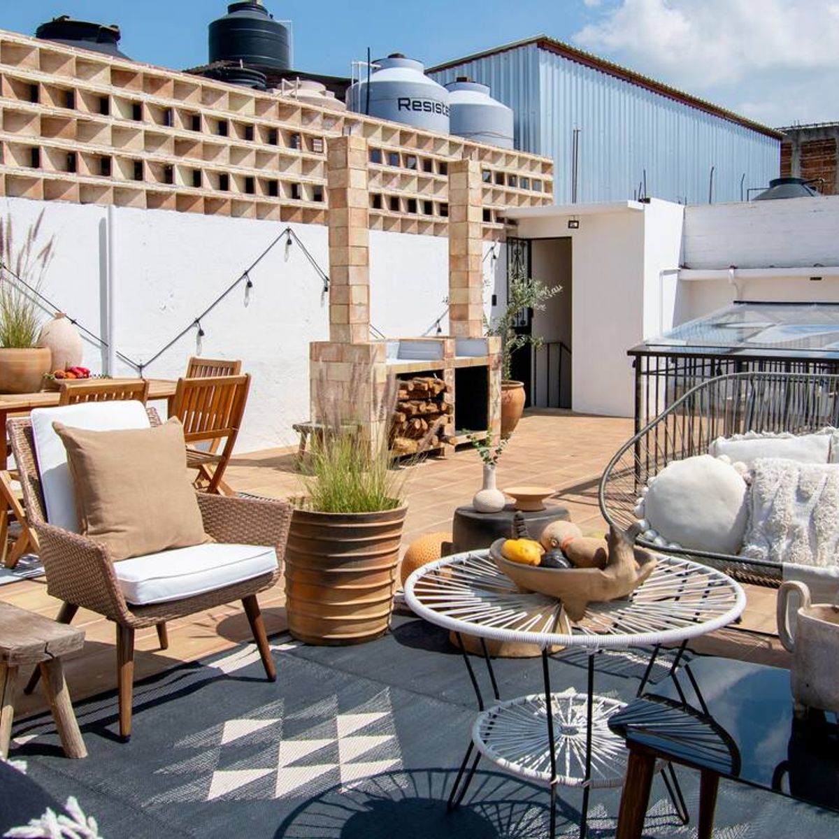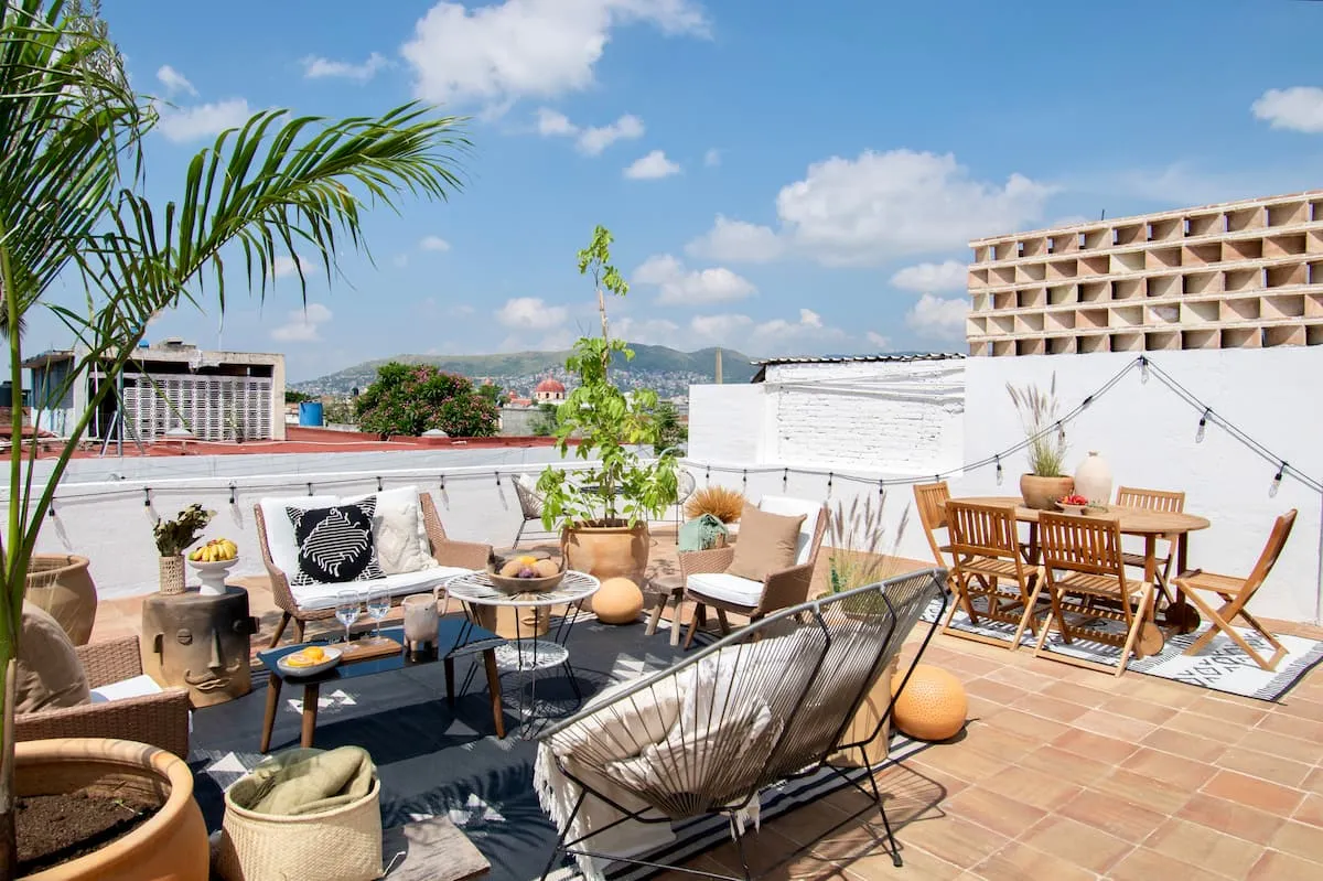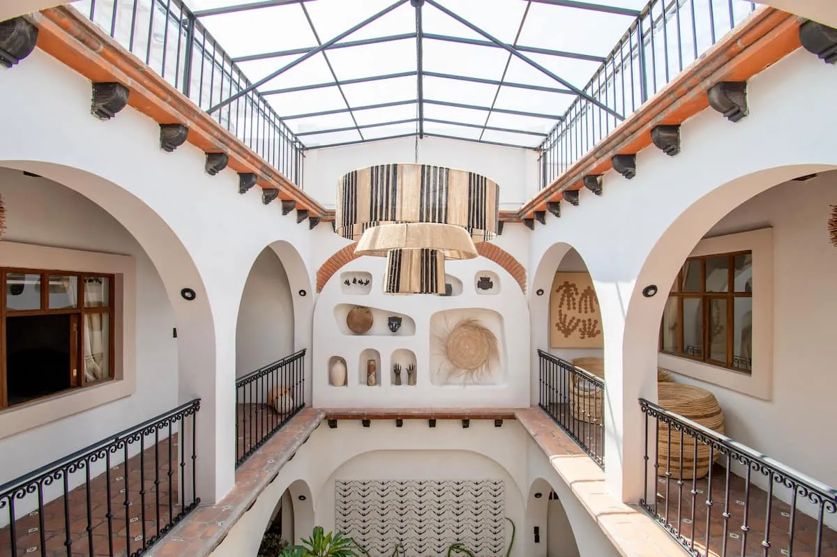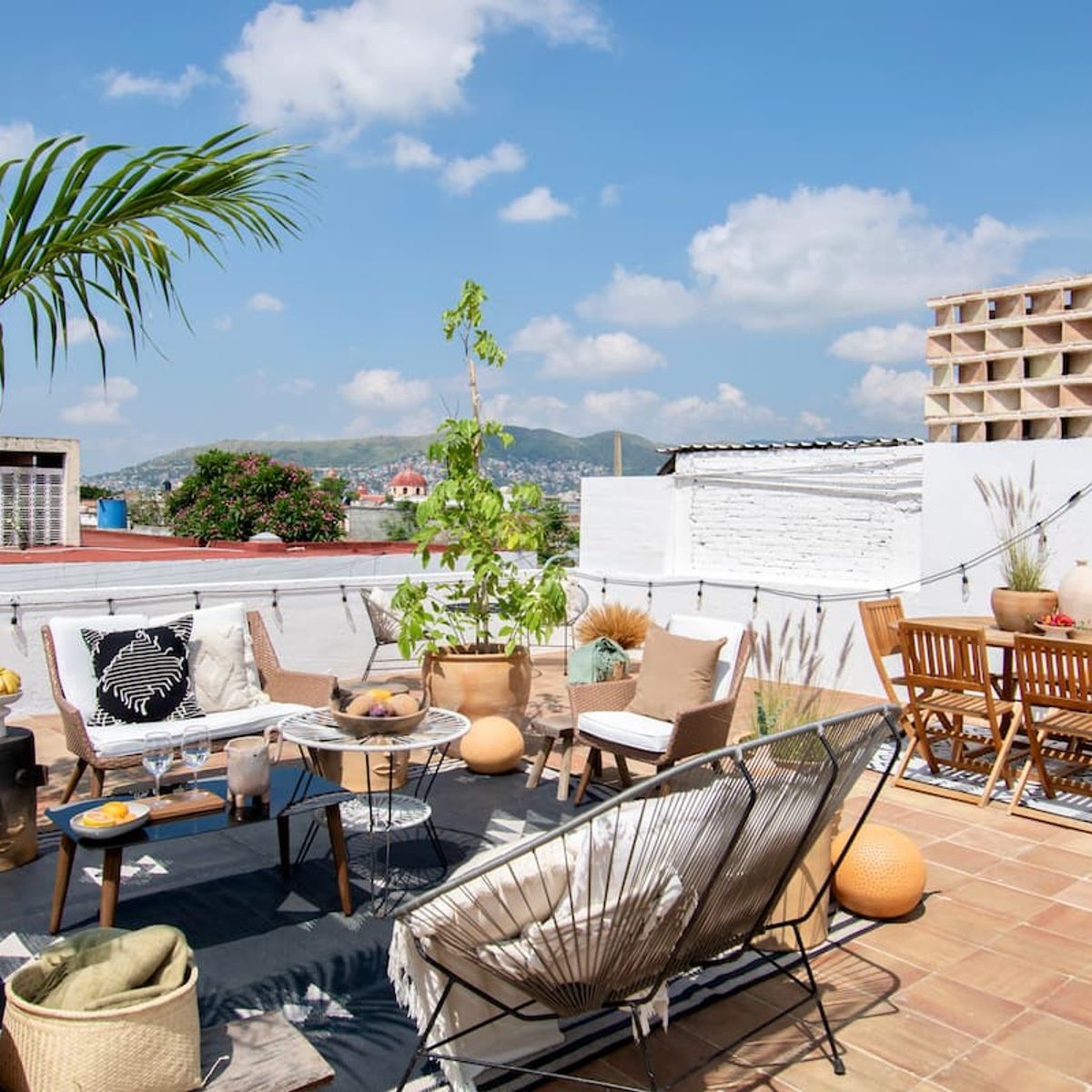Gather in the soaring central patio beneath four-story ceilings, enjoy rooftop evenings around the grill, or prepare meals in the artisanal kitchen built entirely from Oaxacan clay. Two bedrooms include balconies with street views, and all rooms are equipped with air conditioning and high-speed WiFi.