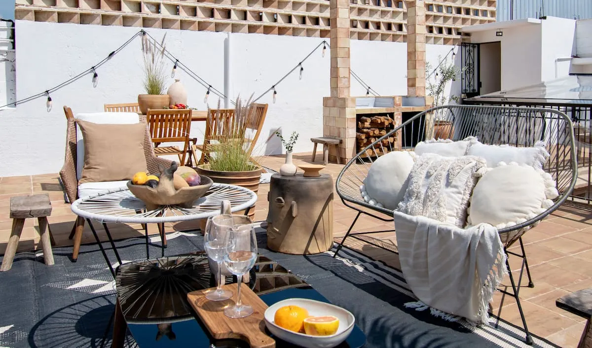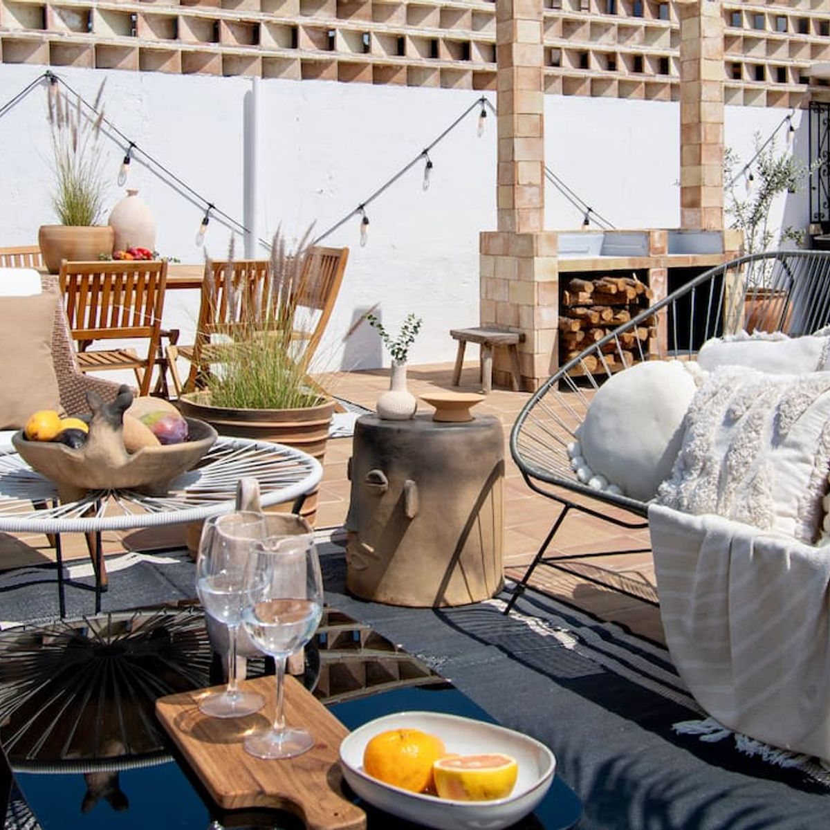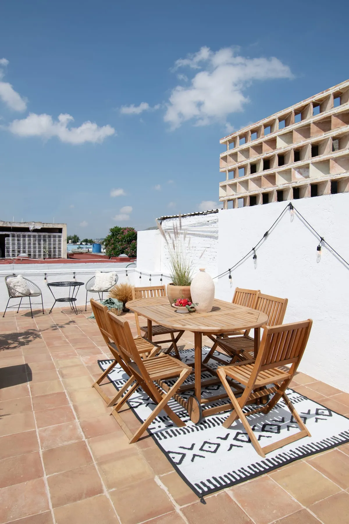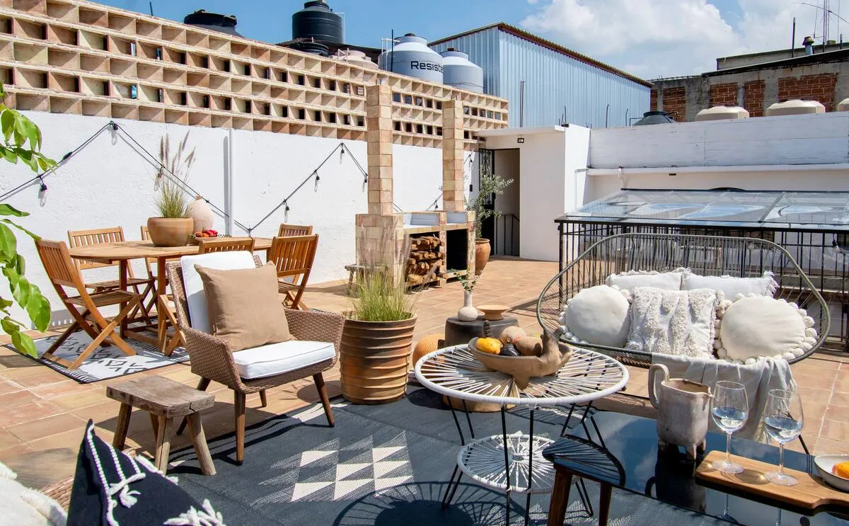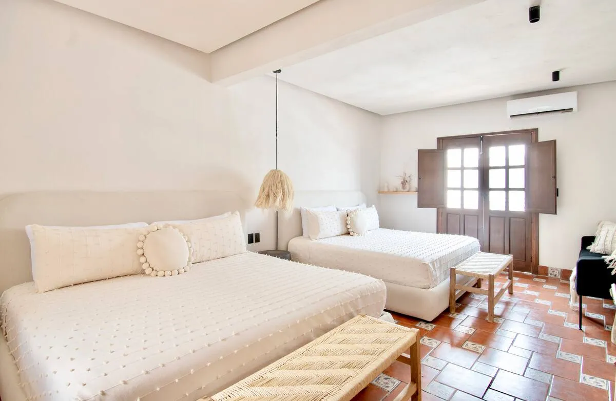 Gather in the soaring central patio beneath four-story ceilings, enjoy rooftop evenings around the grill, or prepare meals in the artisanal kitchen built entirely from Oaxacan clay. Two bedrooms include balconies with street views, and all rooms are equipped with air conditioning and high-speed WiFi.