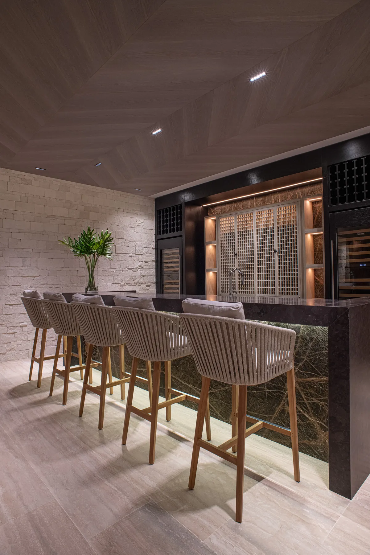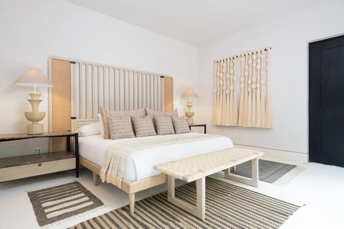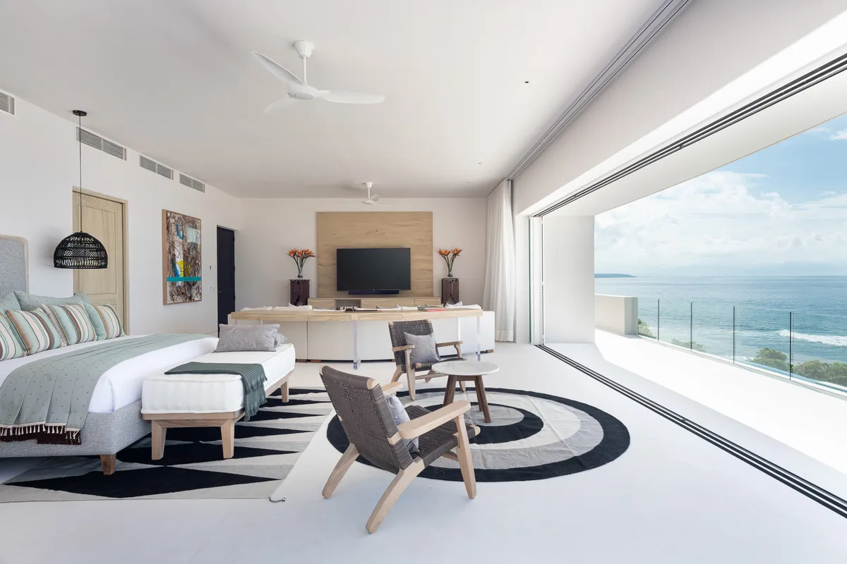The interiors were designed by Joaquin Homs — modern and raw, with European design elements, neutral tones, and massive sliding glass walls that open everything to the outdoors.