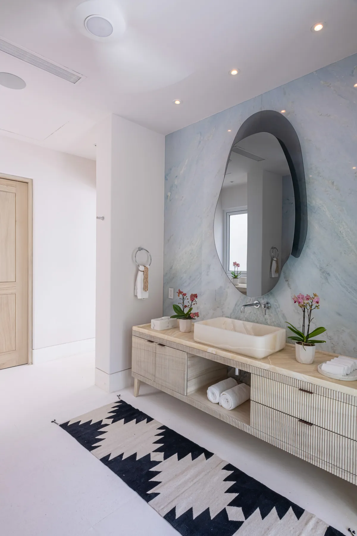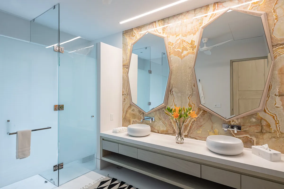 Eight en-suite bedrooms sleep up to 18 across 13 bathrooms. Two main-level master suites are steps from the pool — king beds, handcrafted soaking tubs, private outdoor showers enclosed by palms. Three upper-level ocean suites have king beds, wrap-around windows, and soaking tubs facing the water. Three garden suites each have their own private terrace.
