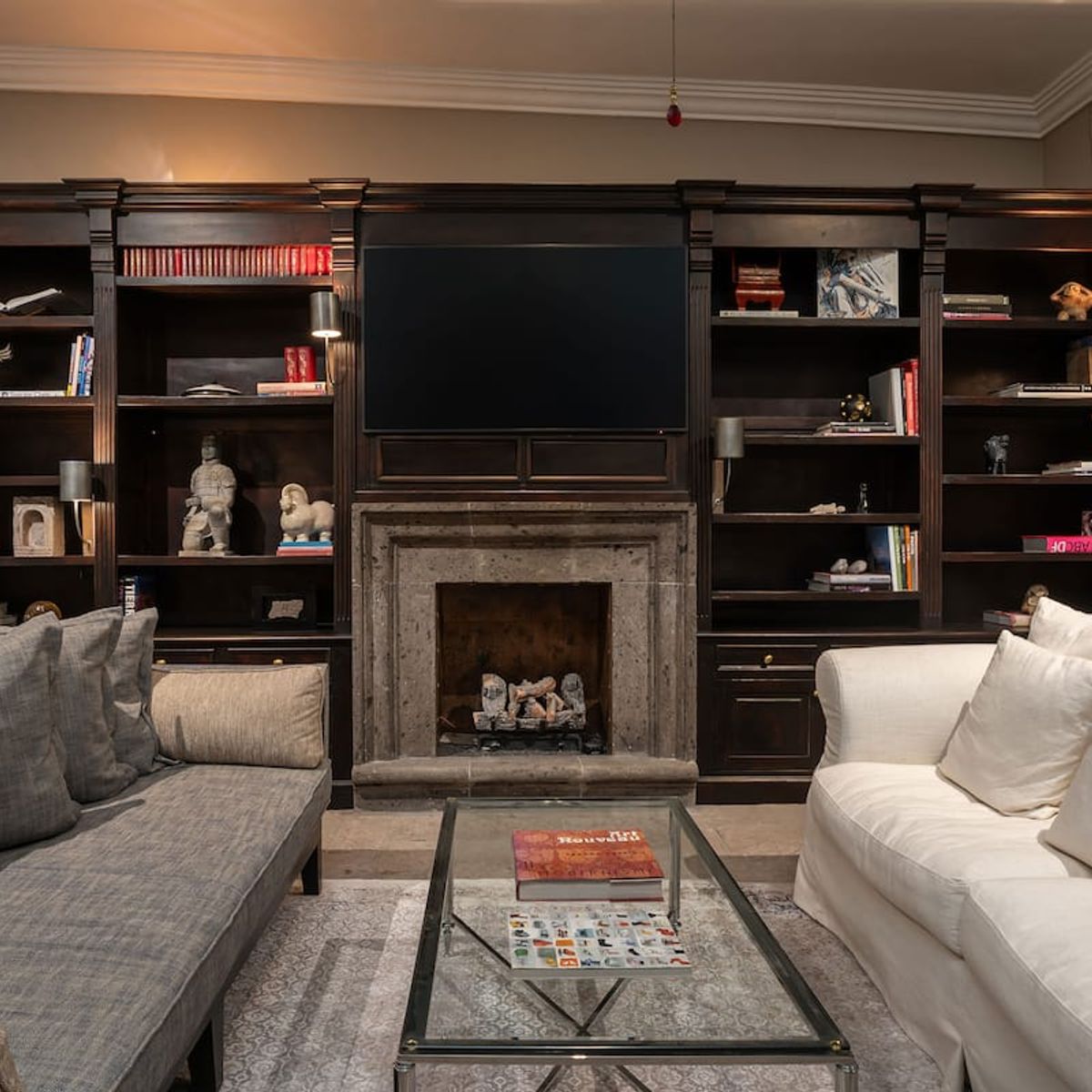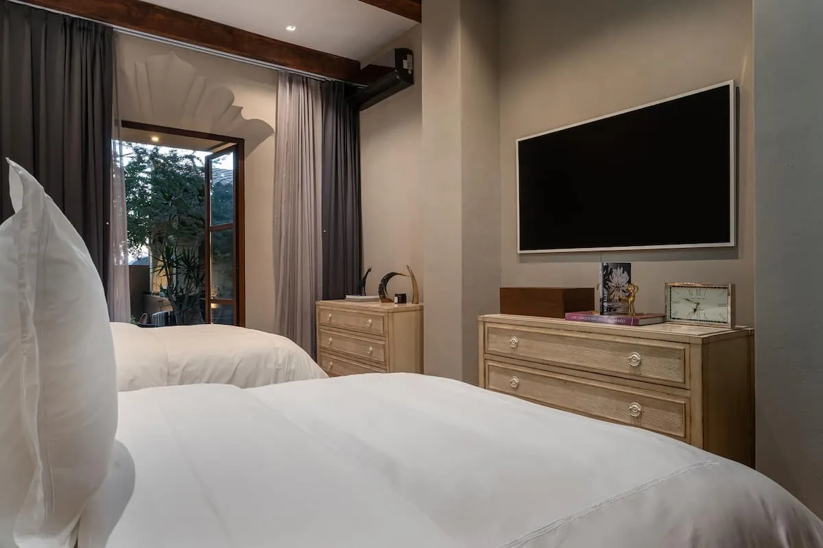 Four of the bedrooms lead directly out to the pool and hot tub, while two of the bedrooms include direct access to the rooftop terrace and feature their own private living room. The additional bedroom includes a private library and separate living room area.