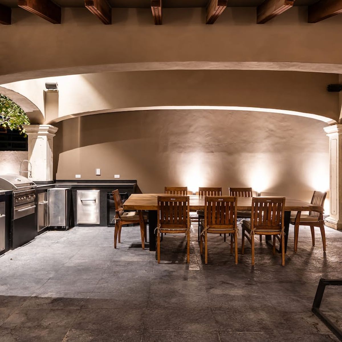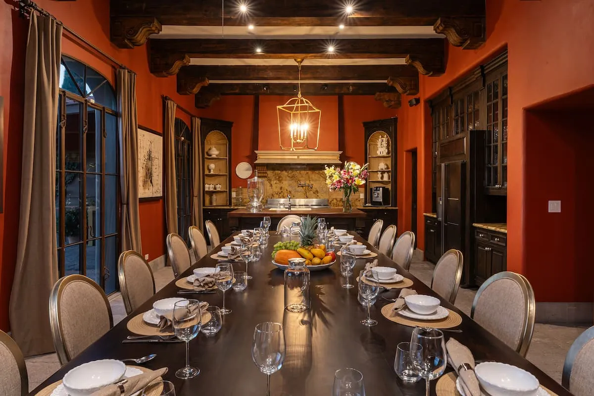 The mansion features a private pool and hot tub with panoramic views, plus a brand-new outdoor terrace perfect for weddings and events hosting up to 150+ guests. Your stay includes full staff and daily breakfast, so you can fully relax and enjoy every moment. The home is designed for seamless indoor/outdoor living, with expansive terraces and elegant open-air spaces that invite connection and tranquility. Inside, you’ll find a fully equipped kitchen, a stylish dining area for up to 16 guests, and thoughtfully curated designer furnishings throughout.