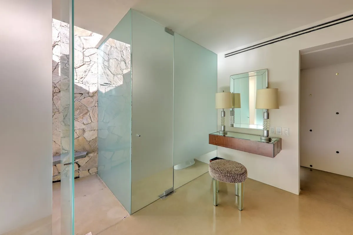 The villa's interiors are curated with intention — minimalist yet warm, sophisticated yet effortlessly livable. Each bedroom suite is a private sanctuary, thoughtfully designed for rest and indulgence. Pour a drink at the bar, sink into the pool, and let the panoramic views do the rest.