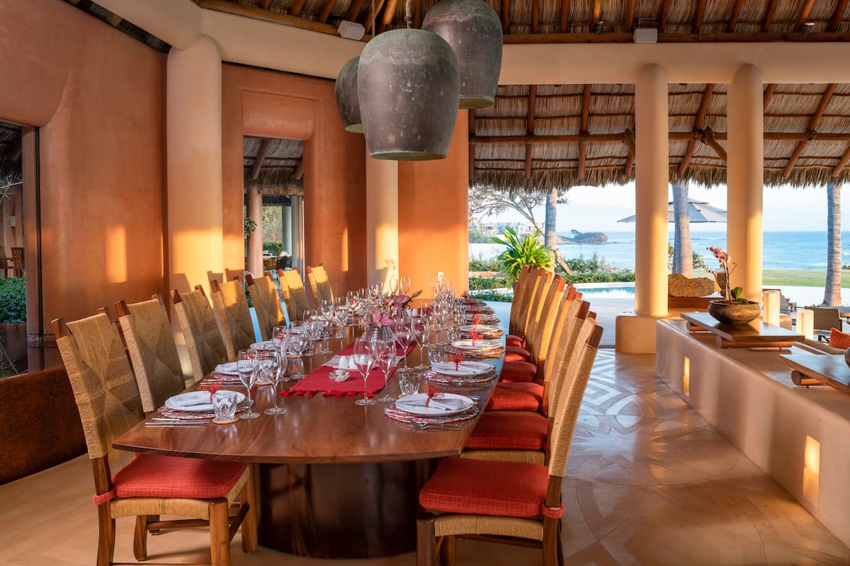The main living and dining areas sit under an open-air palapa with direct views over the bay. The 18-seat outdoor dining table is positioned for sunset every evening — candles lit, views unobstructed.