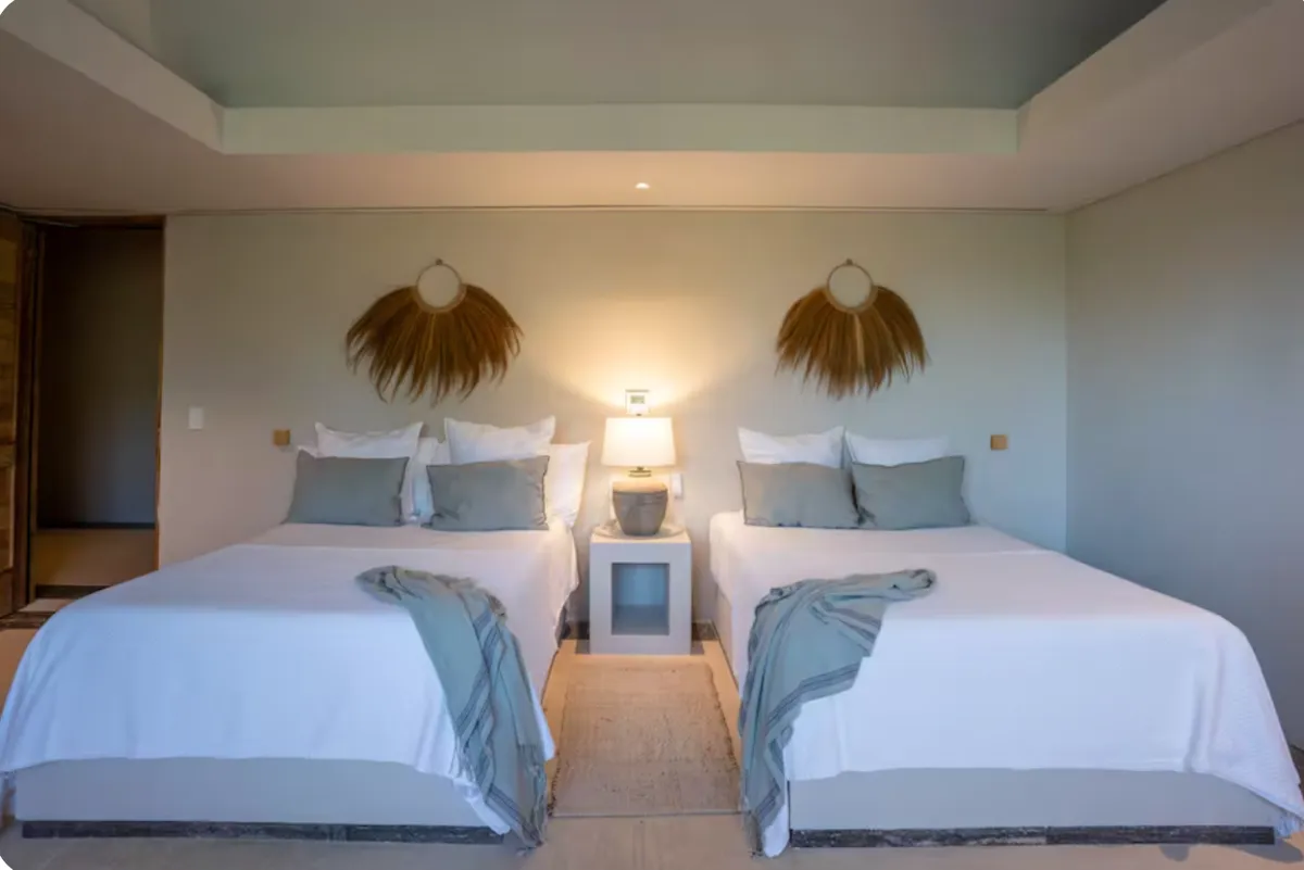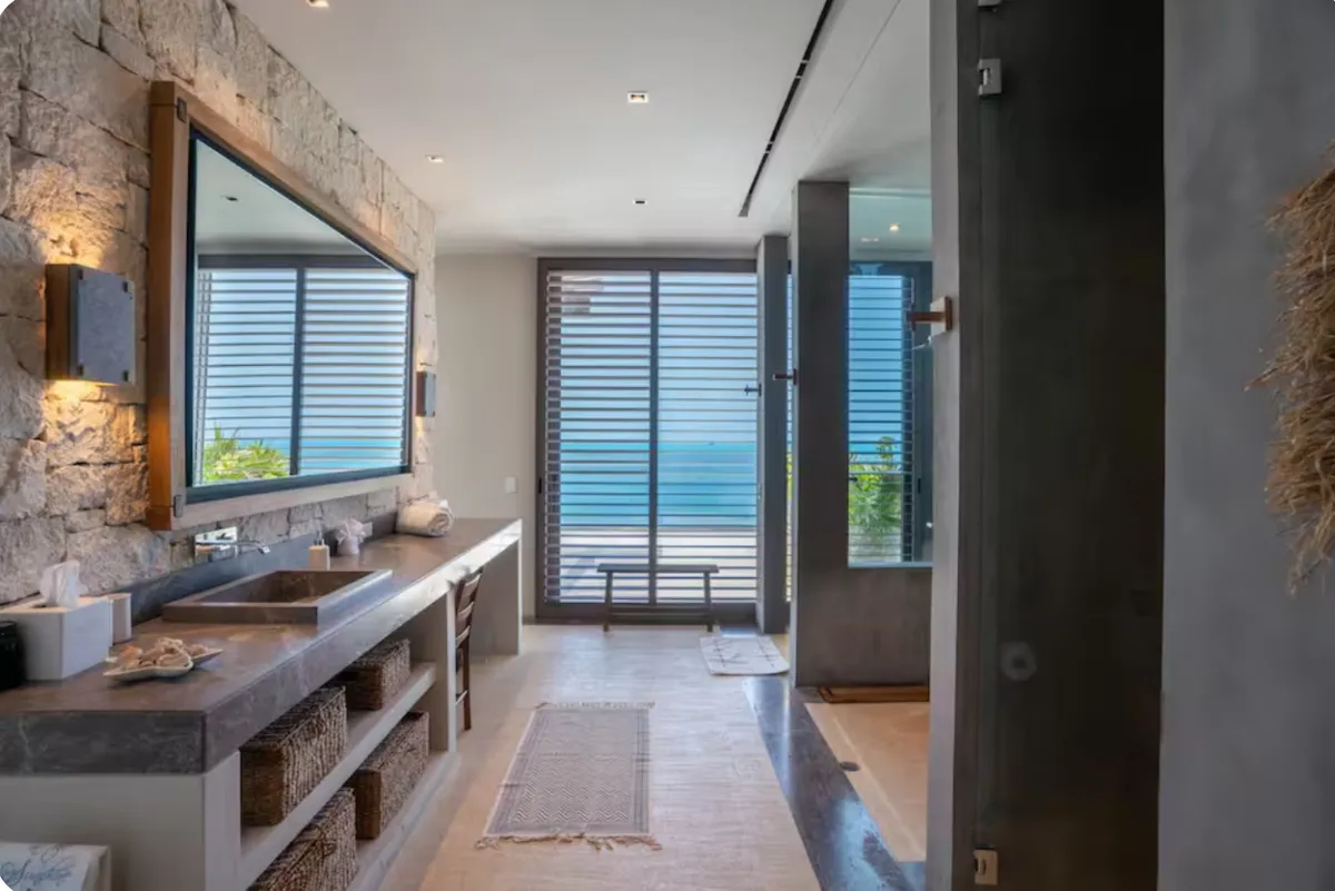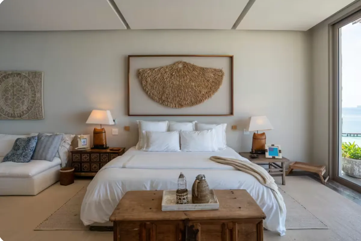 The villa accommodates large groups with nine en-suite bedrooms, thoughtfully distributed between the main residence, a beach-level suite, and two independent bungalows. Each space is designed to offer comfort, privacy, and a relaxed coastal atmosphere.