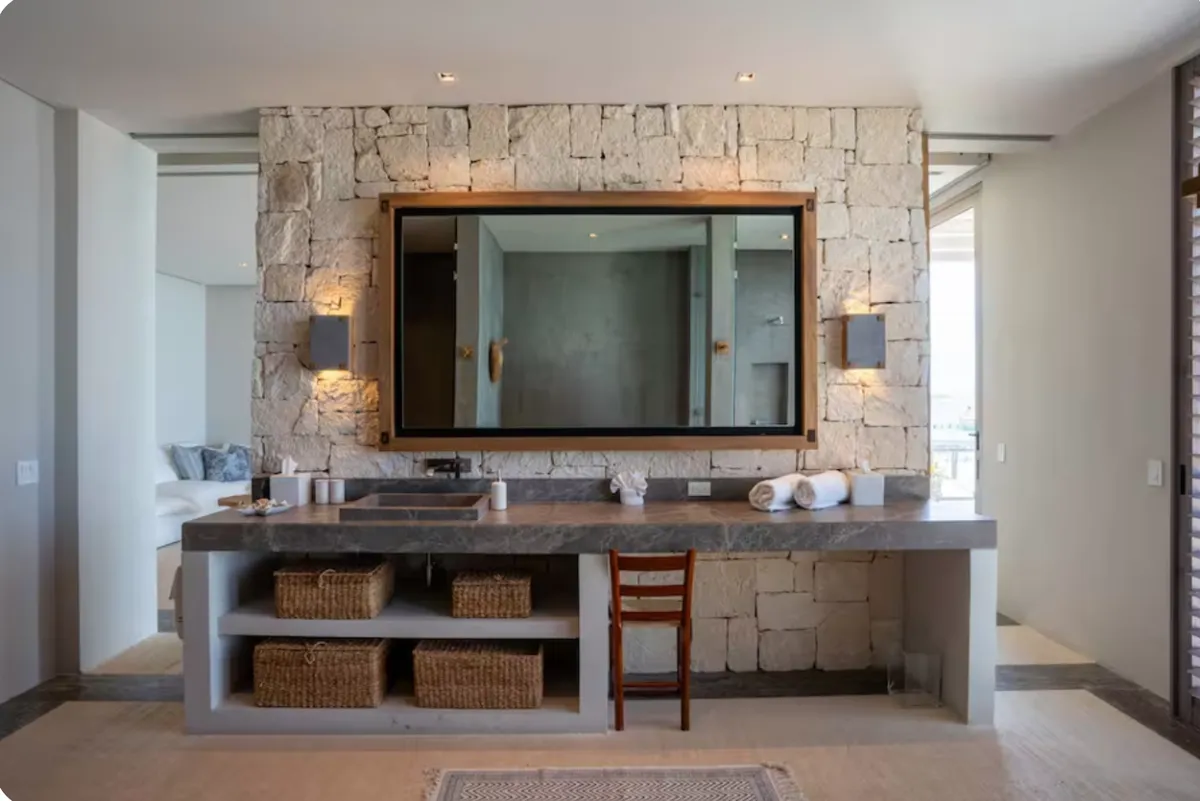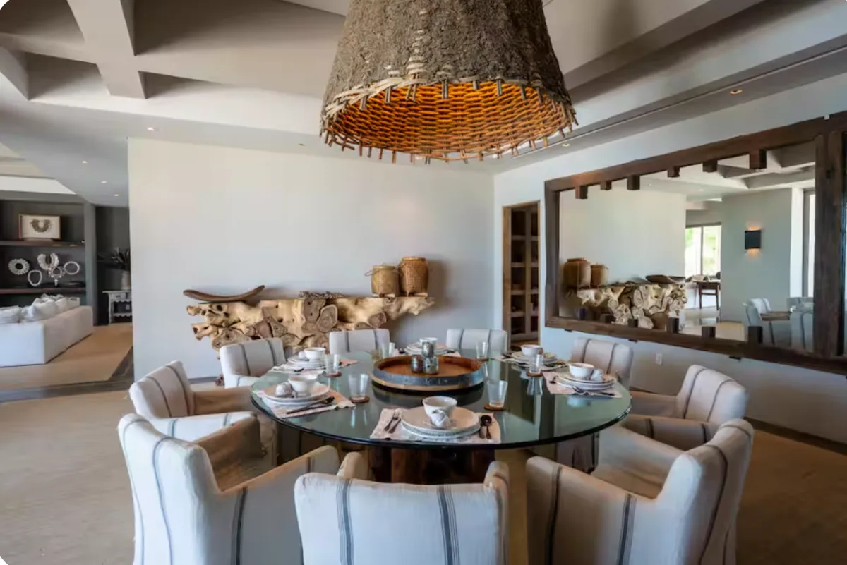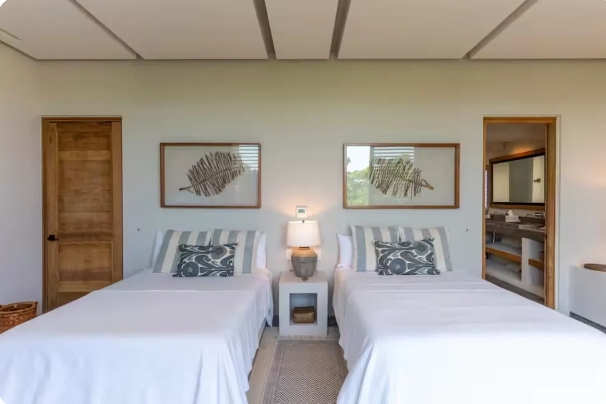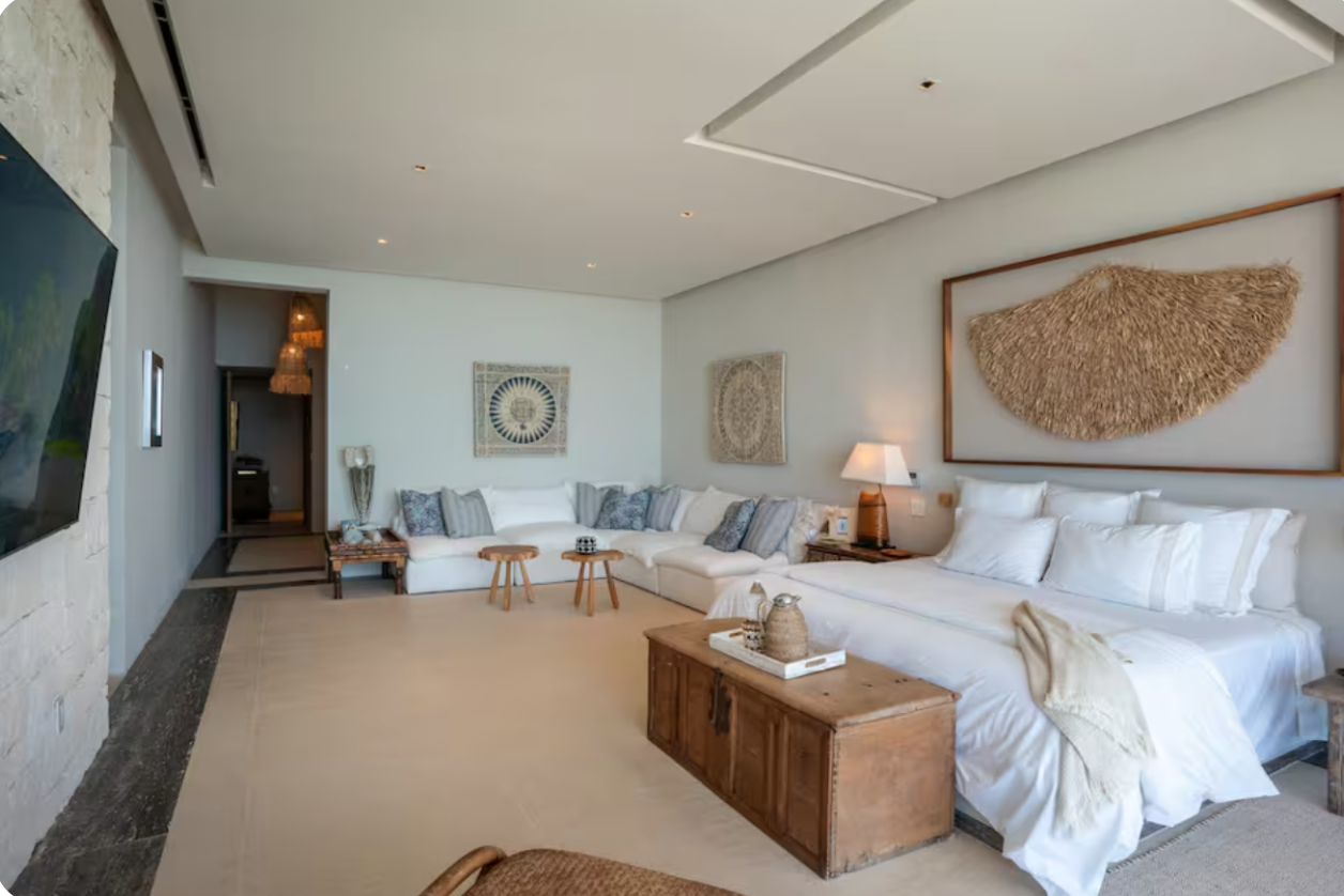 The villa accommodates large groups with nine en-suite bedrooms, thoughtfully distributed between the main residence, a beach-level suite, and two independent bungalows. Each space is designed to offer comfort, privacy, and a relaxed coastal atmosphere.