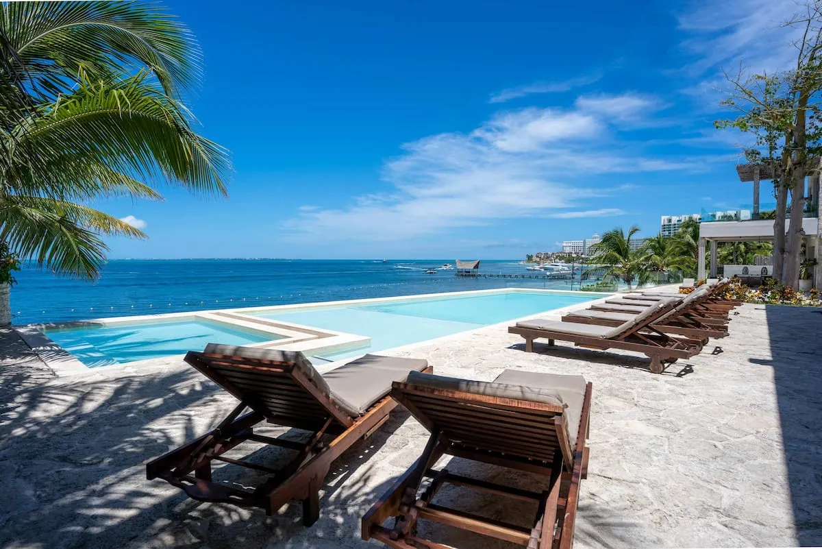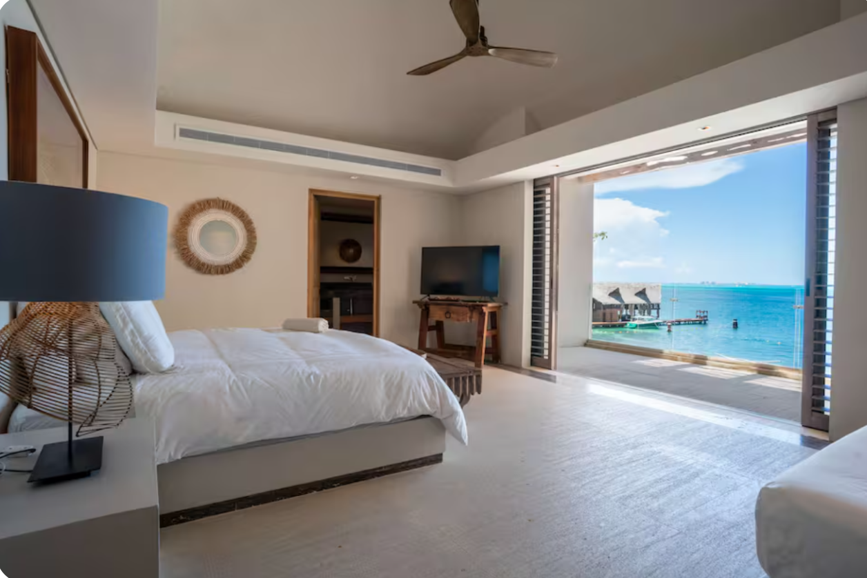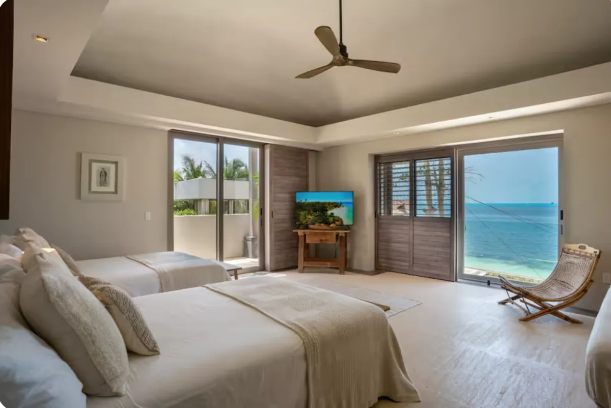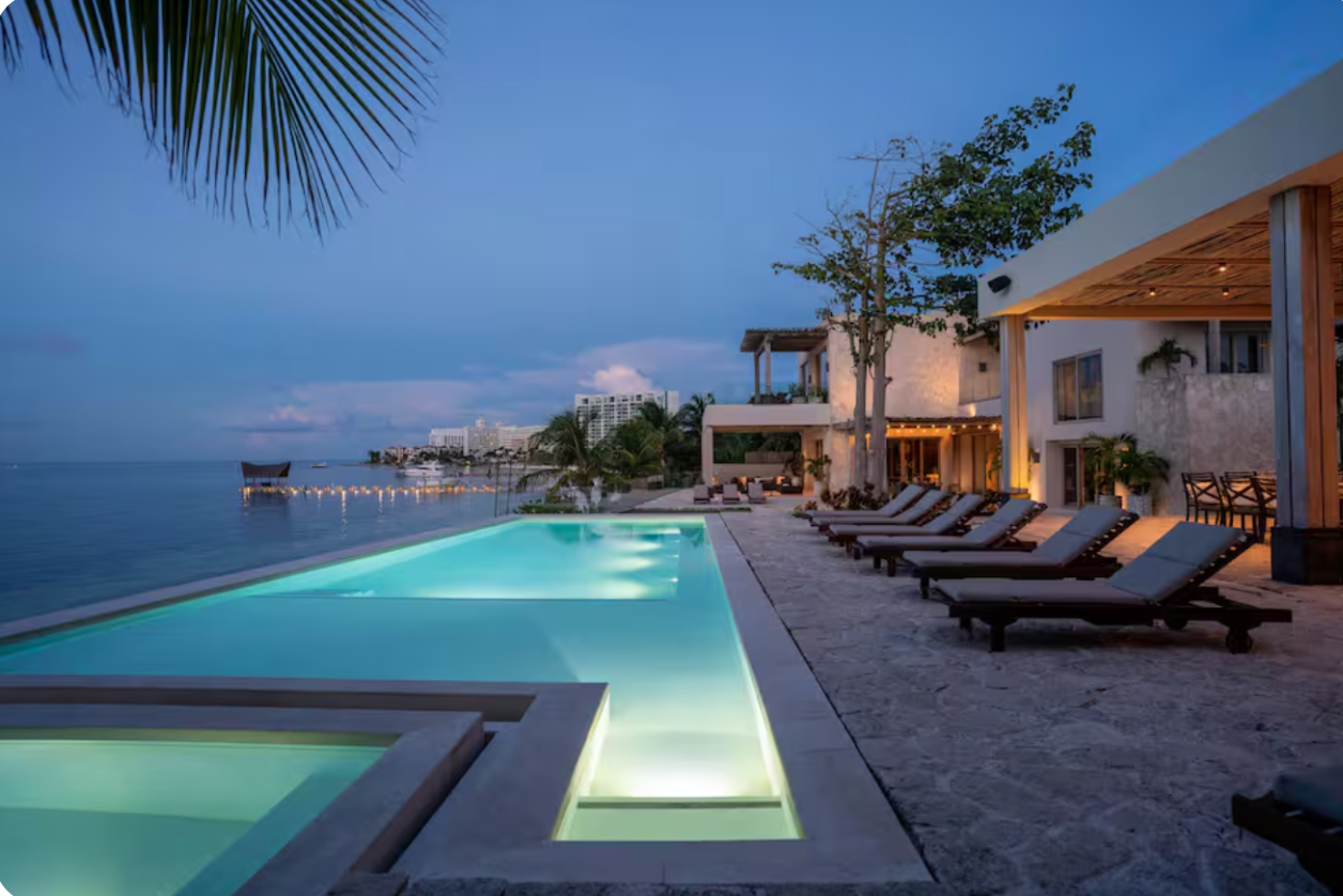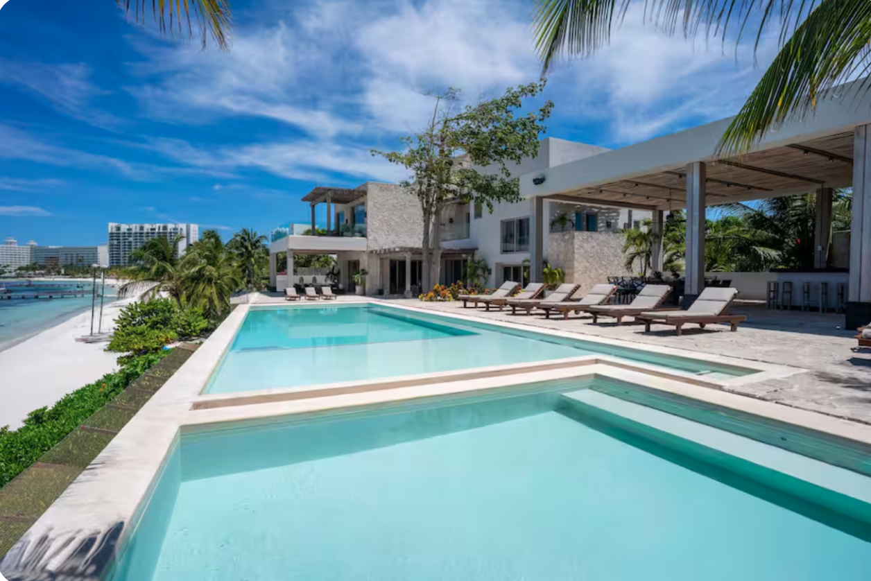 With direct access to one of Cancun’s most desirable beaches, this villa offers a refined setting for groups seeking privacy, comfort, and a true oceanfront experience.