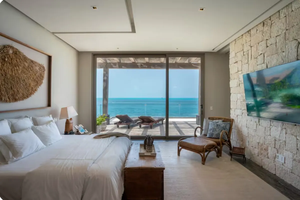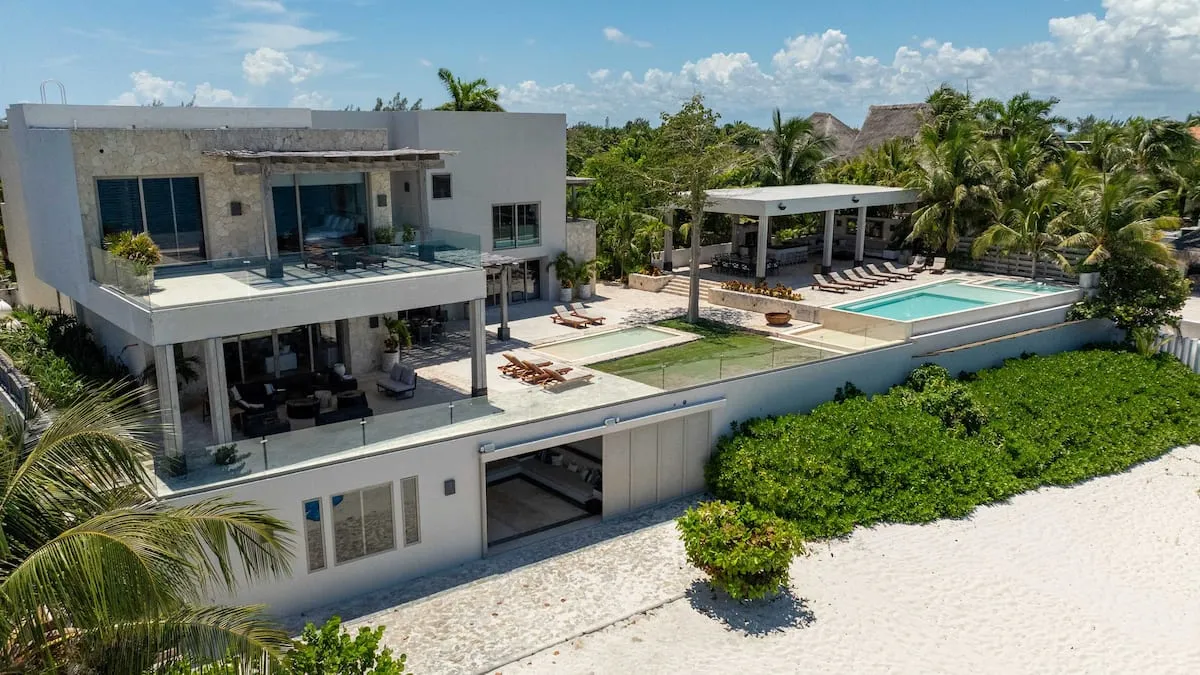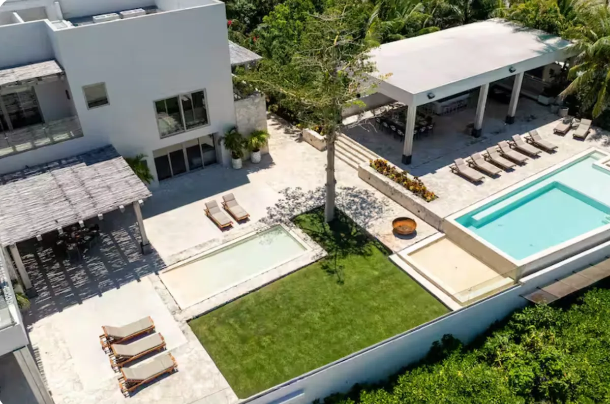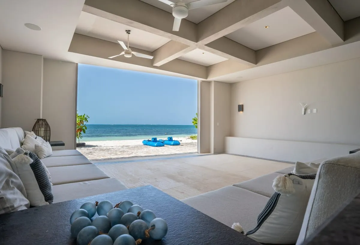 This nine-bedroom beachfront villa offers a seamless blend of minimalist design and elevated comfort, creating a private resort-style experience along the Caribbean coast. Overlooking the striking contrast of turquoise and deep blue waters, the property features a stunning infinity pool, expansive outdoor living areas, and direct access to a pristine white sand beach. A poolside palapa and private beach club provide the perfect setting to enjoy both sunrise and sunset in complete privacy.
