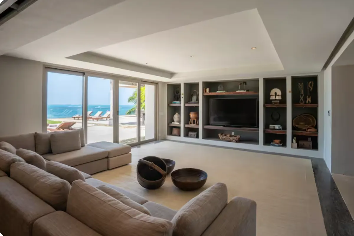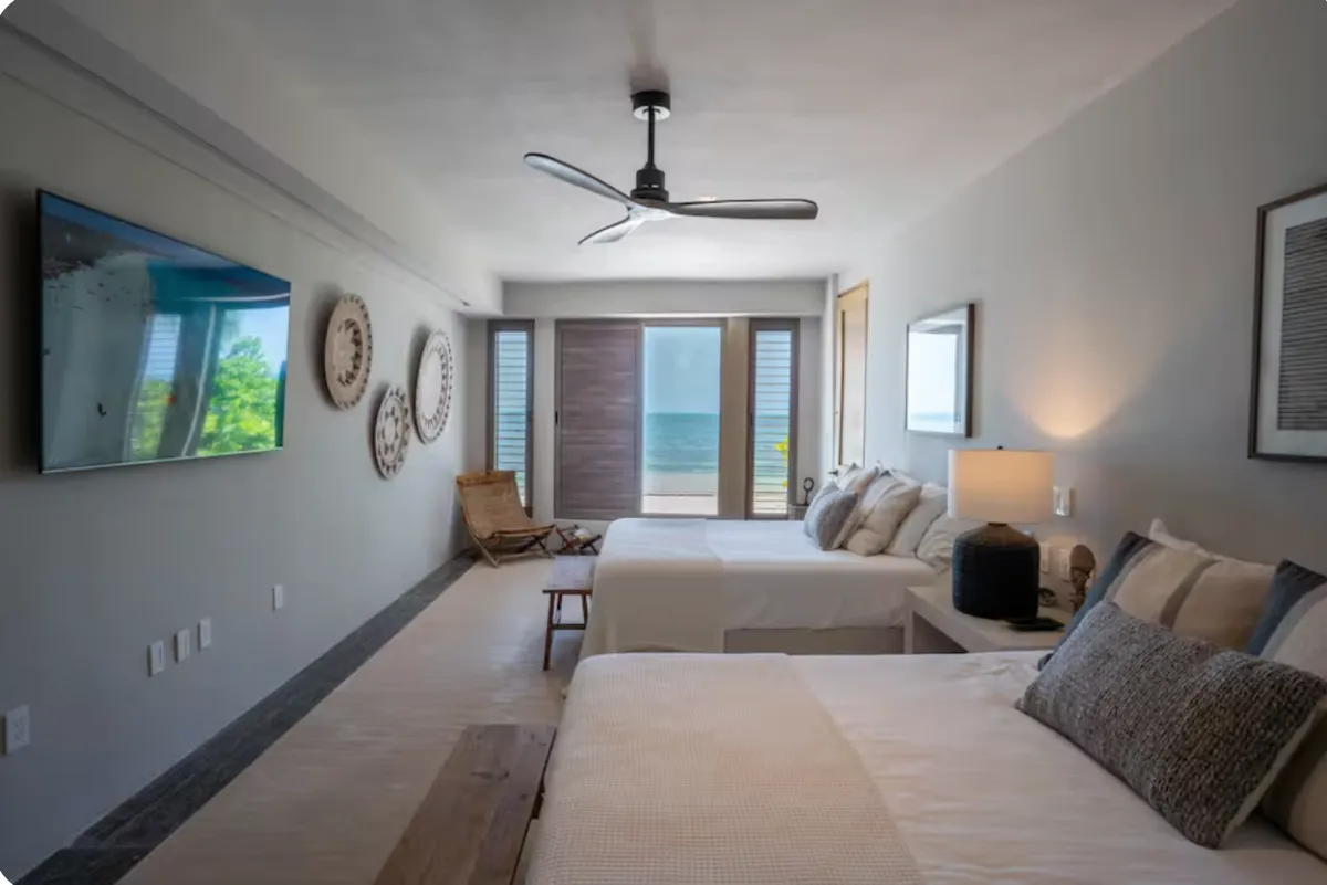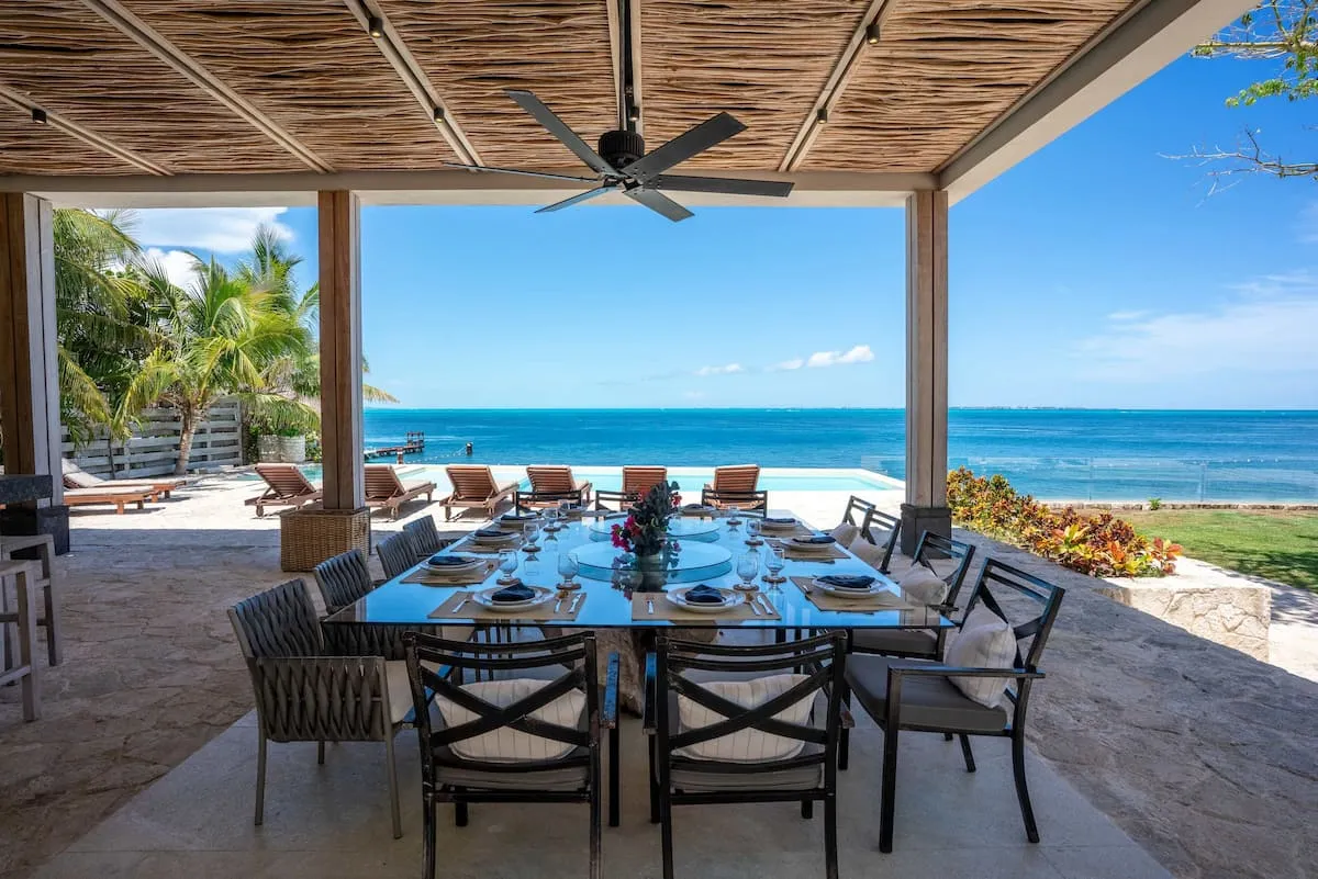 This nine-bedroom beachfront villa offers a seamless blend of minimalist design and elevated comfort, creating a private resort-style experience along the Caribbean coast. Overlooking the striking contrast of turquoise and deep blue waters, the property features a stunning infinity pool, expansive outdoor living areas, and direct access to a pristine white sand beach. A poolside palapa and private beach club provide the perfect setting to enjoy both sunrise and sunset in complete privacy.