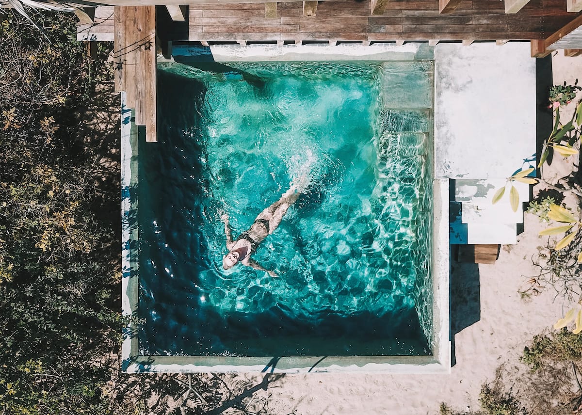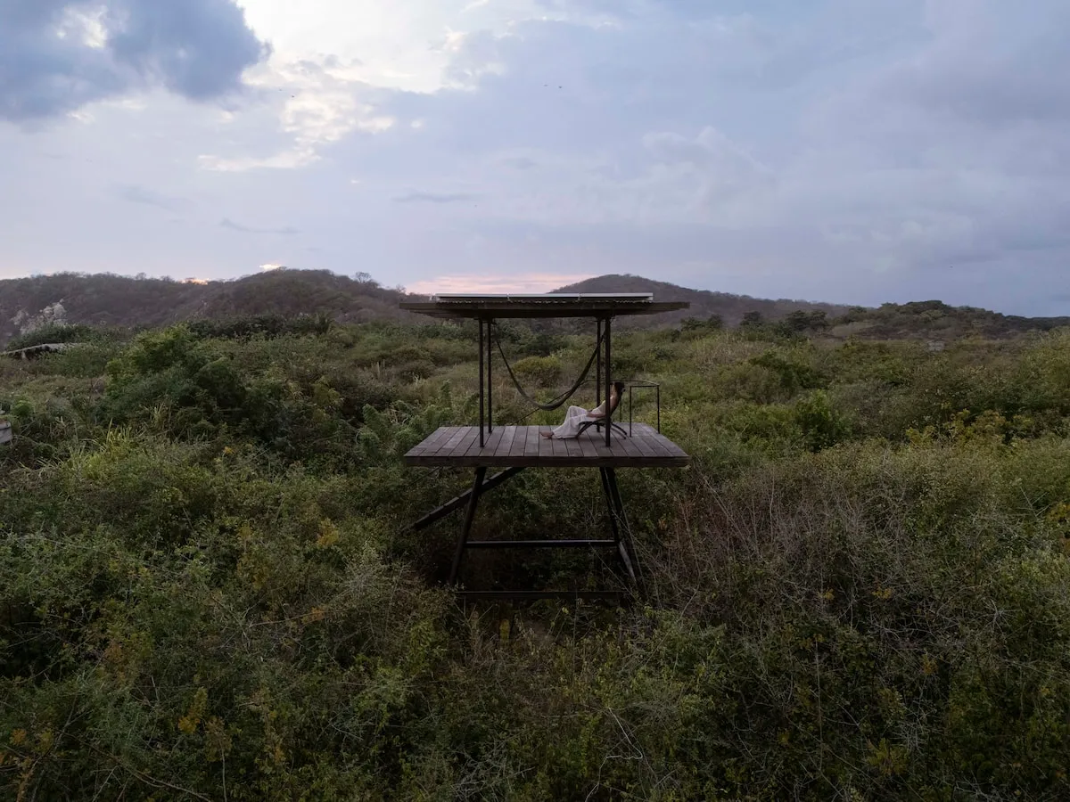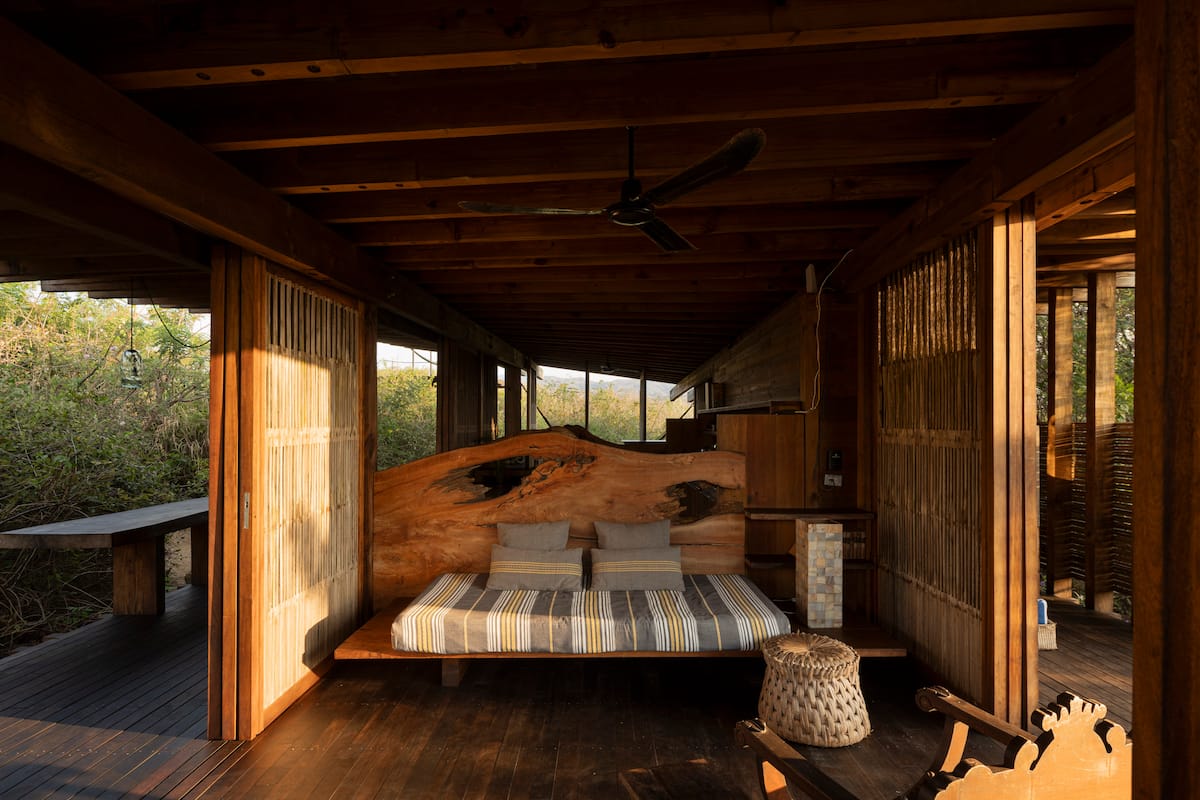 The one bedroom home, just a few steps from the Pacific Ocean, has a spectacular view, equipped with a full kitchen, bathroom and shower al fresco and a private Pool. The cabin is a wooden box mounted on a platform slightly separated from the sand, at almost a meter above ground level, its sliding doors of palm wood open completely to allow the breeze to run freely and enjoy a spectacular 360 degree view of the ocean and the surrounding vegetation. It is an ideal place to rest, practice yoga and meditation, admire the birds and the beautiful nature that surrounds them.