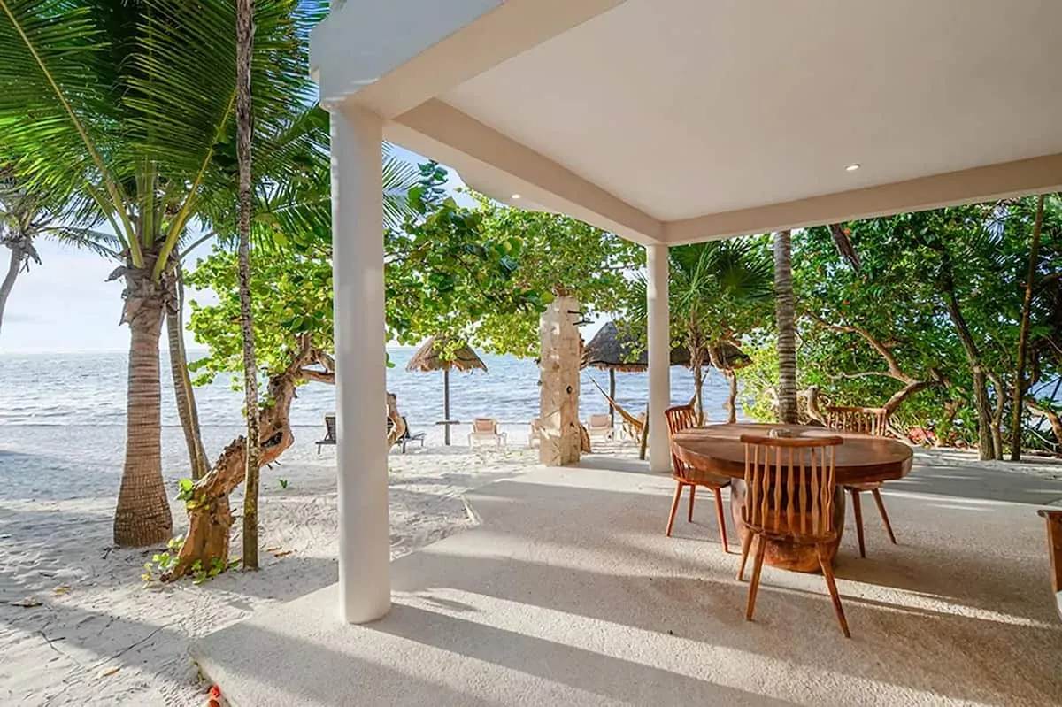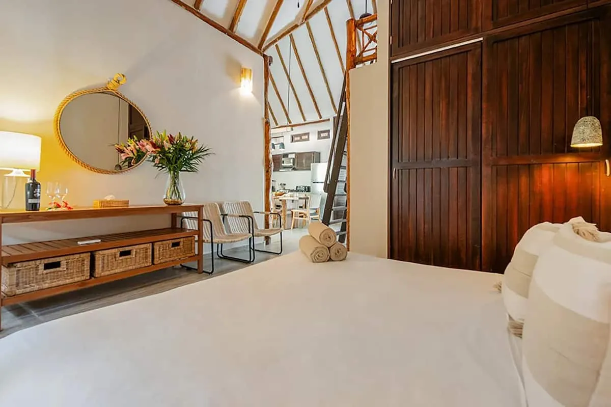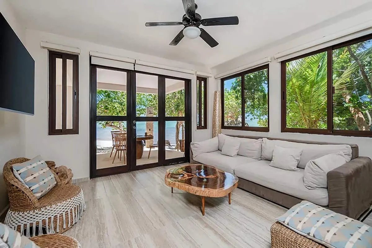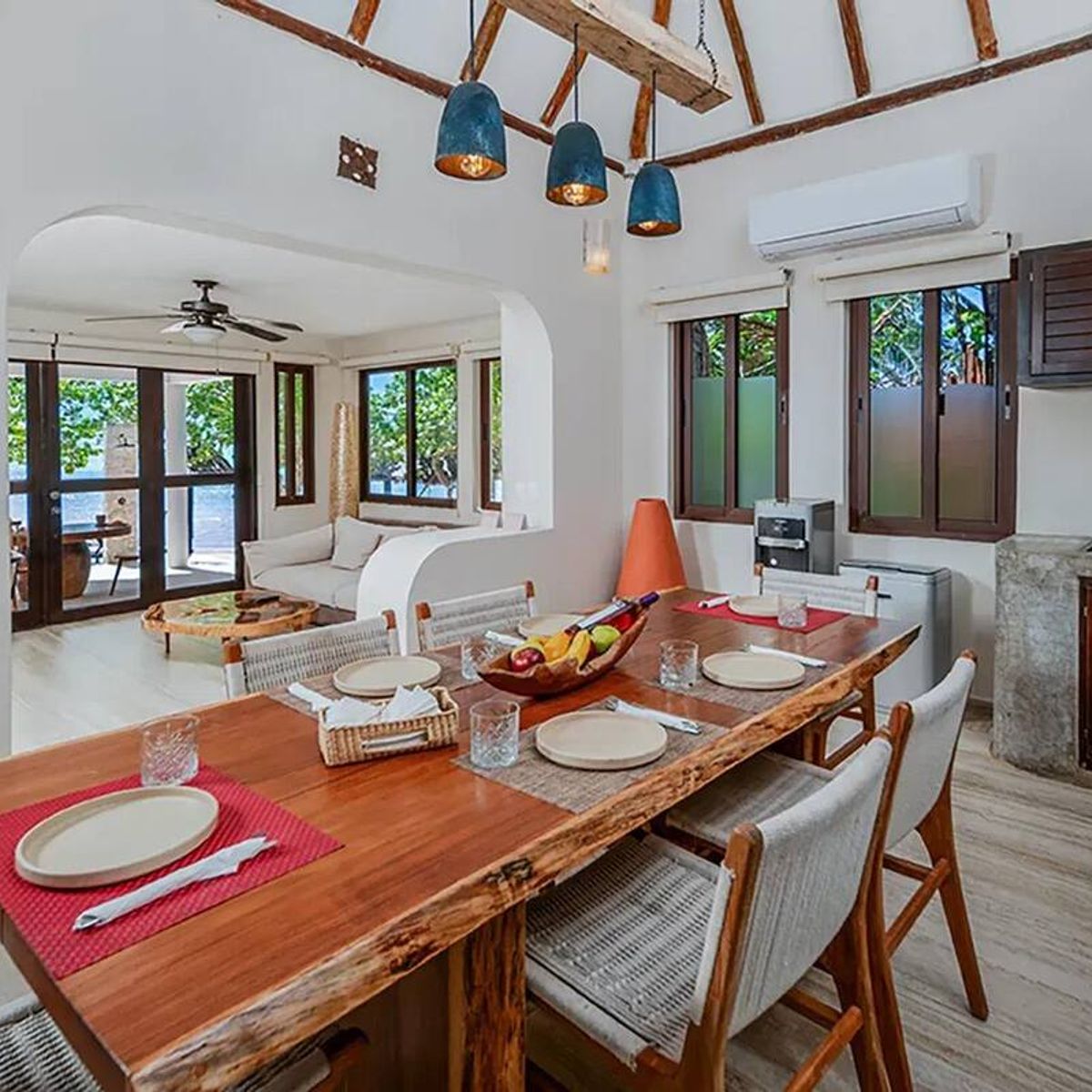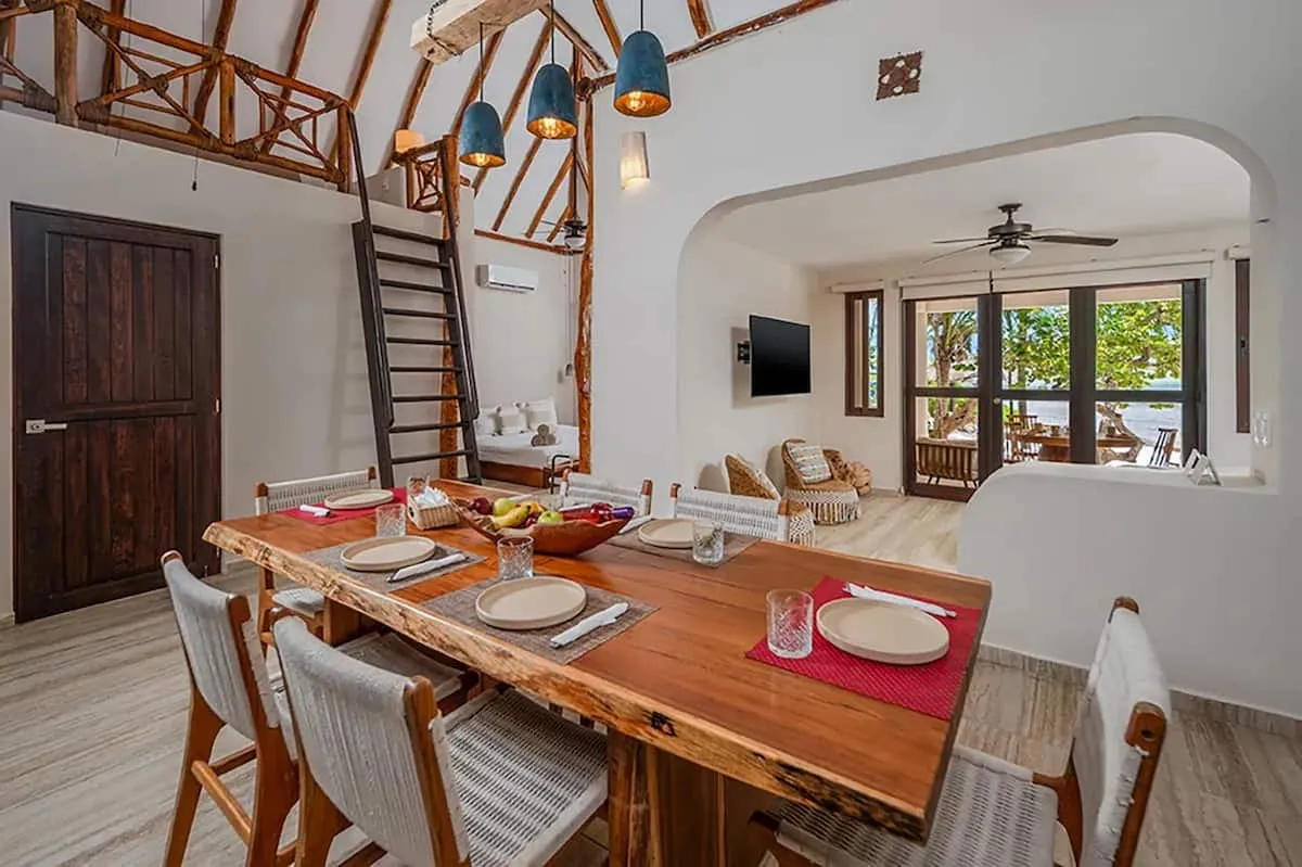 The interiors blend rustic charm with tropical simplicity, while large windows open to shaded terraces and soft sea breezes. Guests can unwind by the shared pool, paddle across the calm bay in complimentary kayaks, or simply enjoy the gentle rhythm of the Caribbean.