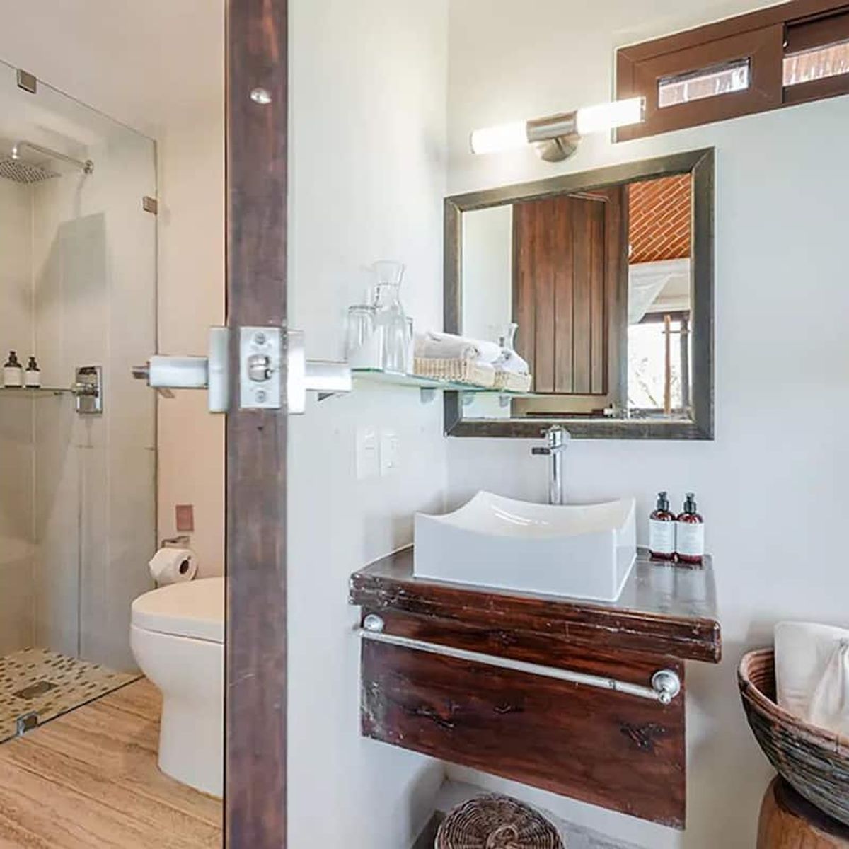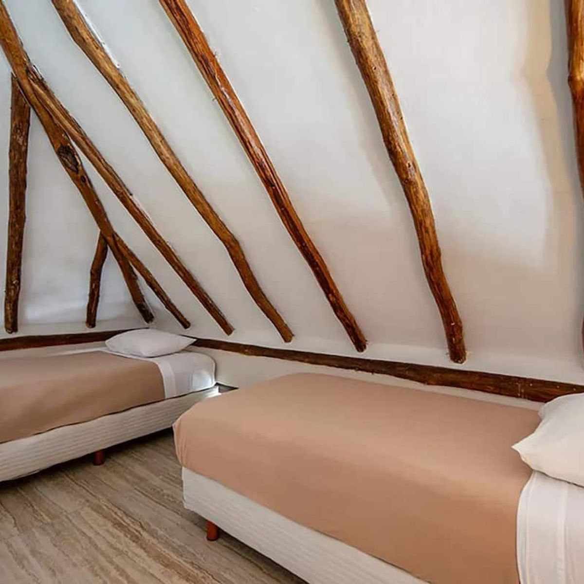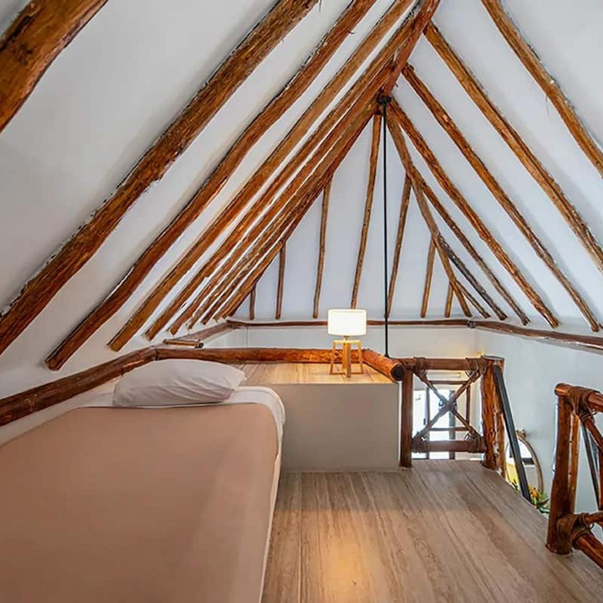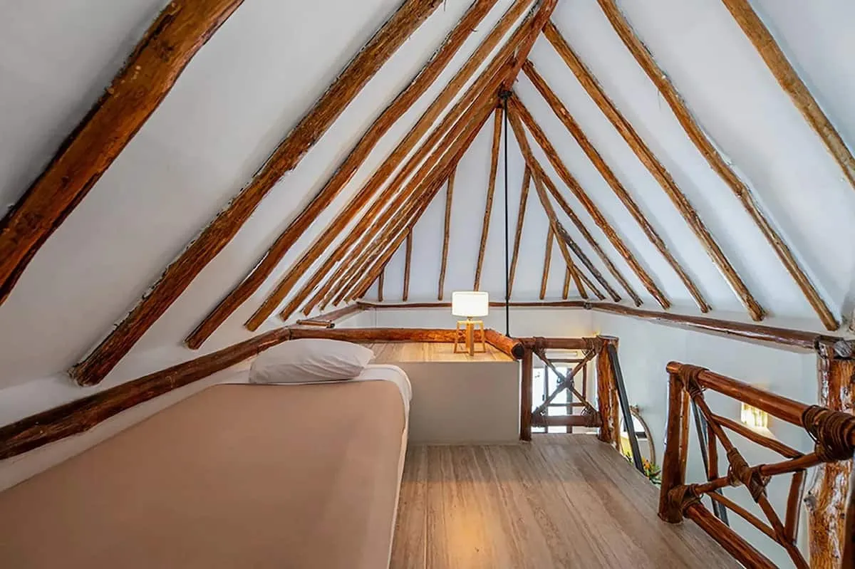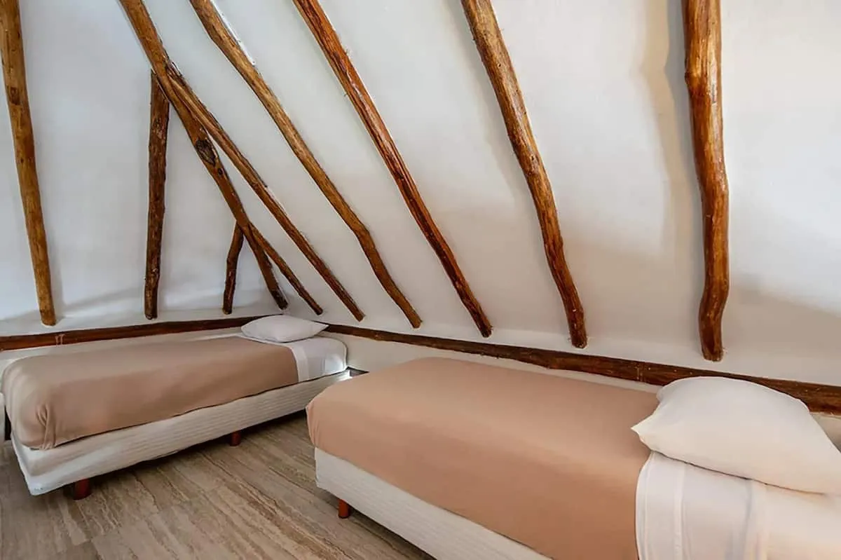 The interiors blend rustic charm with tropical simplicity, while large windows open to shaded terraces and soft sea breezes. Guests can unwind by the shared pool, paddle across the calm bay in complimentary kayaks, or simply enjoy the gentle rhythm of the Caribbean.