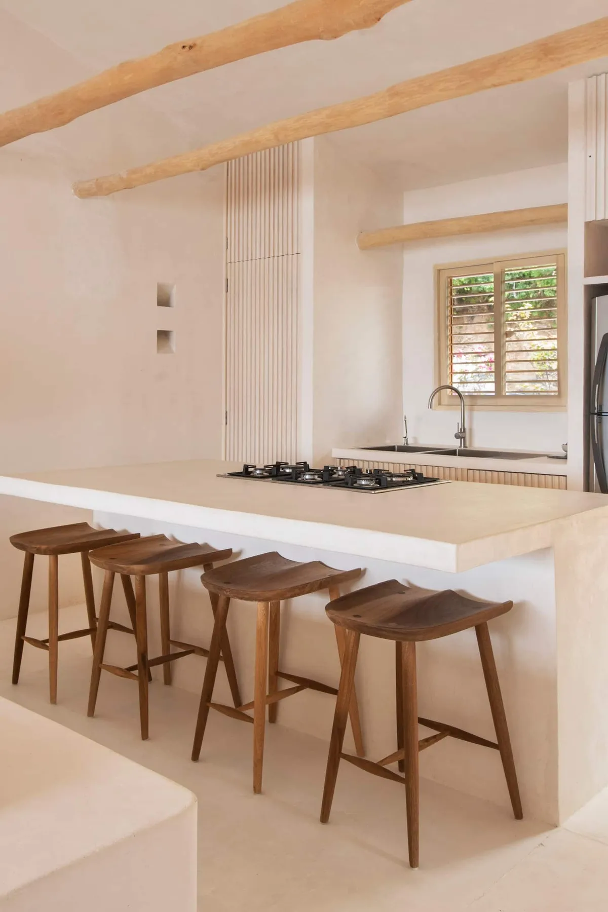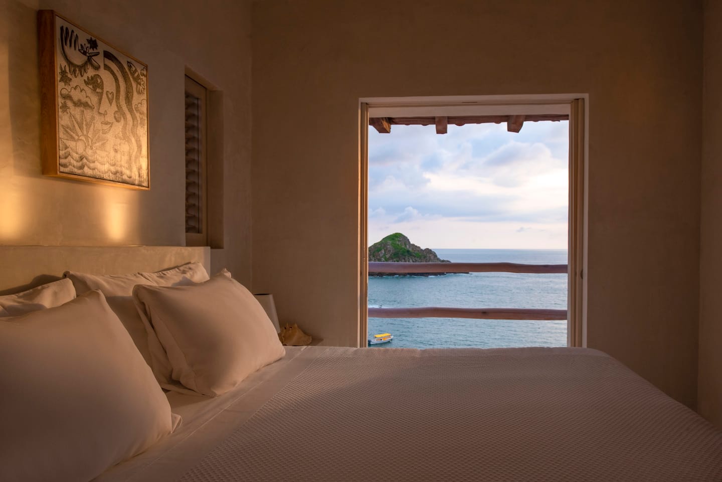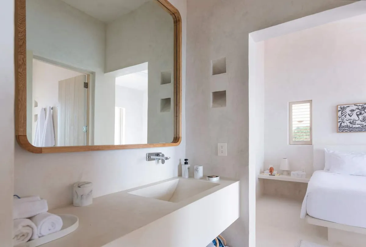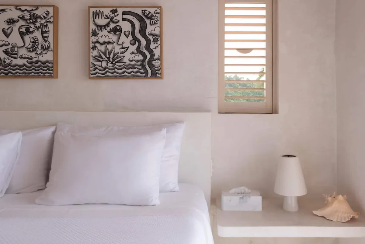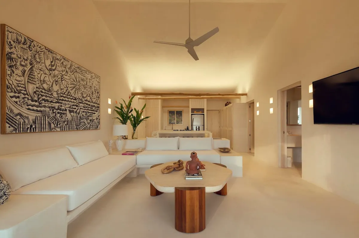 The fully equipped modern kitchen includes a refrigerator, stove, microwave, and tasteful tableware. Guests also receive access to the nearby Playa Rosa, located just minutes away.