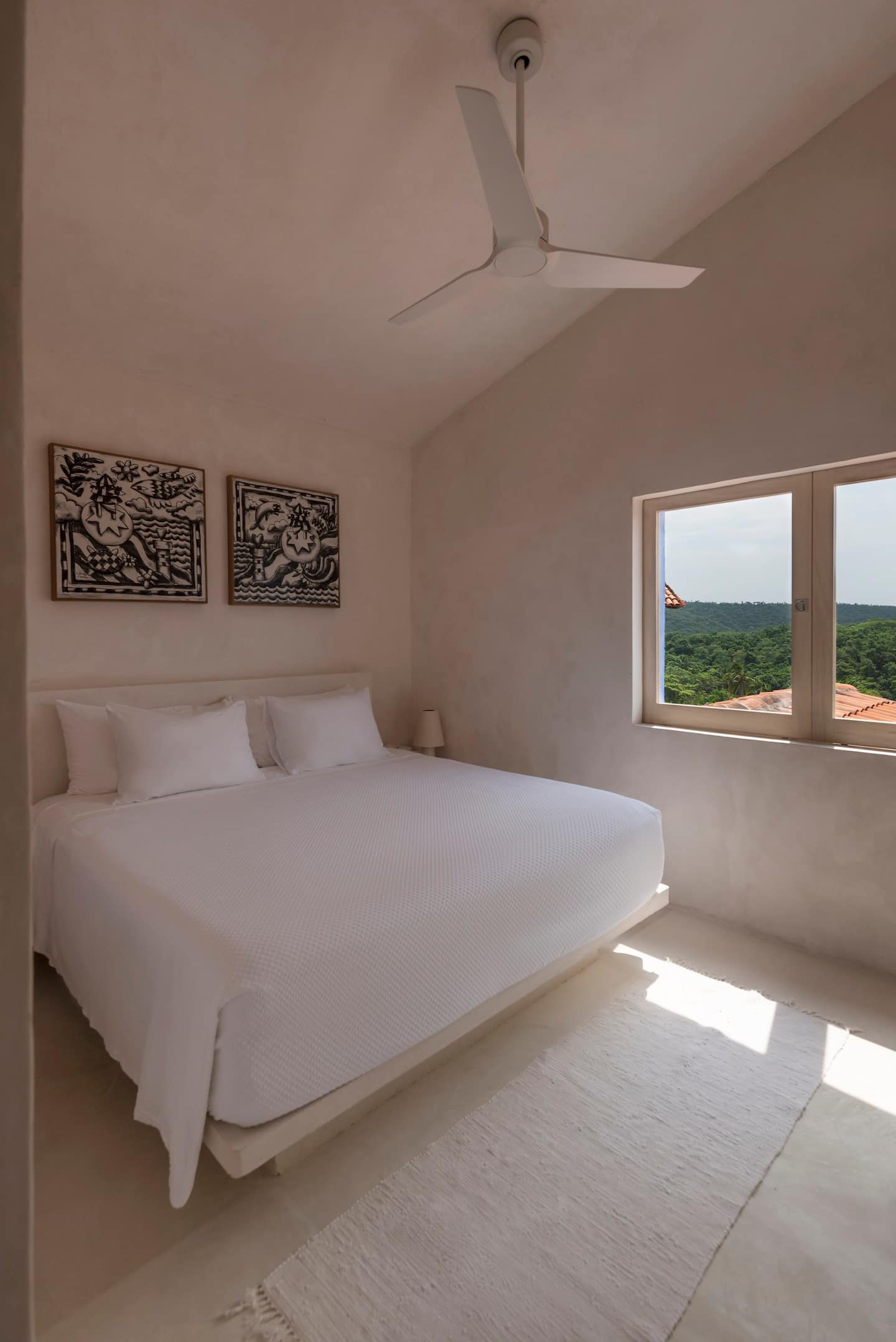 Designed for four adults, the residence features a refreshed interior, preserving the area's classic charm. It offers two private king suites, each with an ensuite bathroom. Stunning panoramic views are visible throughout, accessible from the main living room terrace and the primary suite's private balcony.