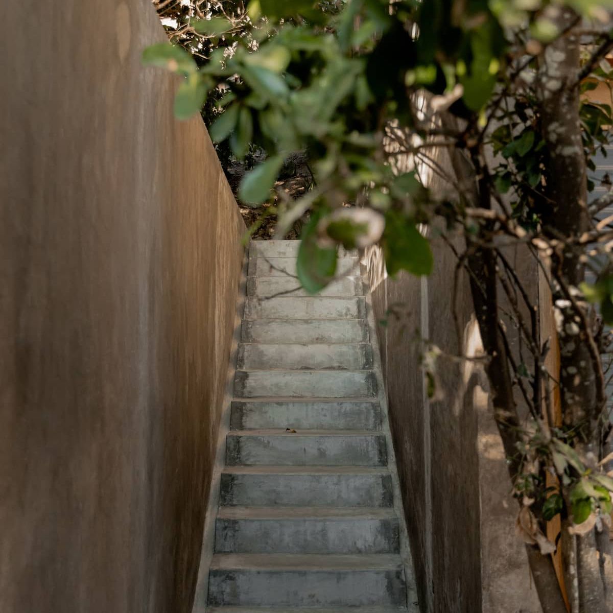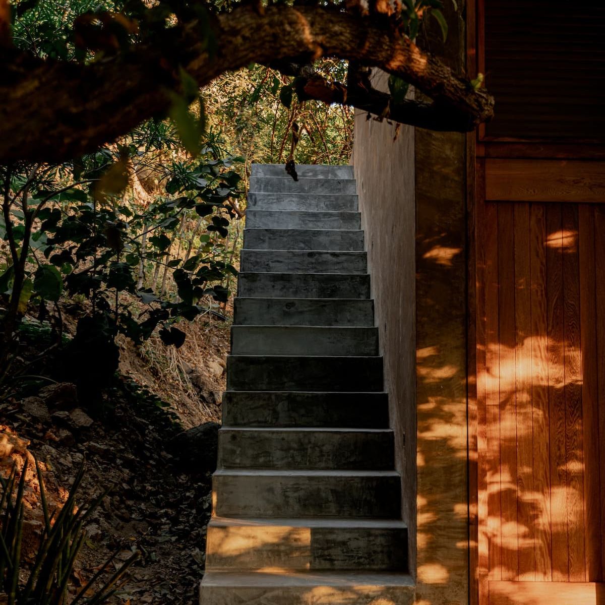 An exterior staircase leads to the second floor, where the bedroom with a spectacular view to the trees is located. It has a king size bed and a bathroom with hot water.