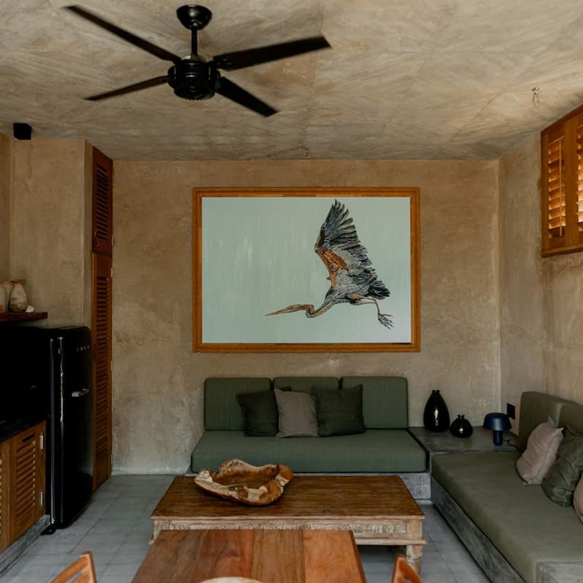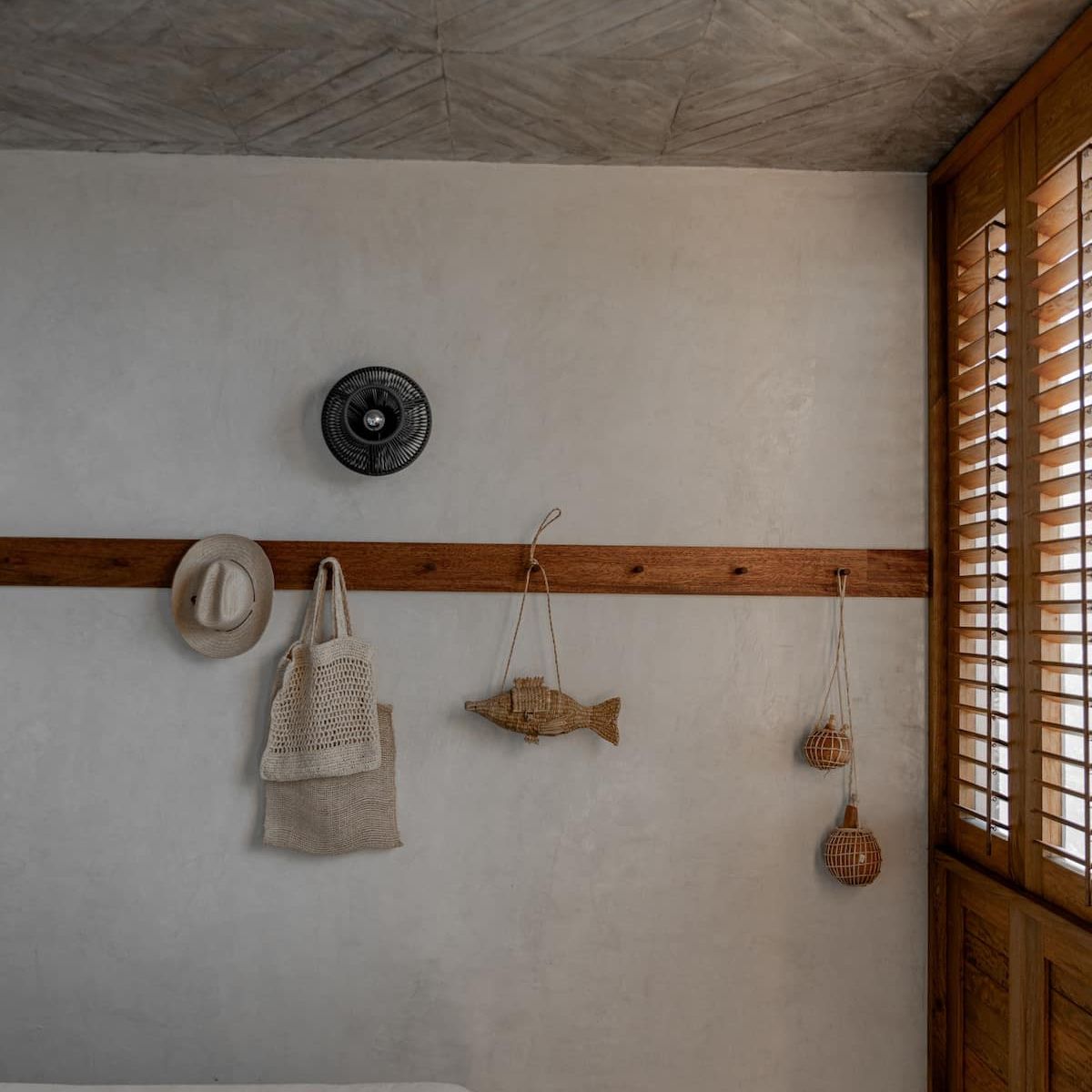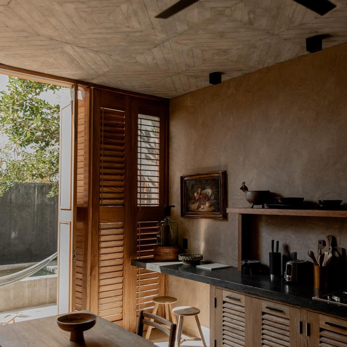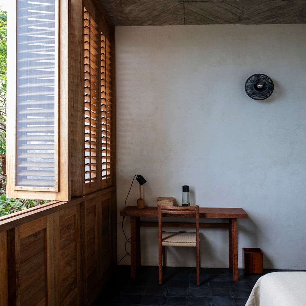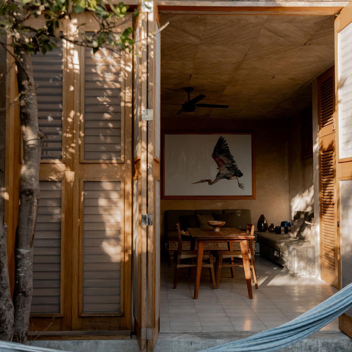 All interior spaces have a ceiling and a floor fan and mosquito nets on all doors and windows with wooden shutters.