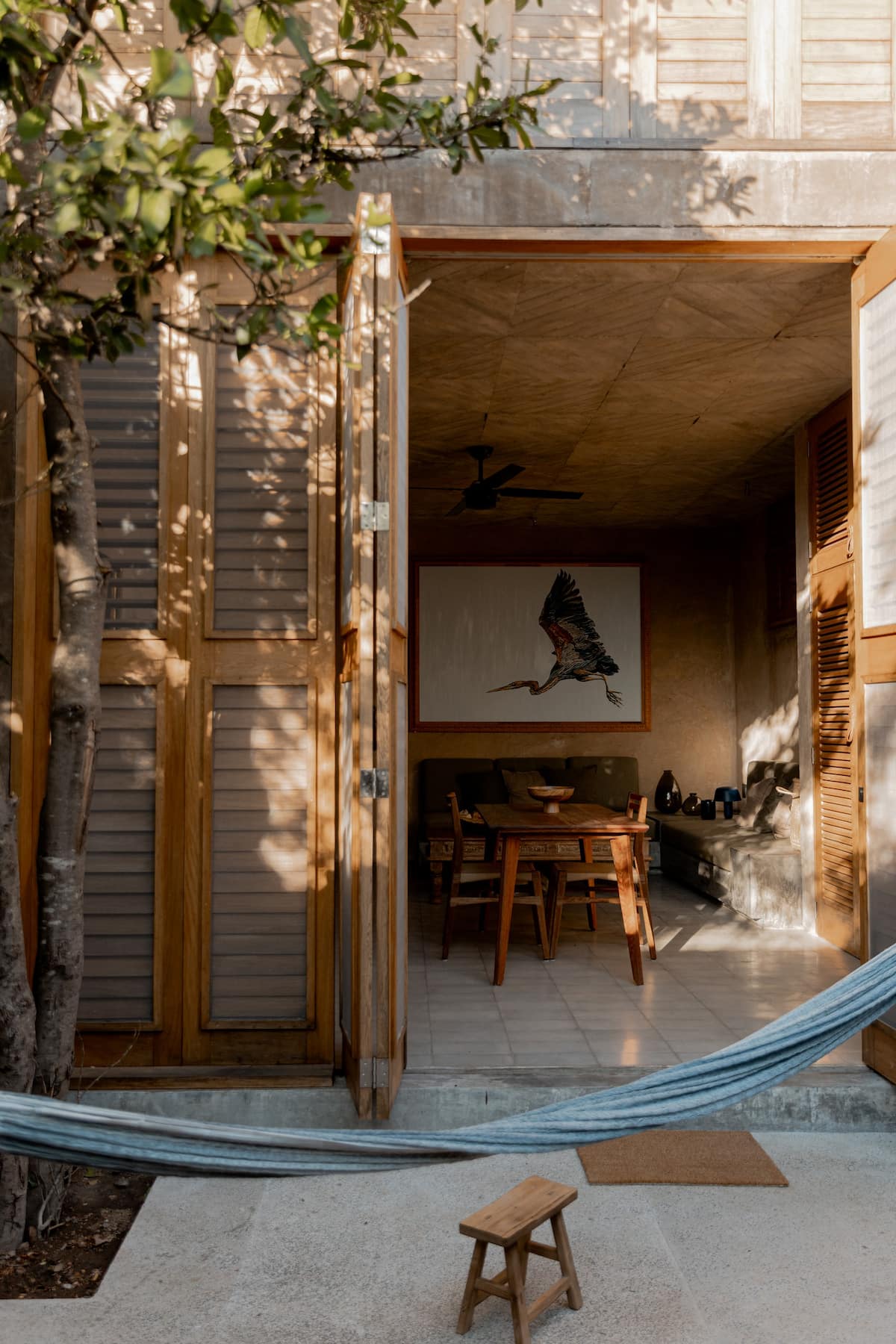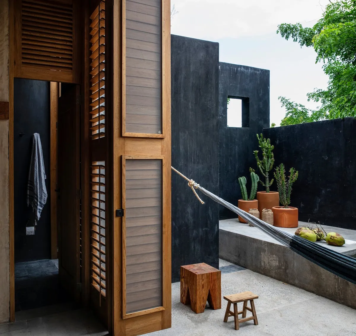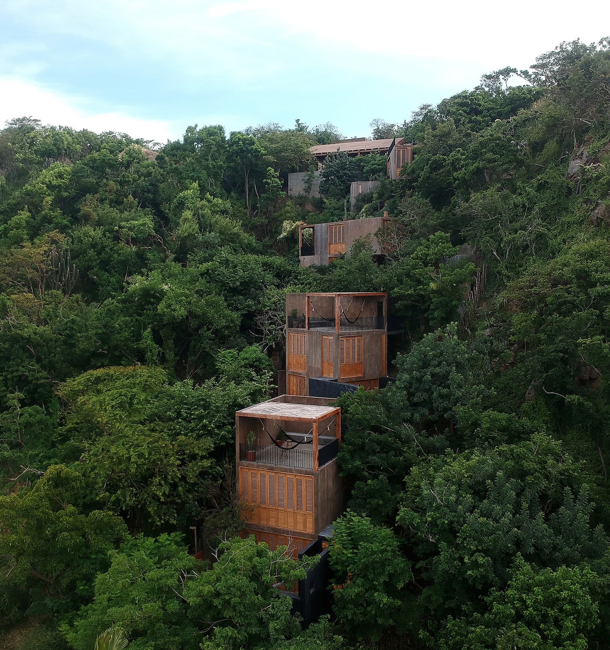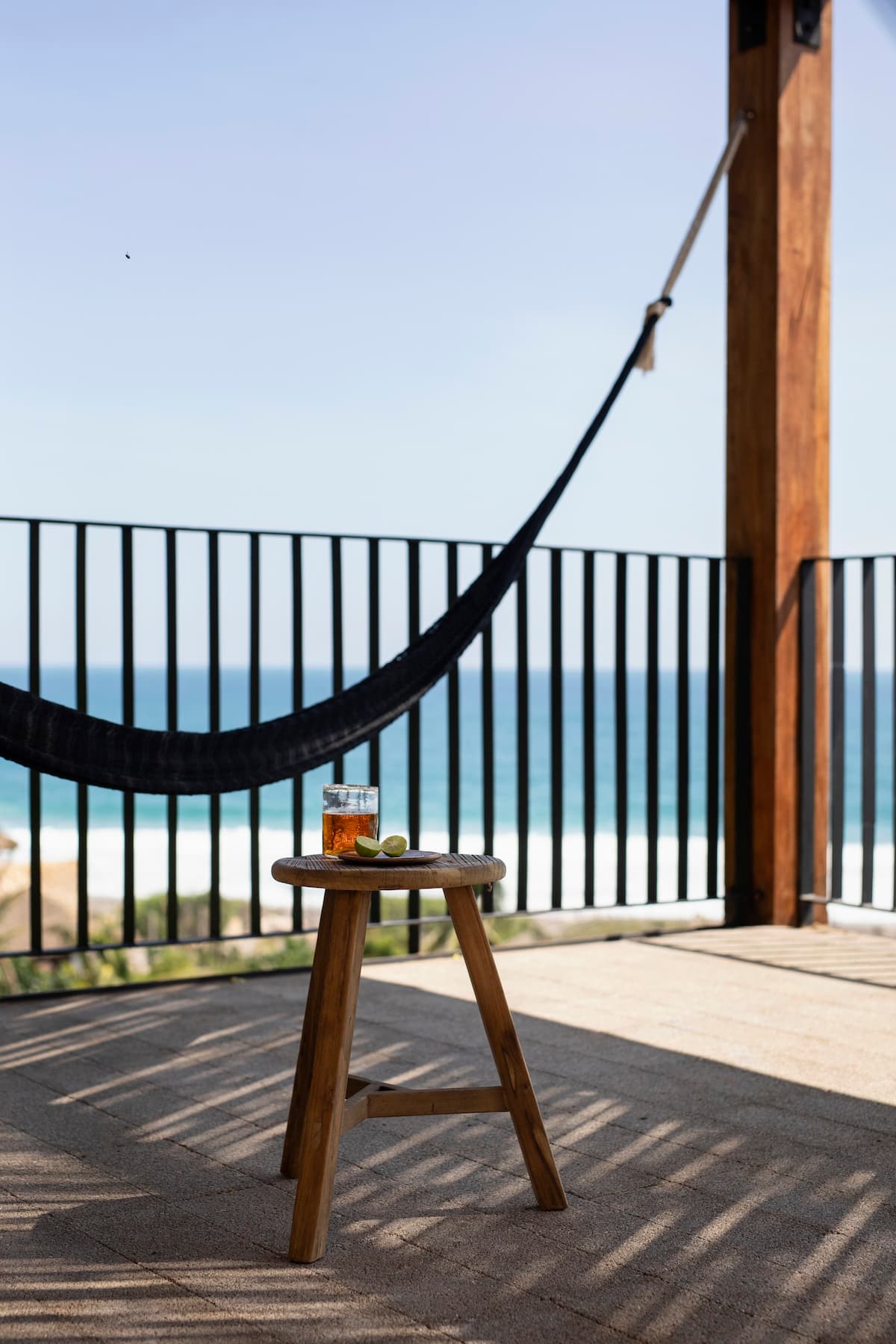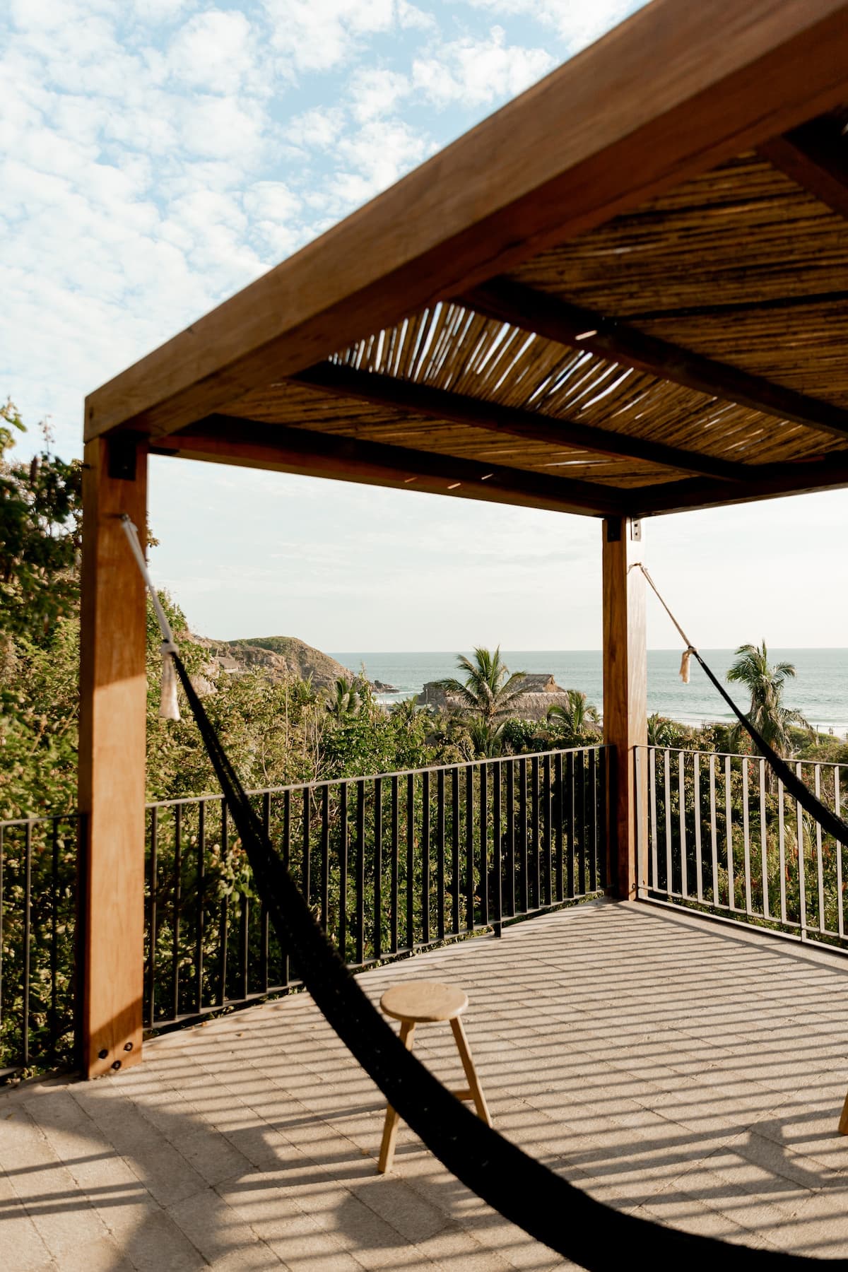 The external staircase continues to the third floor, where there is a terrace with panoramic views of Mermejita beach, a shaded space and two hammocks.