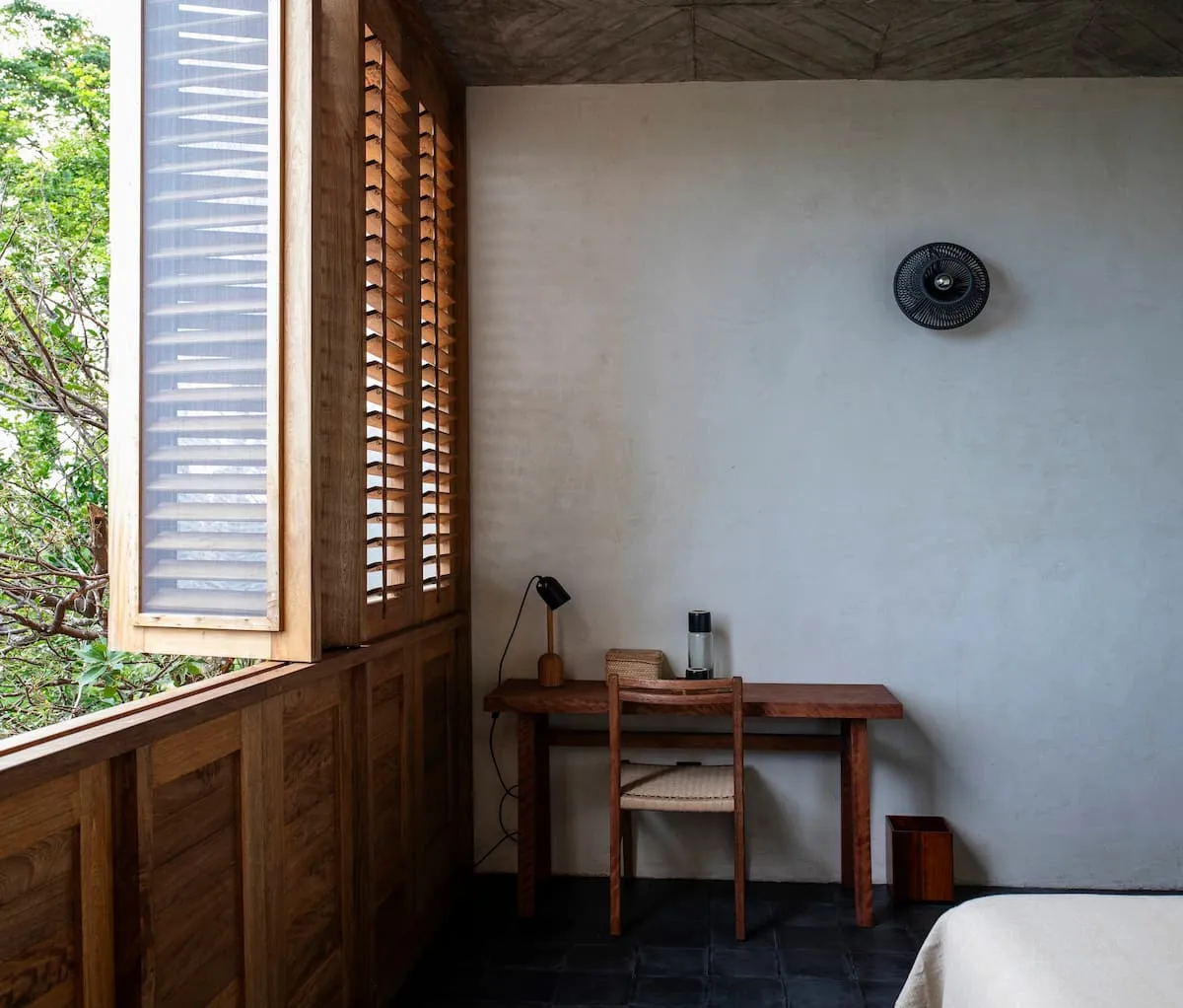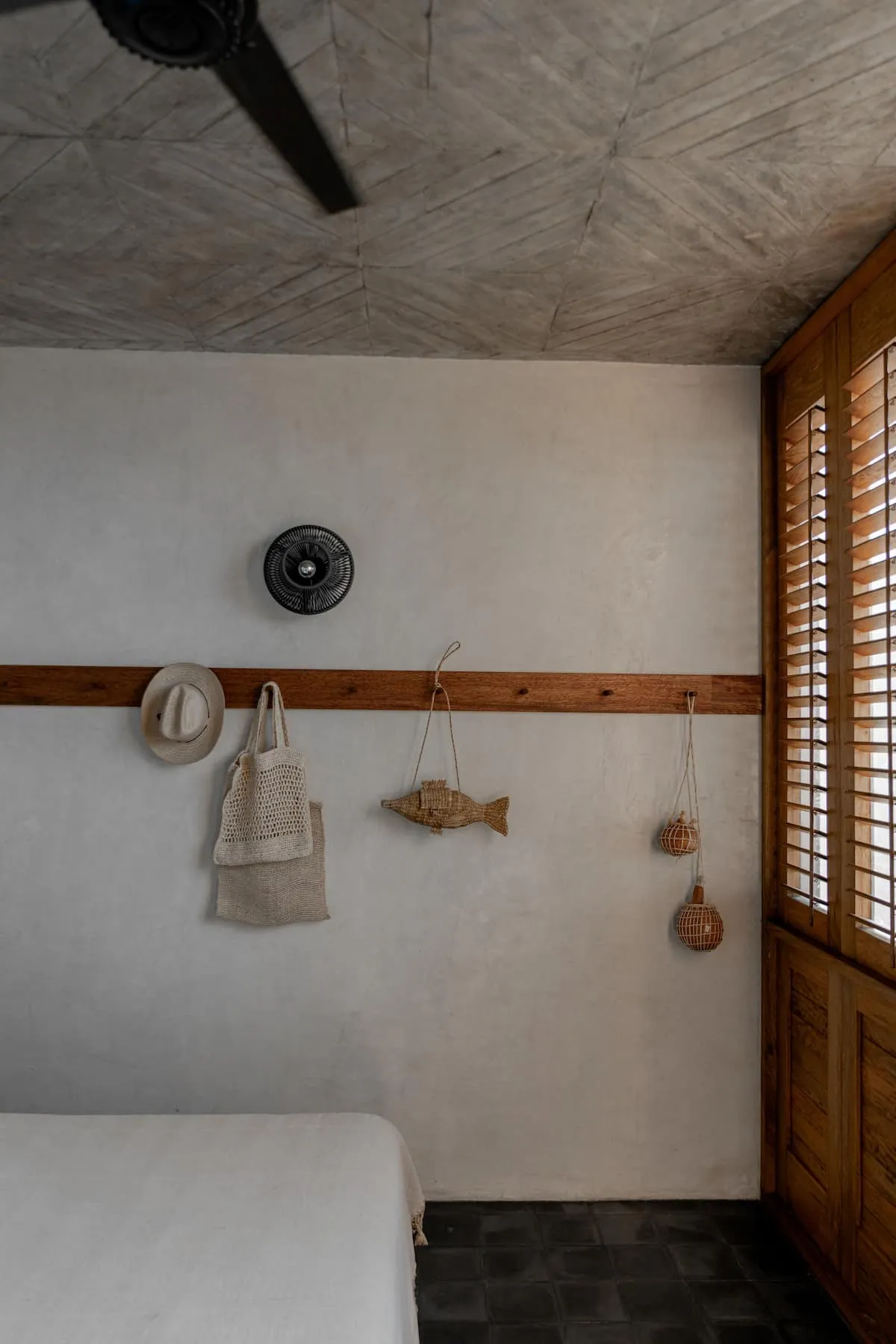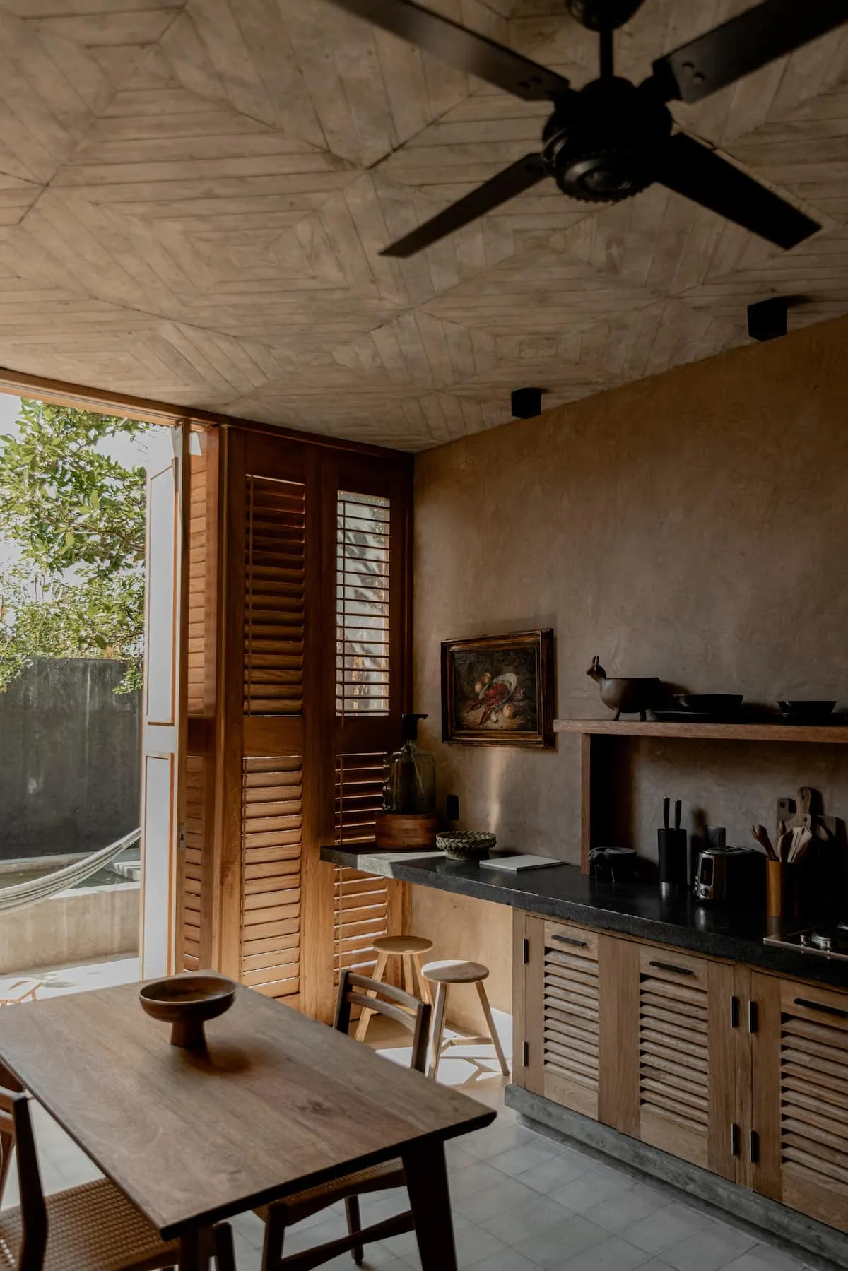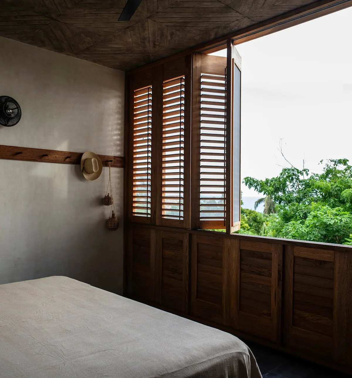 All interior spaces have a ceiling and a floor fan and mosquito nets on all doors and windows with wooden shutters.