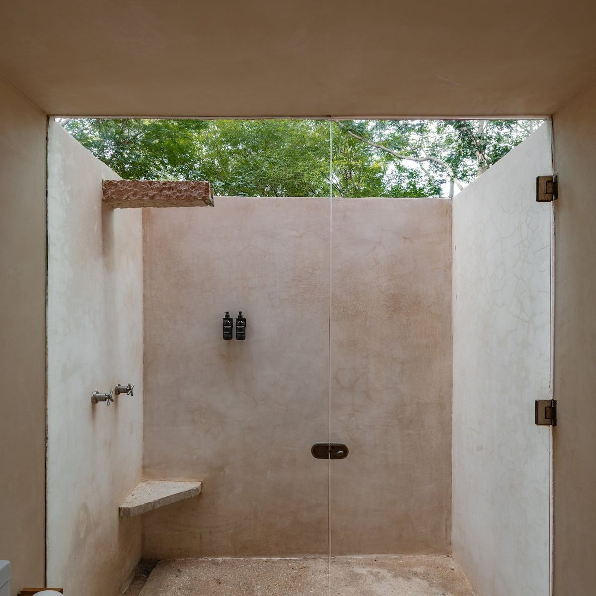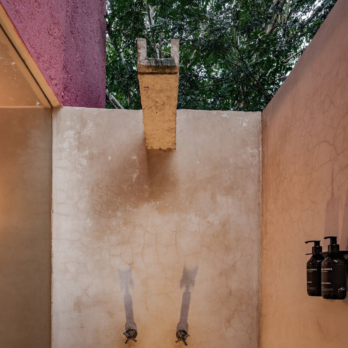 The bathroom invites relaxation with a unique open-ceiling shower, where you can gaze at the sky while enjoying natural, locally made toiletries.