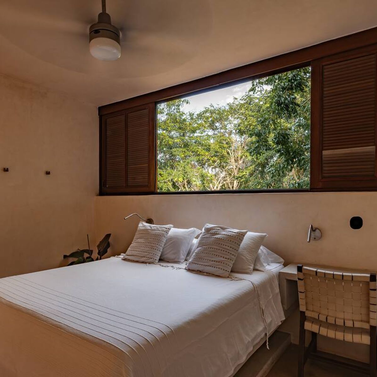 Sleep peacefully on a queen-size memory foam bed dressed in organic cotton linens. In the mornings, fold open the wide windows to welcome the sound of birdsong and sweeping views over the jungle canopy.
