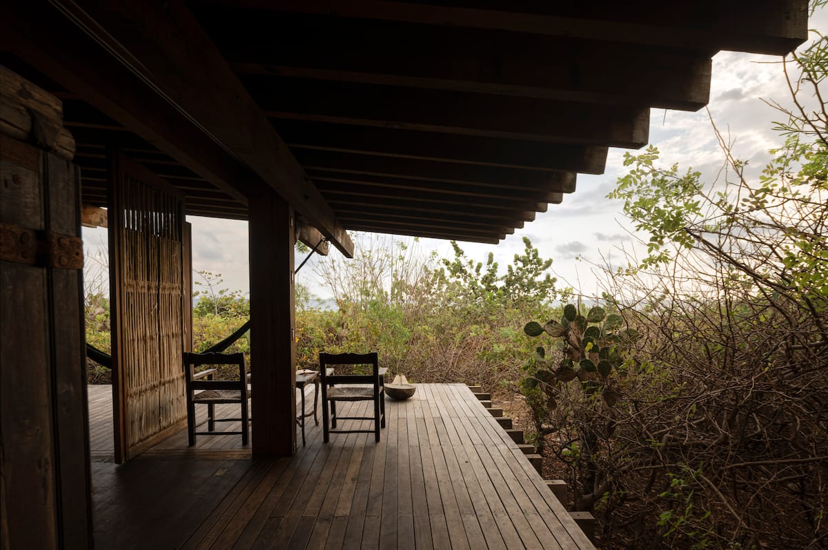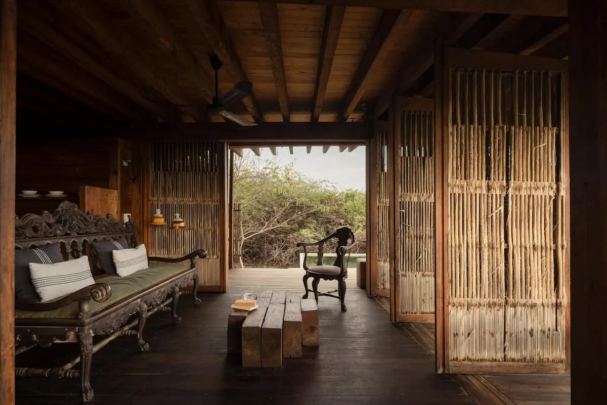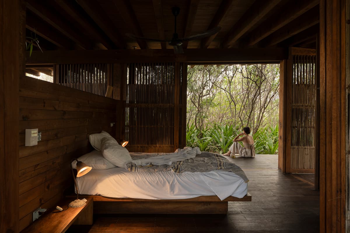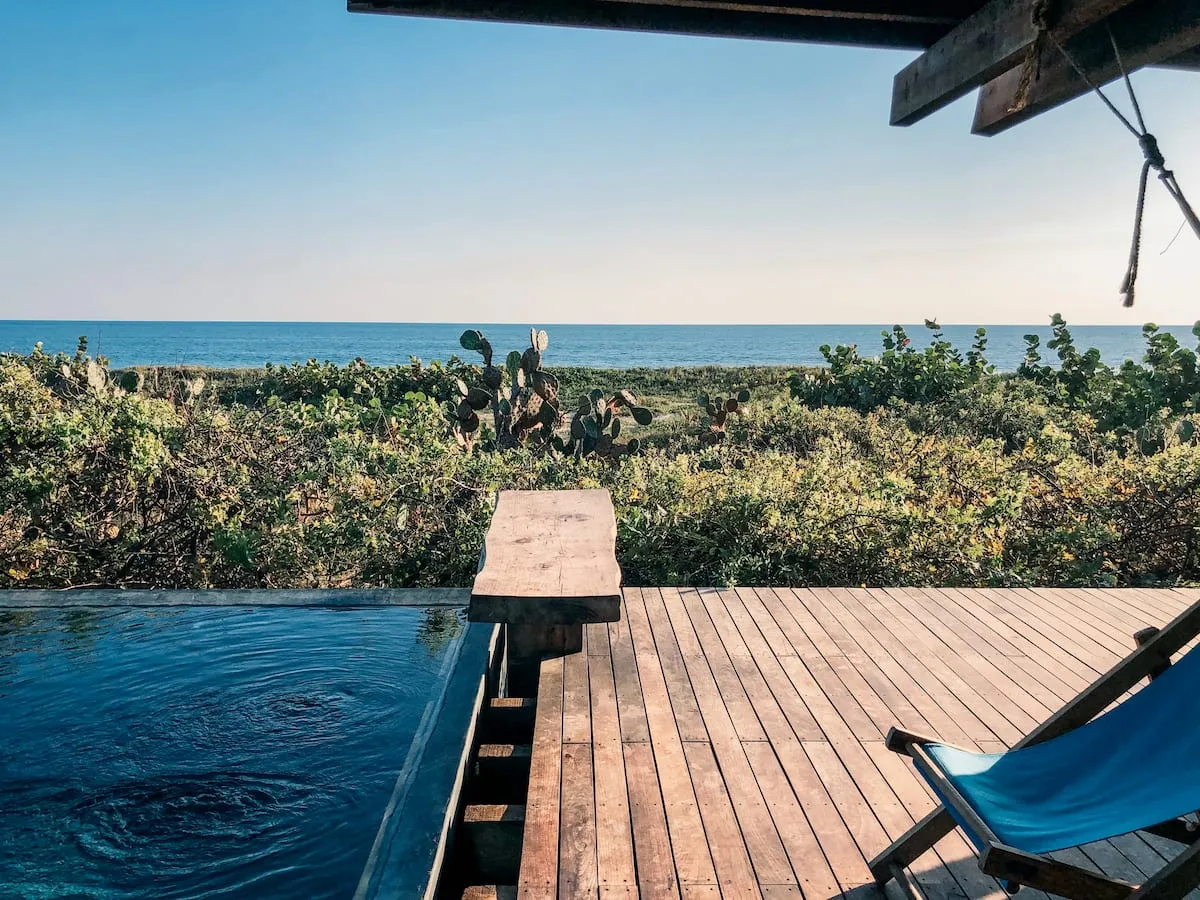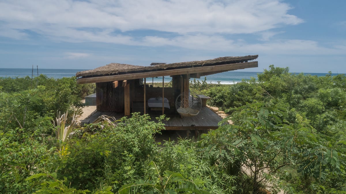 The one bedroom beach shack, just a few steps from the Pacific Ocean, has a spectacular view, equipped with a full kitchen, bathroom and shower al fresco and a private Pool. The cabin is a wooden box mounted on a platform slightly separated from the sand, at almost a meter above ground level, its sliding doors of palm wood open completely to allow the breeze to run freely and enjoy a spectacular 360 degree view of the ocean and the surrounding vegetation.