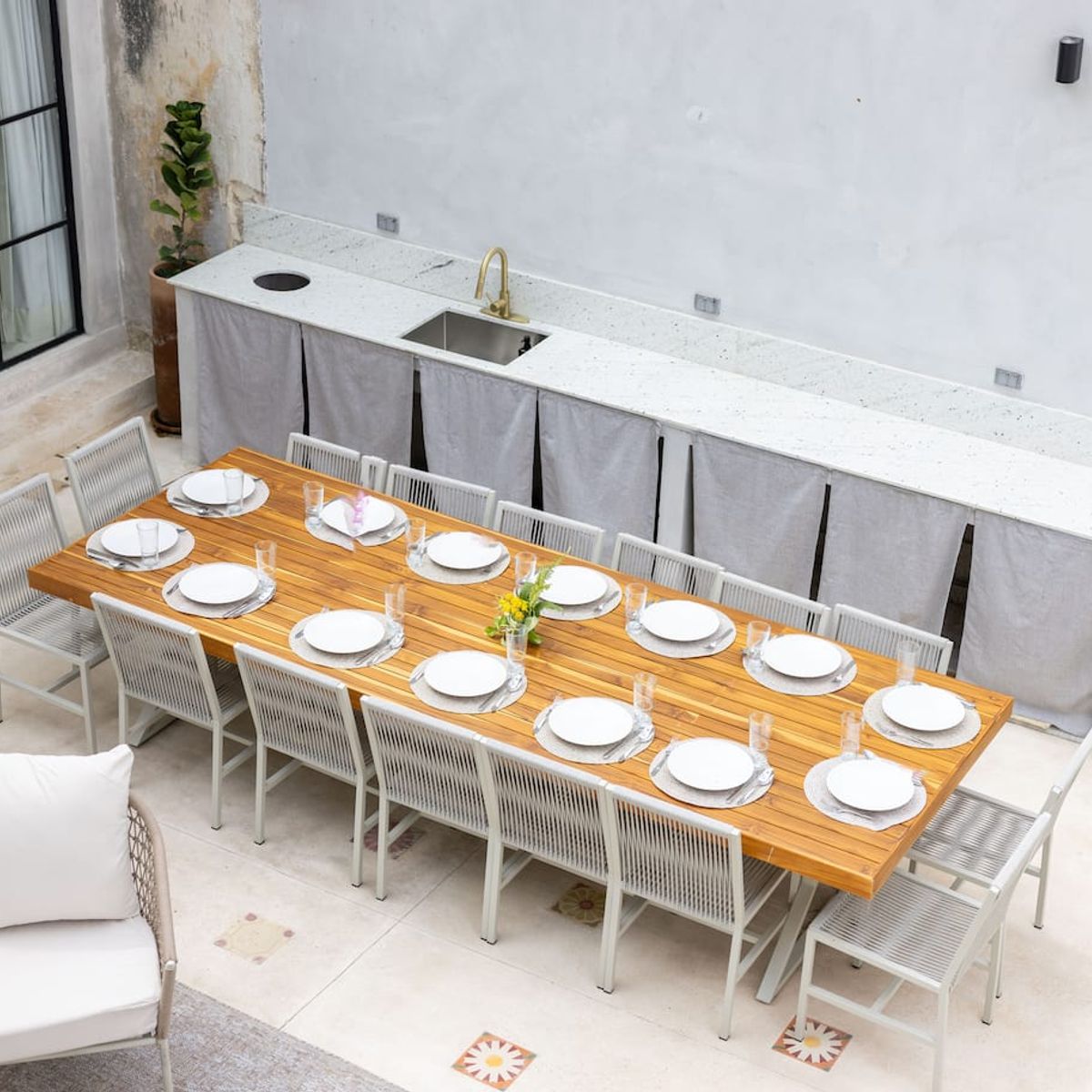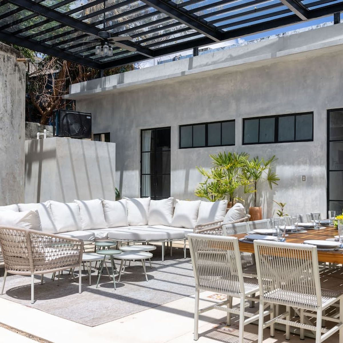 - Next to the living room is a covered outdoor dining area for 14 people.