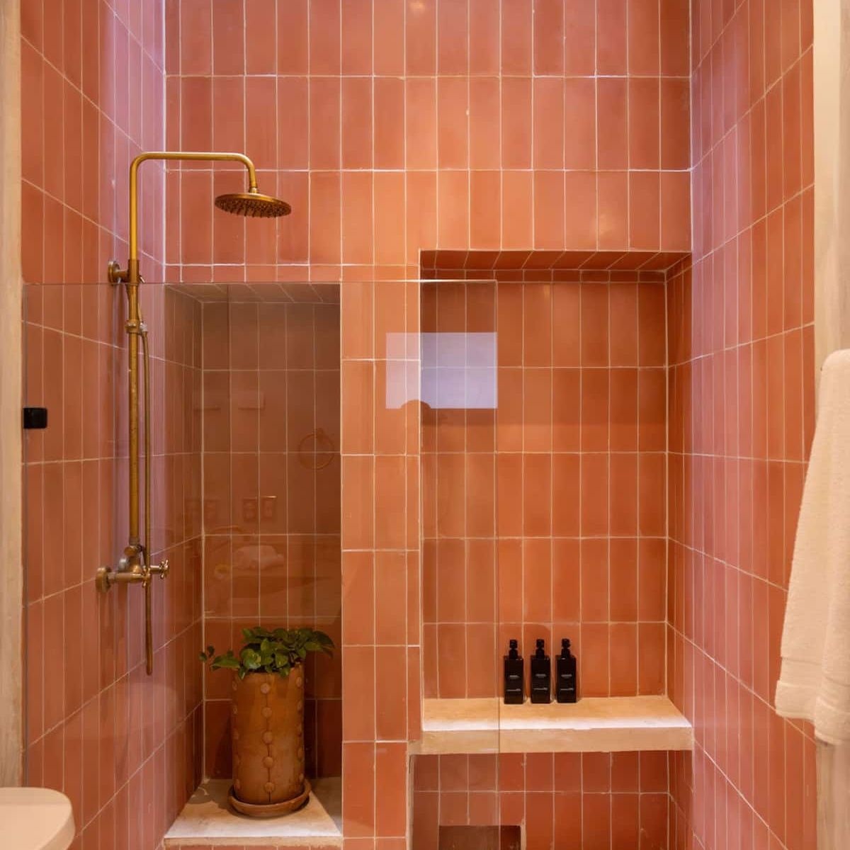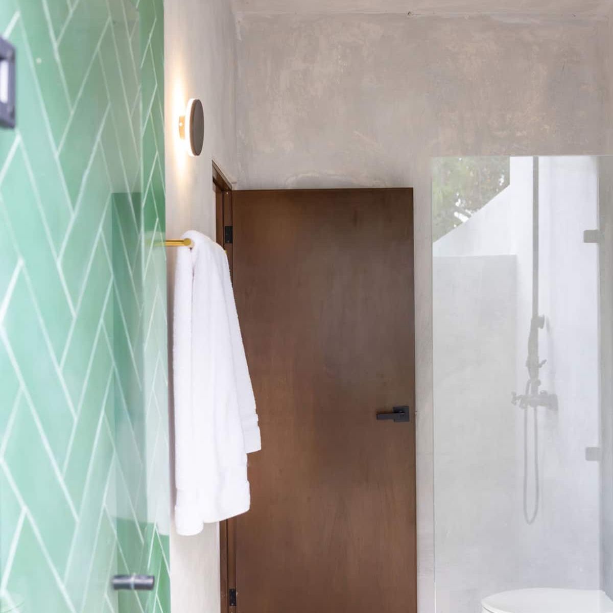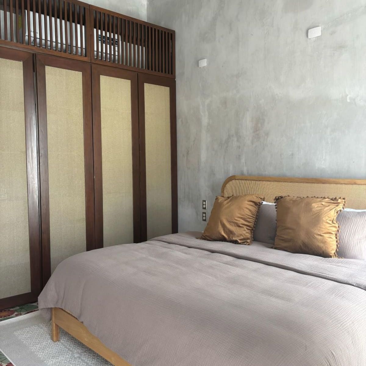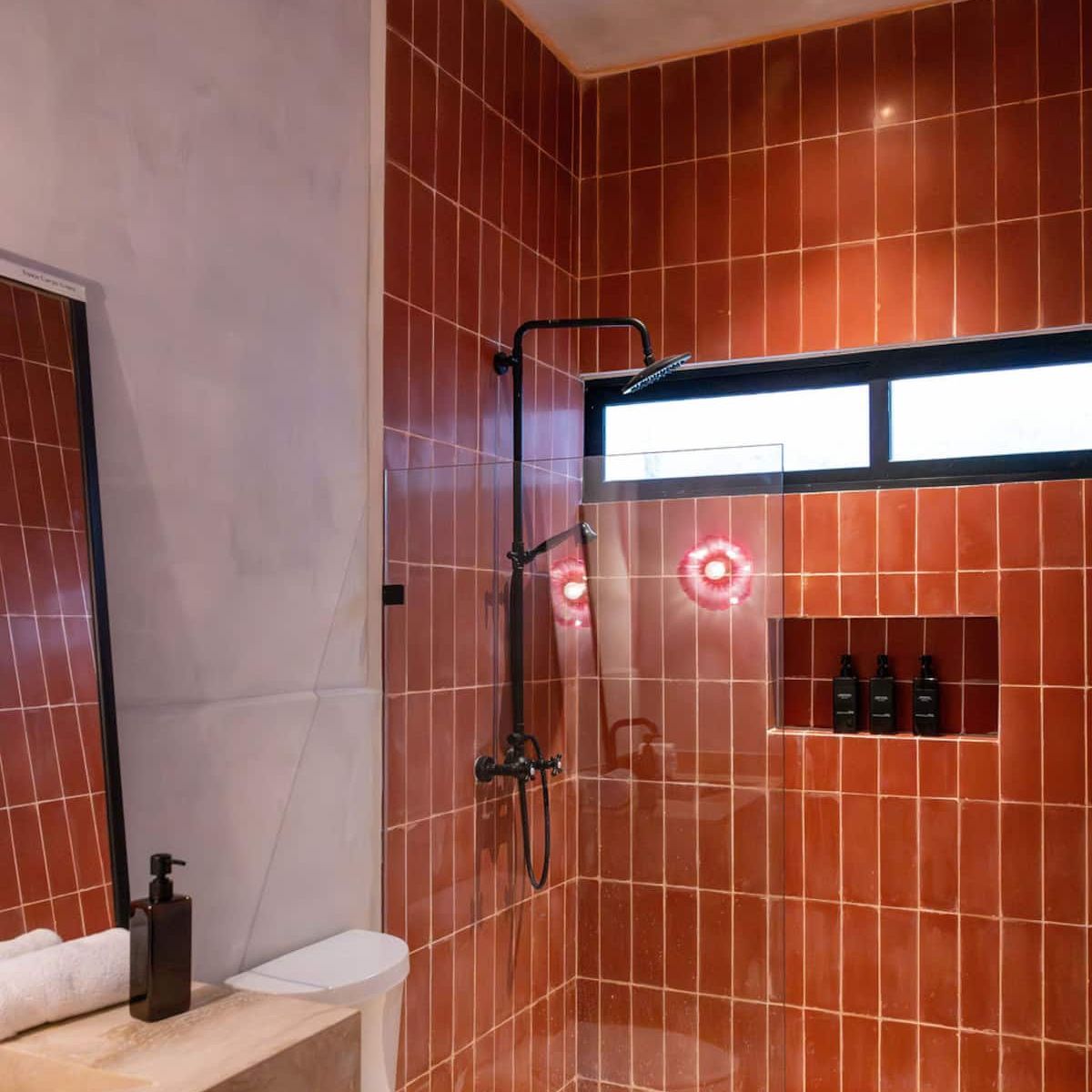- The master bedroom (1) has a king-size bed, a work desk, a private bathroom, an outdoor shower, and a private terrace with a dining area for four and a lounge chair.
