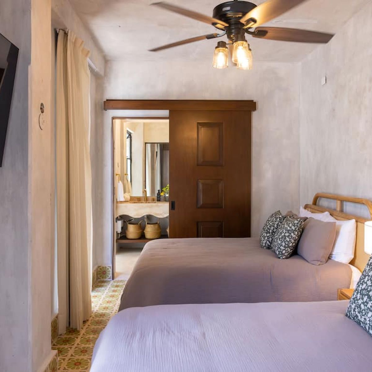 - Bedroom 3 has two queen-size beds and a private bathroom.