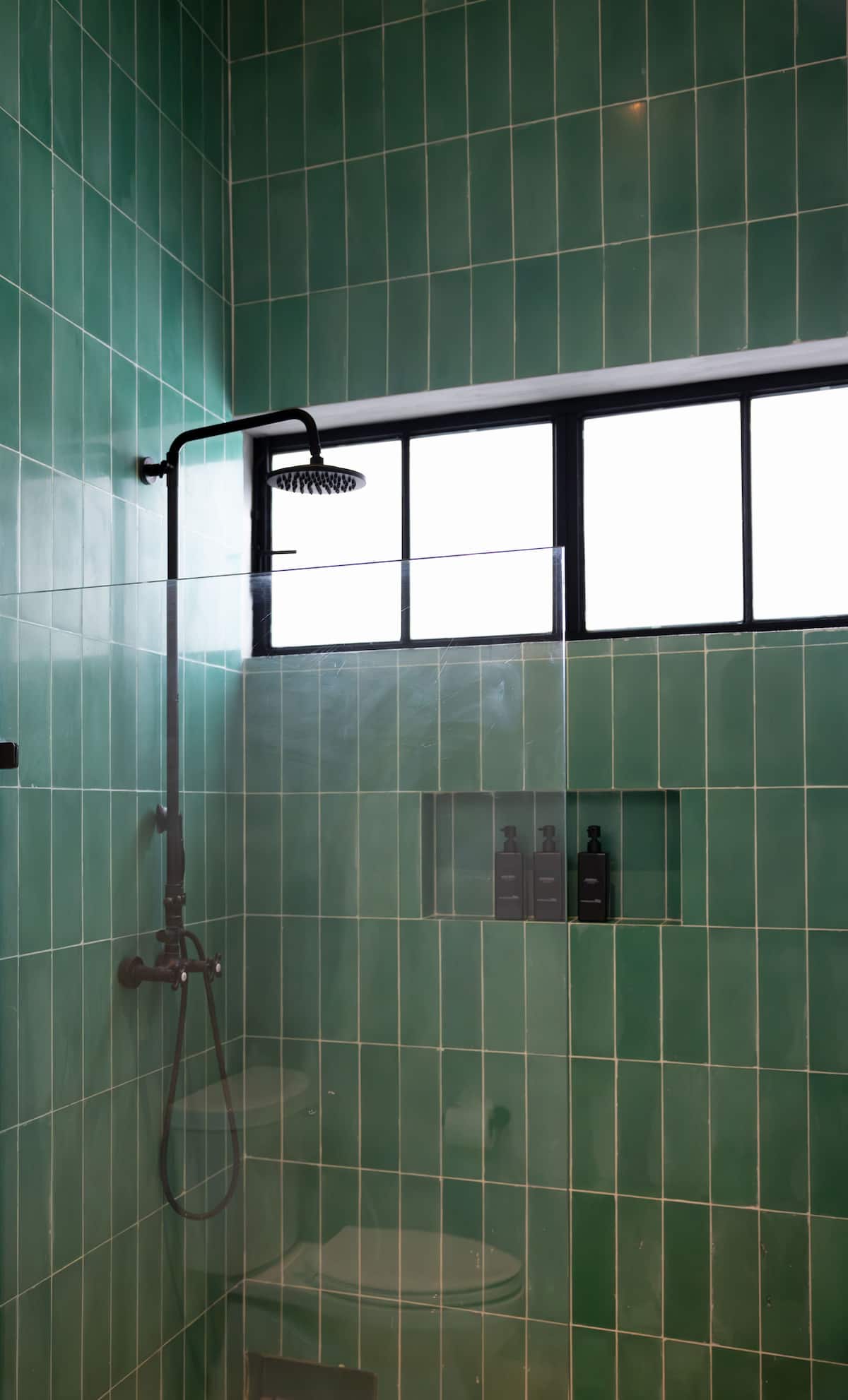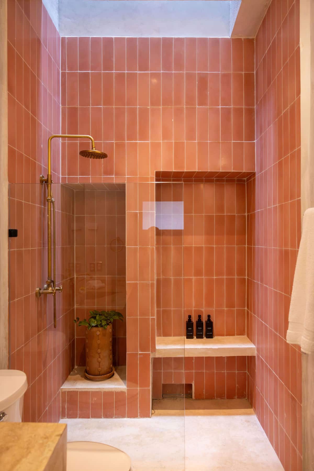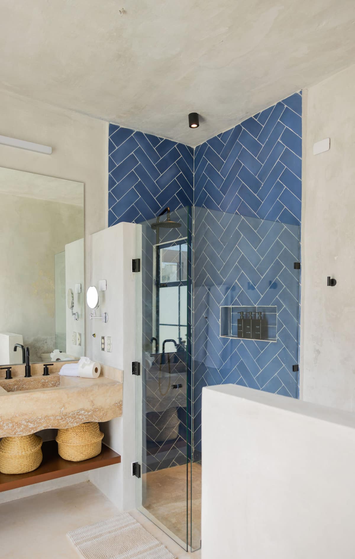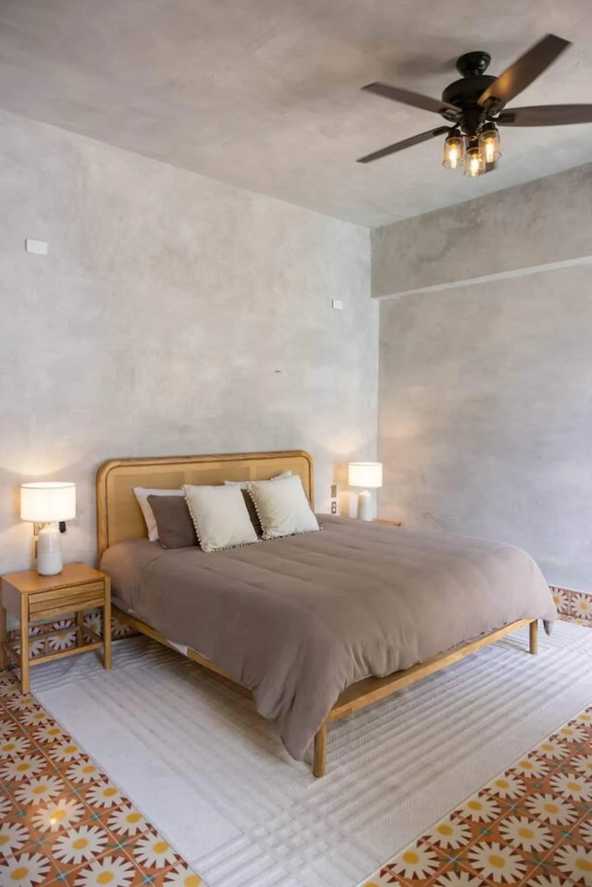 - The master bedroom (1) has a king-size bed, a work desk, a private bathroom, an outdoor shower, and a private terrace with a dining area for four and a lounge chair.