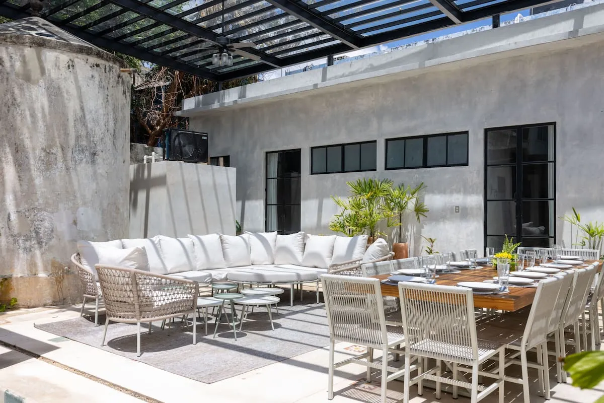 - Next to the living room is a covered outdoor dining area for 14 people.