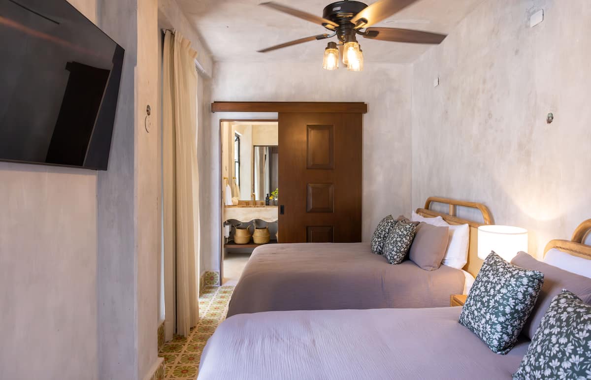 - Bedroom 3 has two queen-size beds and a private bathroom.