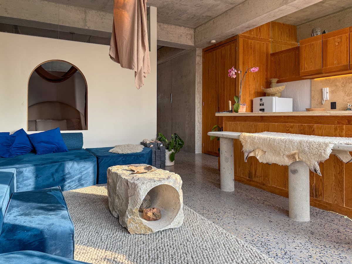 A bohemian, eclectic retreat where stone, wood, and sea-inspired details create an intimate, cozy atmosphere.