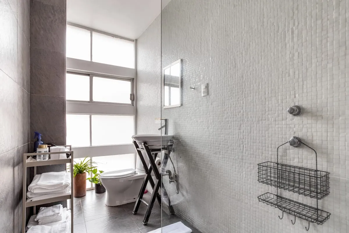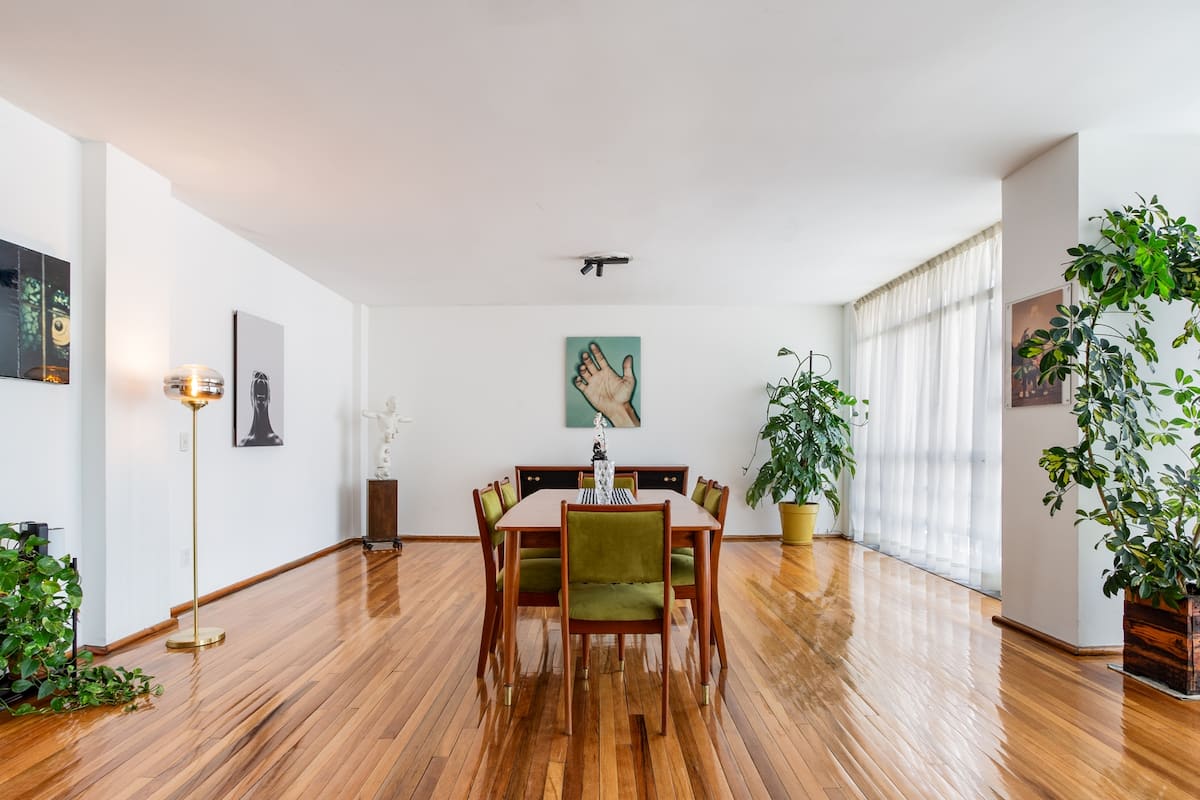 Gorgeous two-floor apartment with floor-to-ceiling windows and central spiral staircase leading to bedrooms on second level, perfect for groups and large families. The home is located is Colonia Escandon, a centrally located neighborhood minutes from the heart of Colonia Condesa and Colonia Roma. The first level includes a large living and dining room with kitchen.